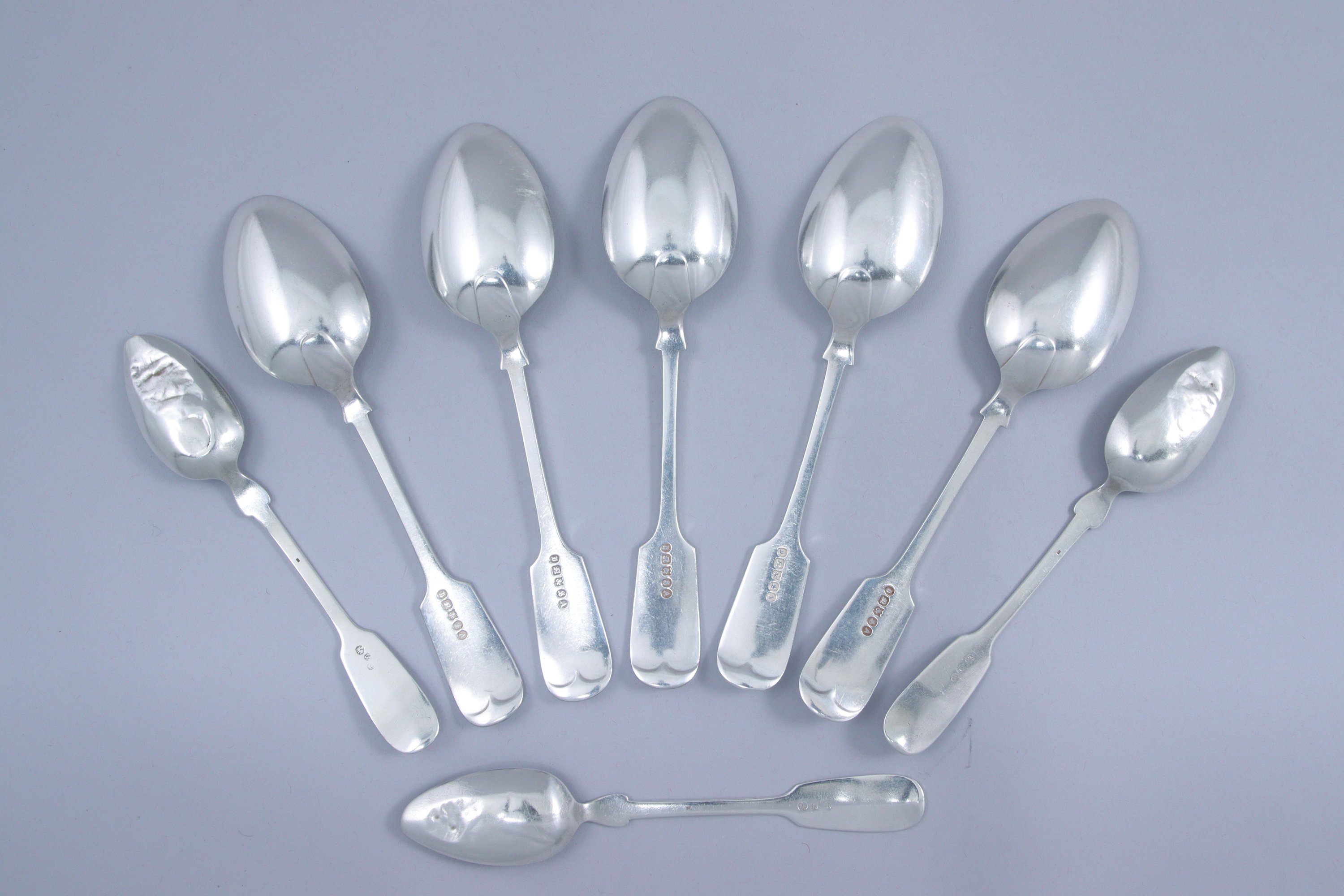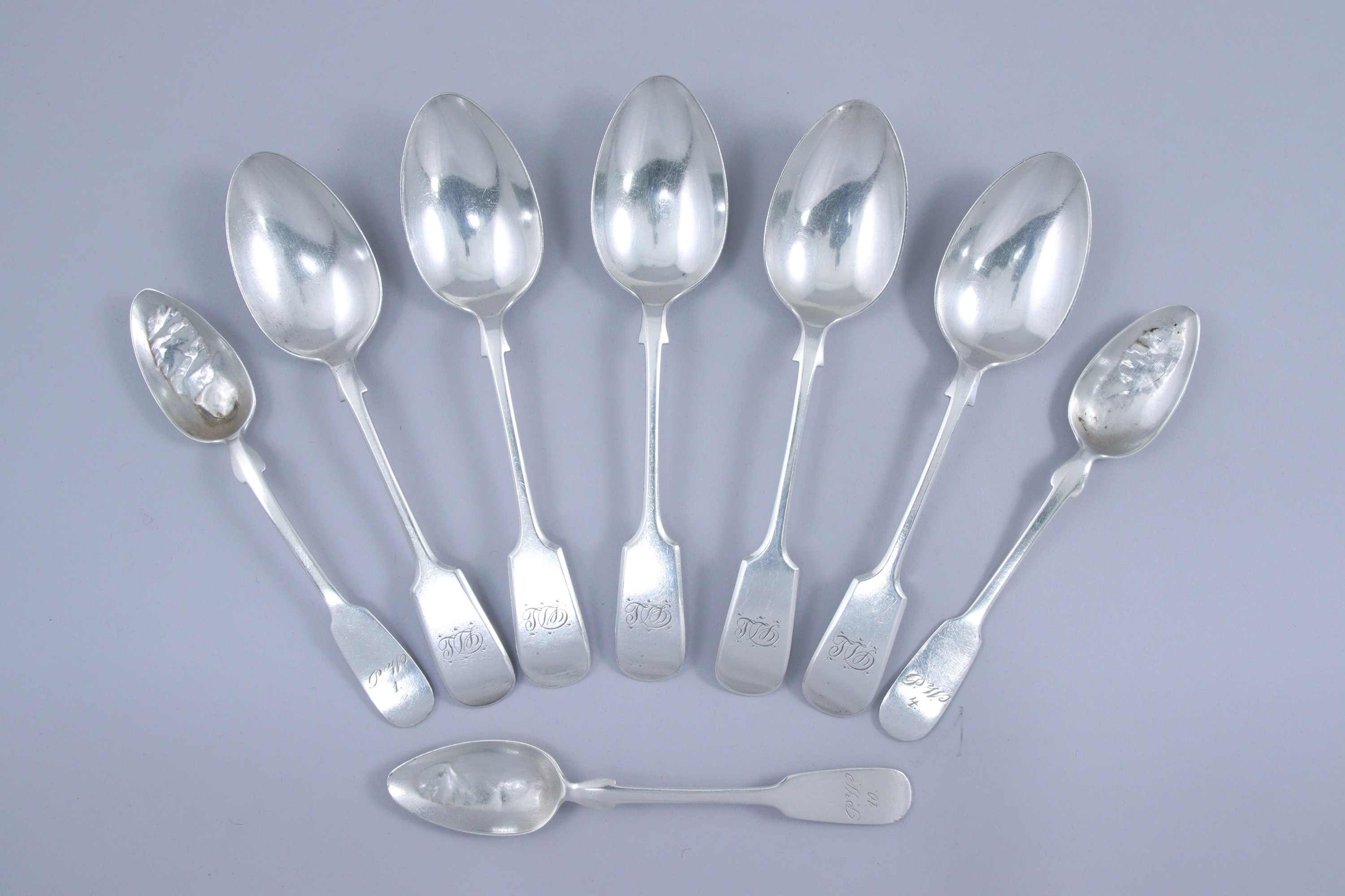 ANGLETERRE. RÉUNION de HUIT CUILLERS en argent modèle Uniplat comprenant CINQ CUILLERS à ENTREMETS en argent monogrammé "SDL", et trois CUILLERS à CAFÉ monogrammé "PW" .