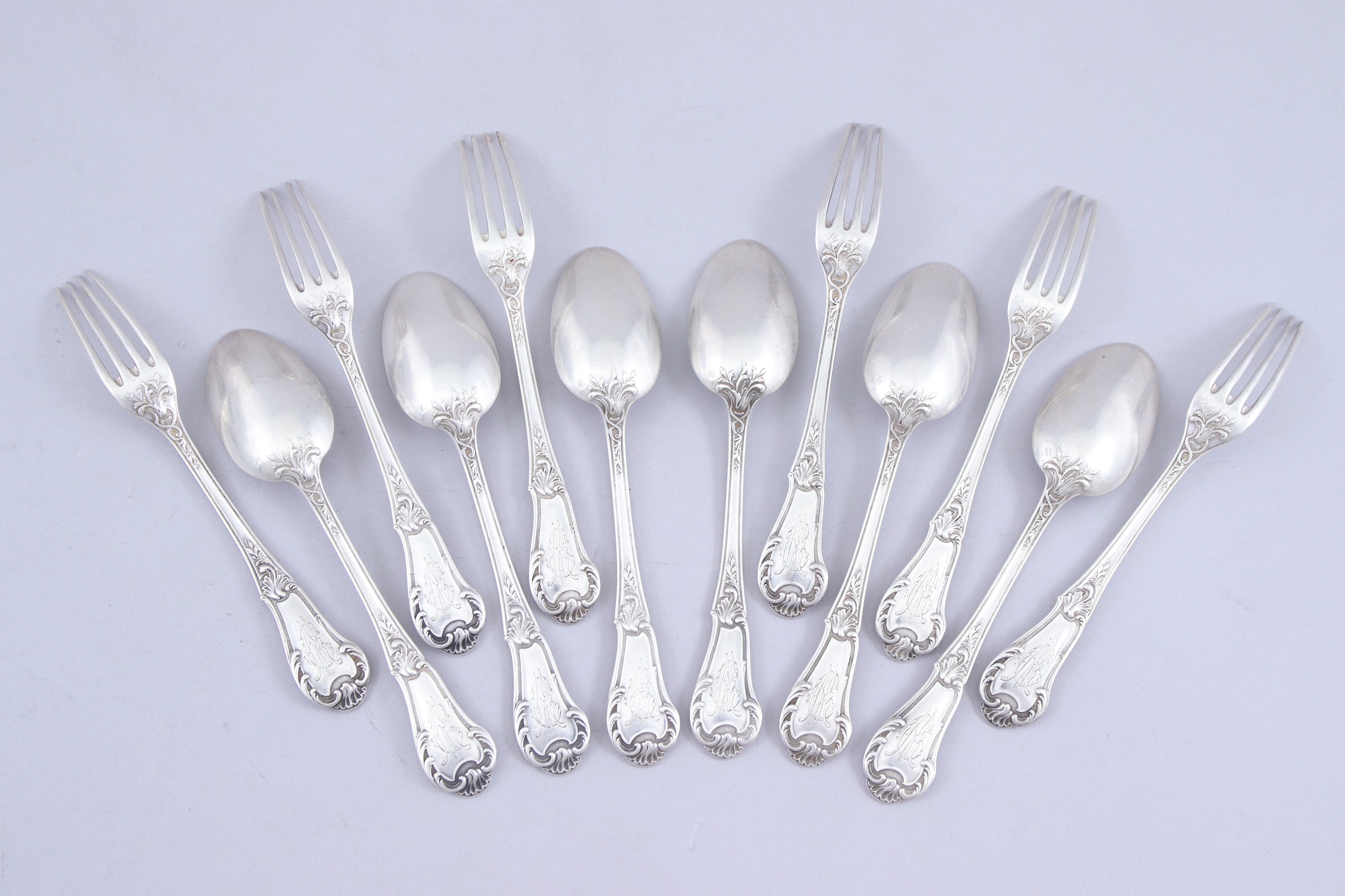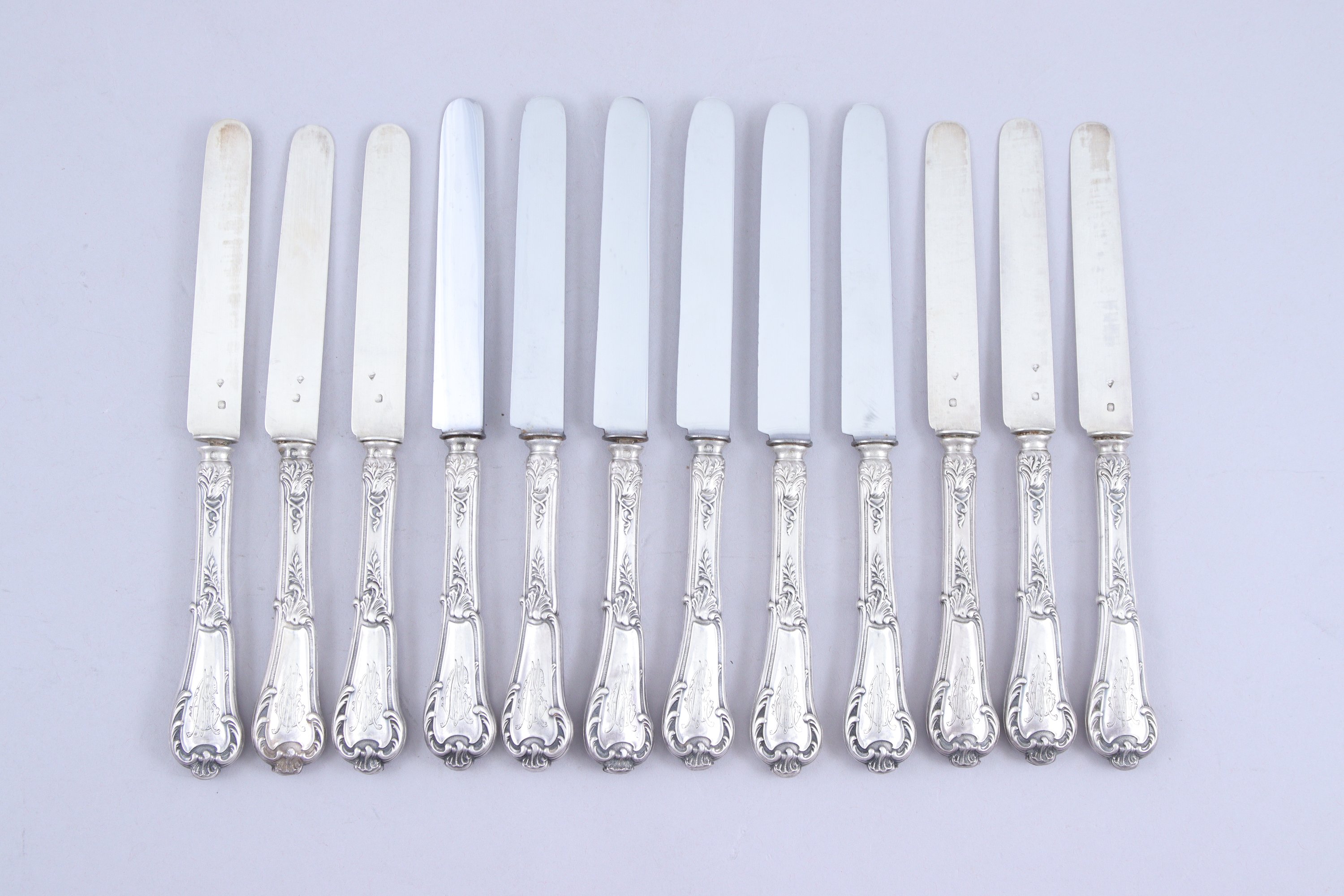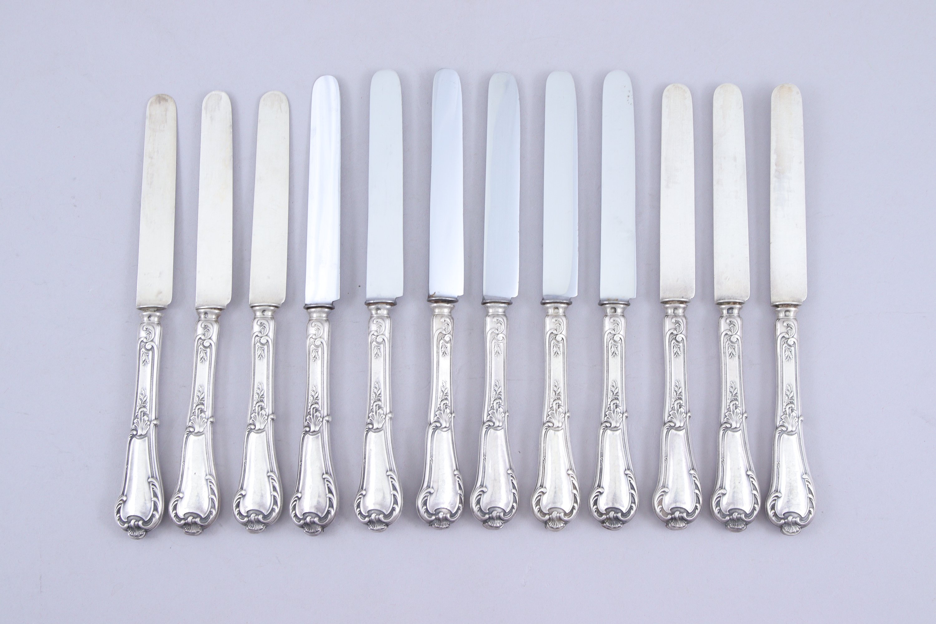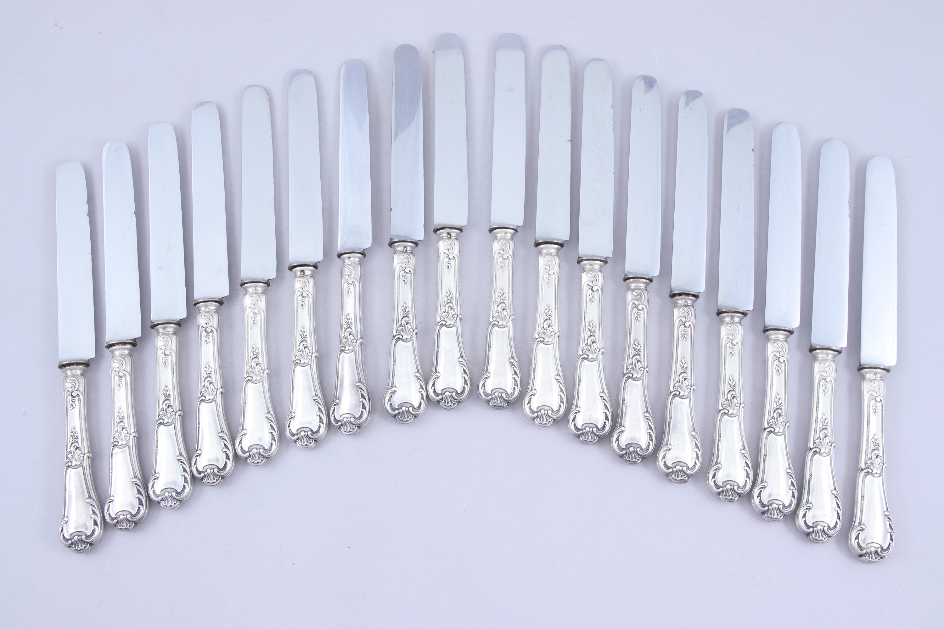 MÉNAGÈRE de SOIXANTE-DOUZE pièces en argent à motifs agrafes et feuillage, monogrammée CM, comprenant DIX-HUIT GRANDS COUVERTS, DIX-HUIT GRANDS COUTEAUX (manche en argent fourré), SIX COUVERTS à DESSERT, SIX COUTEAUX à FROMAGE ET SIX COUTEAUX à FRUIT lame argent (manches en argent fourré)