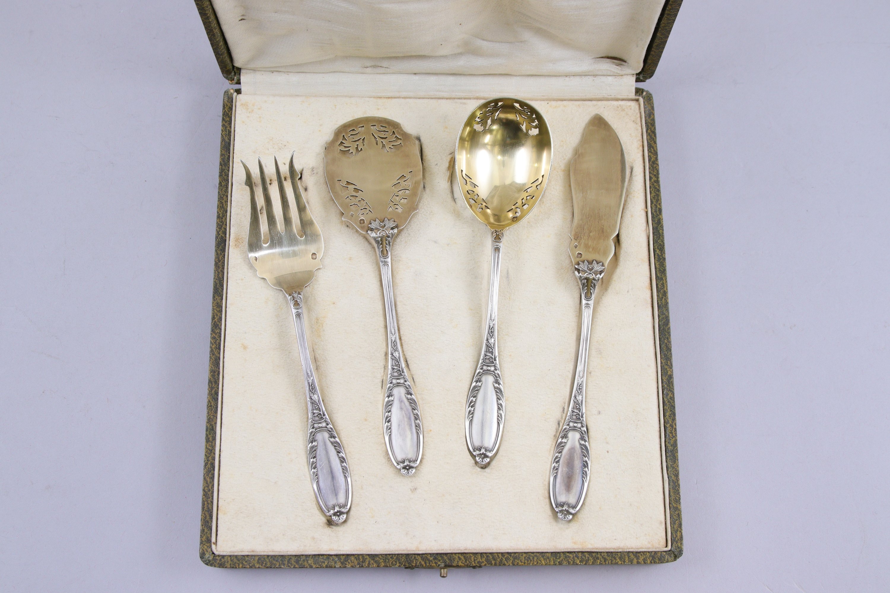 JOINT : SERVICE à ENTREMETS en argent aux spatules vermeillées comprenant quatre pièces. Dans un écrin. Poids : 157 g.
