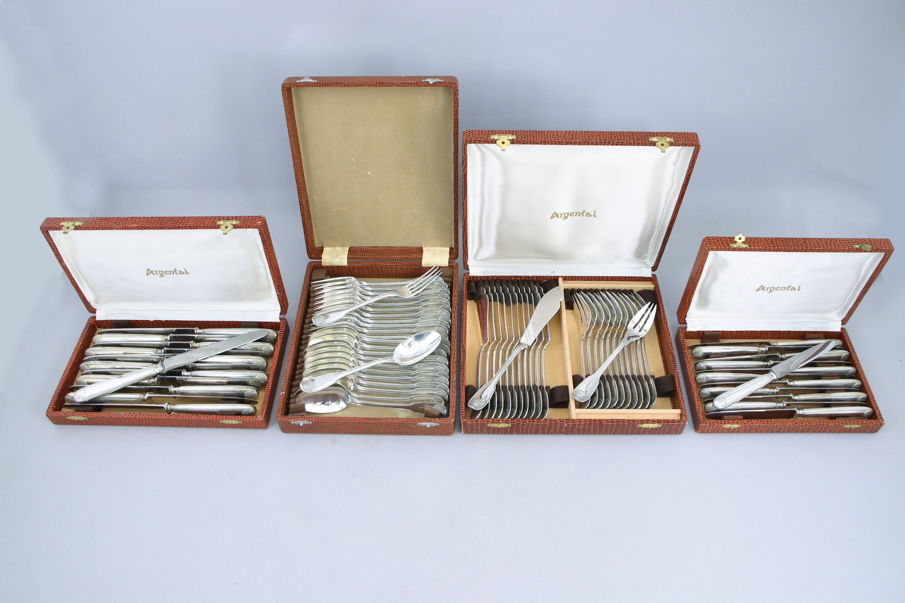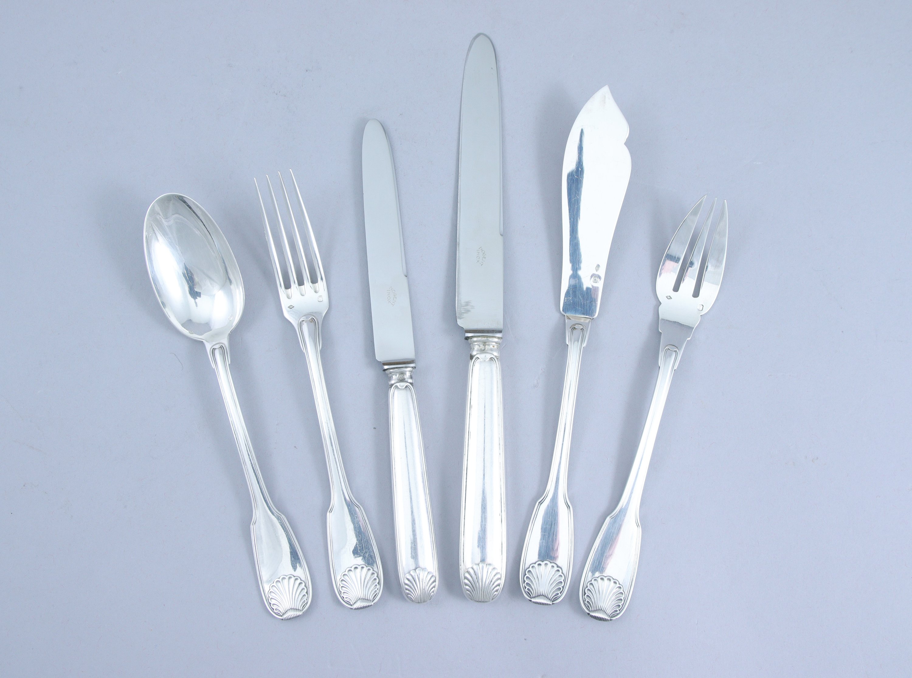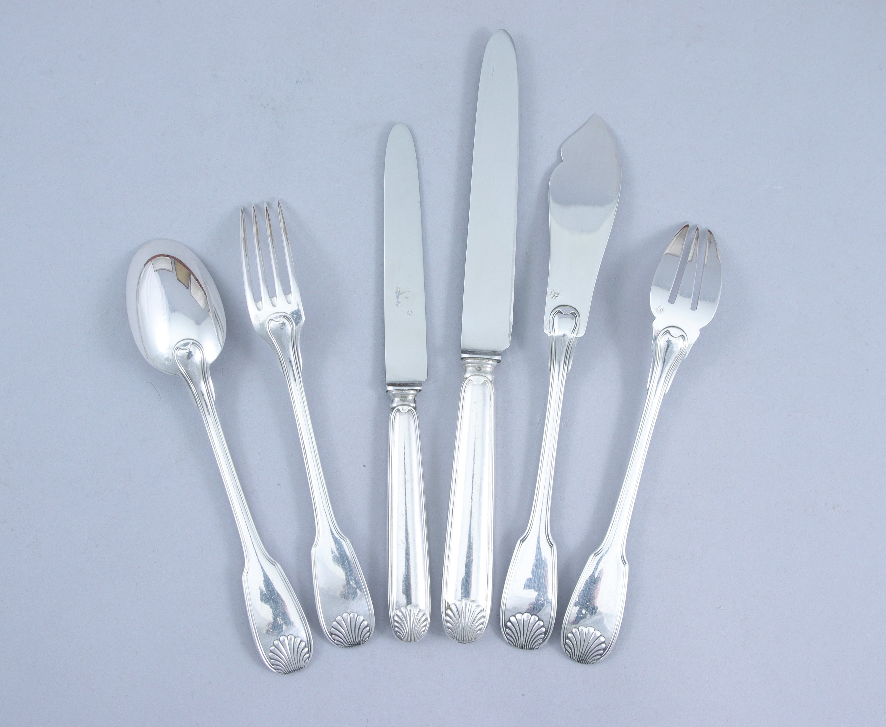 MÉNAGÈRE À LA COQUILLE et FILET CONTOUR en argent de SOIXANTE-DOUZE pièces comprenant DOUZE COUVERTS à ENTREMETS, DOUZE COUVERTS à POISSON ainsi que DOUZE COUTEAUX et DOUZE PETITS COUTEAUX aux manches en argent fourré.