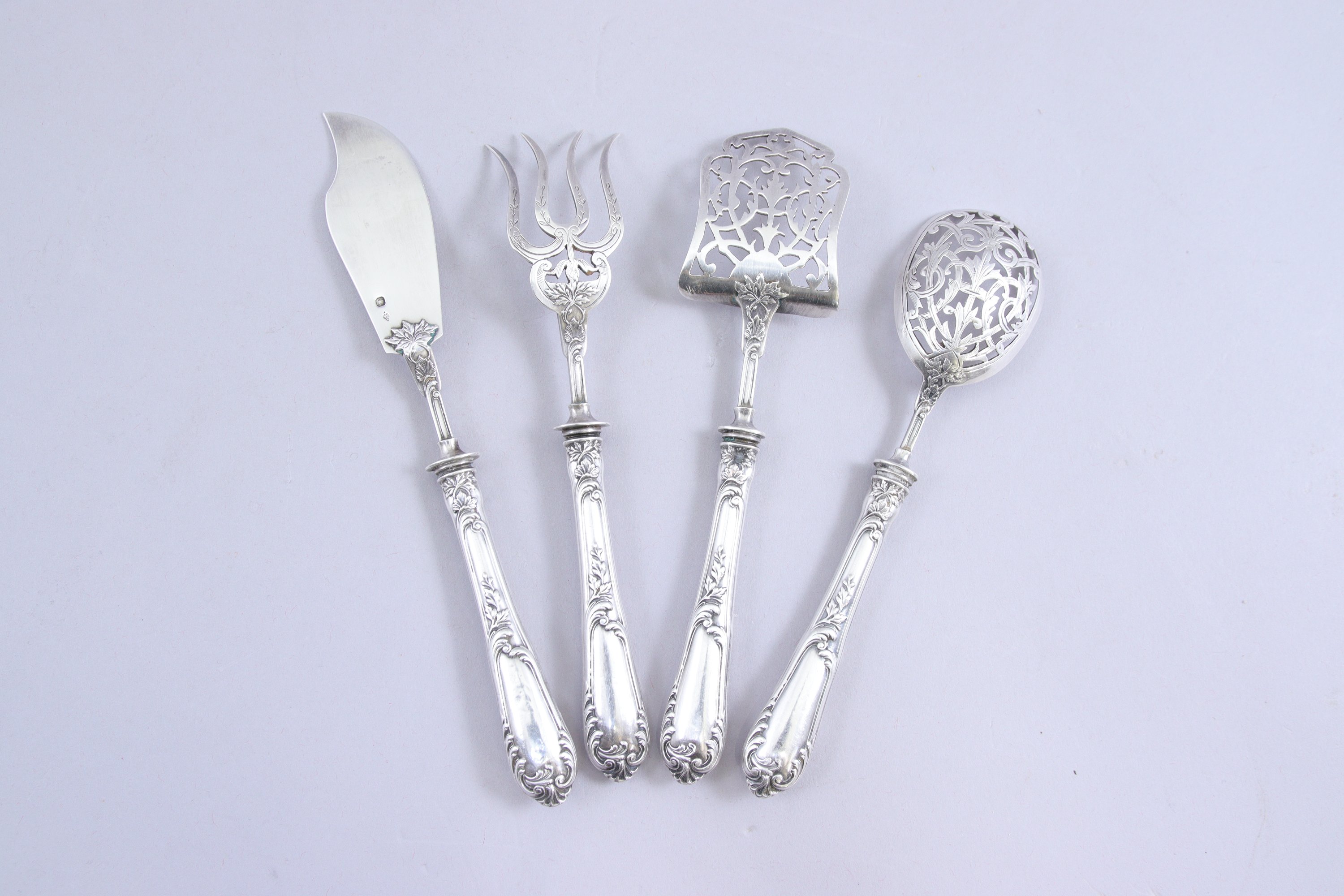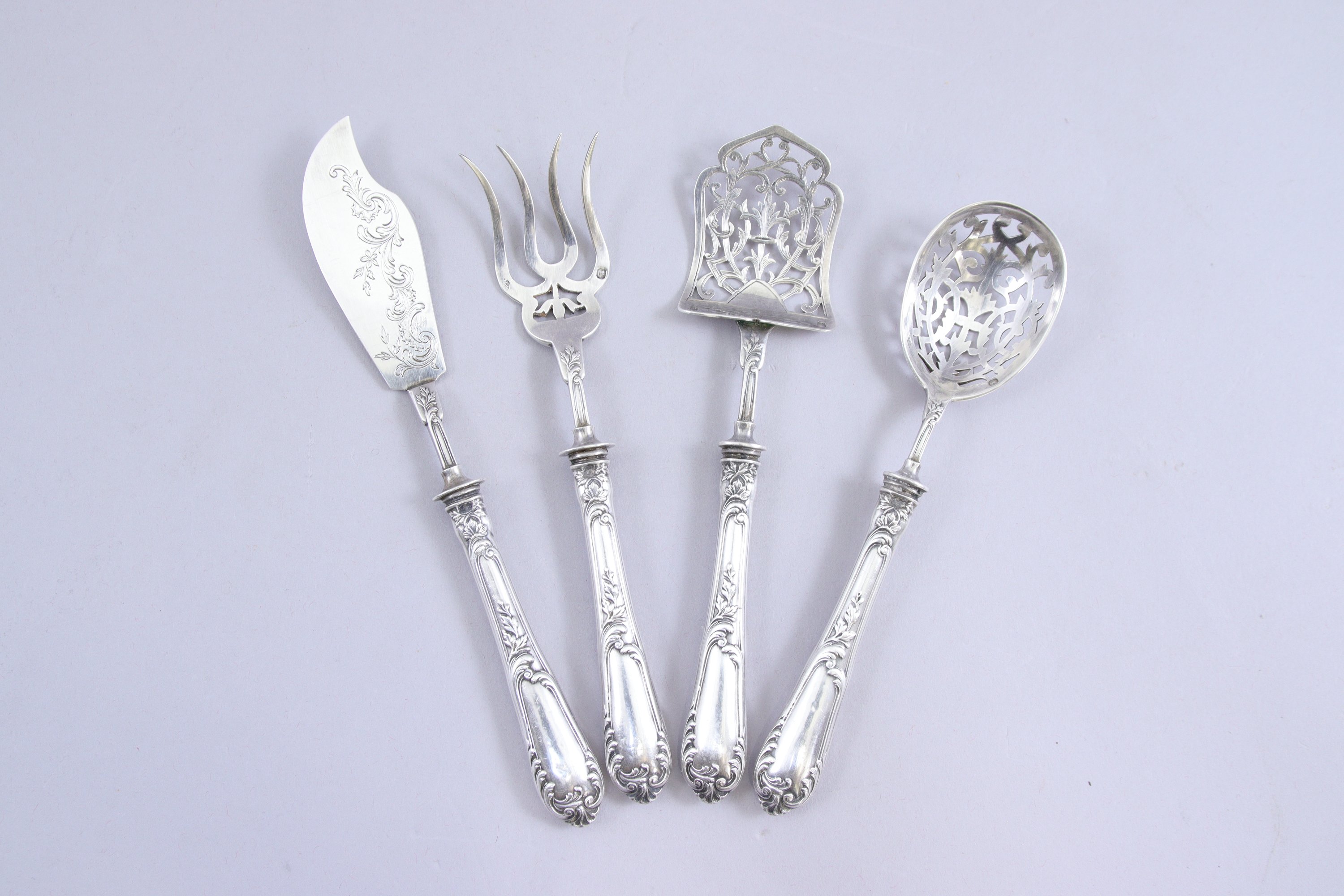SERVICE à MIGNARDISES de QUATRE pièces en argent, les manches en argent fourré. Écrin.