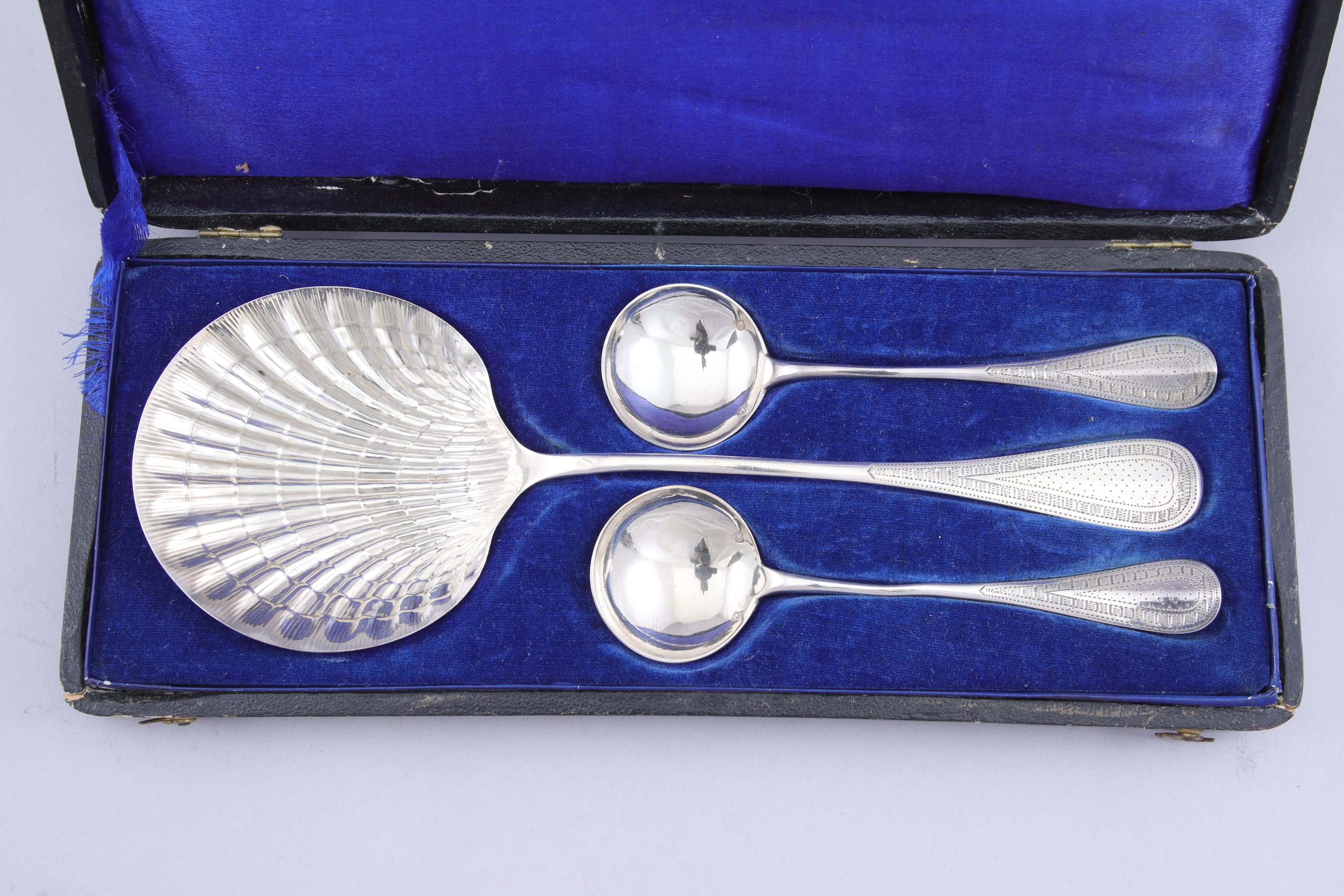 SERVICE à FRAISES en argent, modèle filet, composé d'une CUILLER de service en coquille et deux CUILLERS à CAFÉ. Écrin de formes.