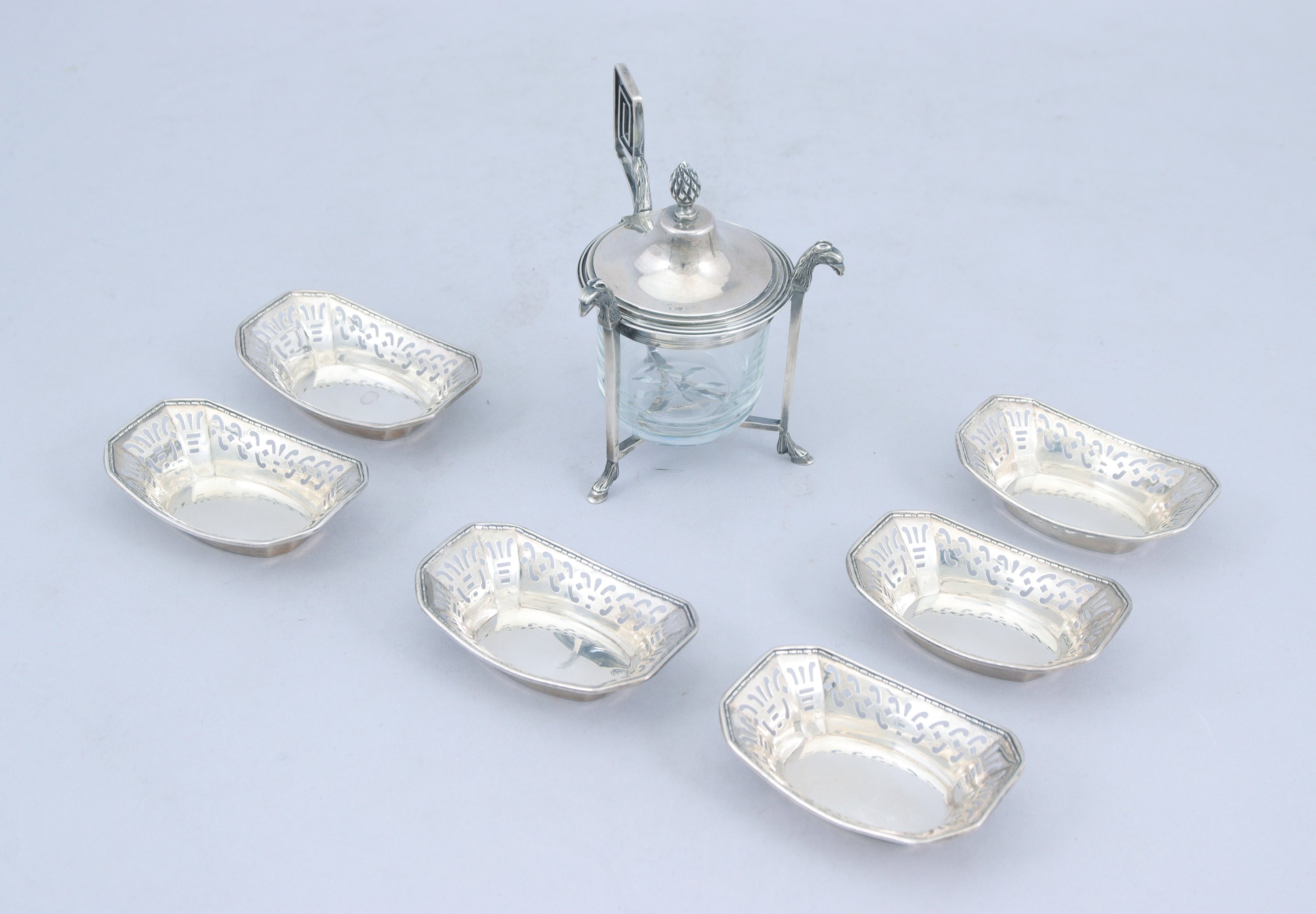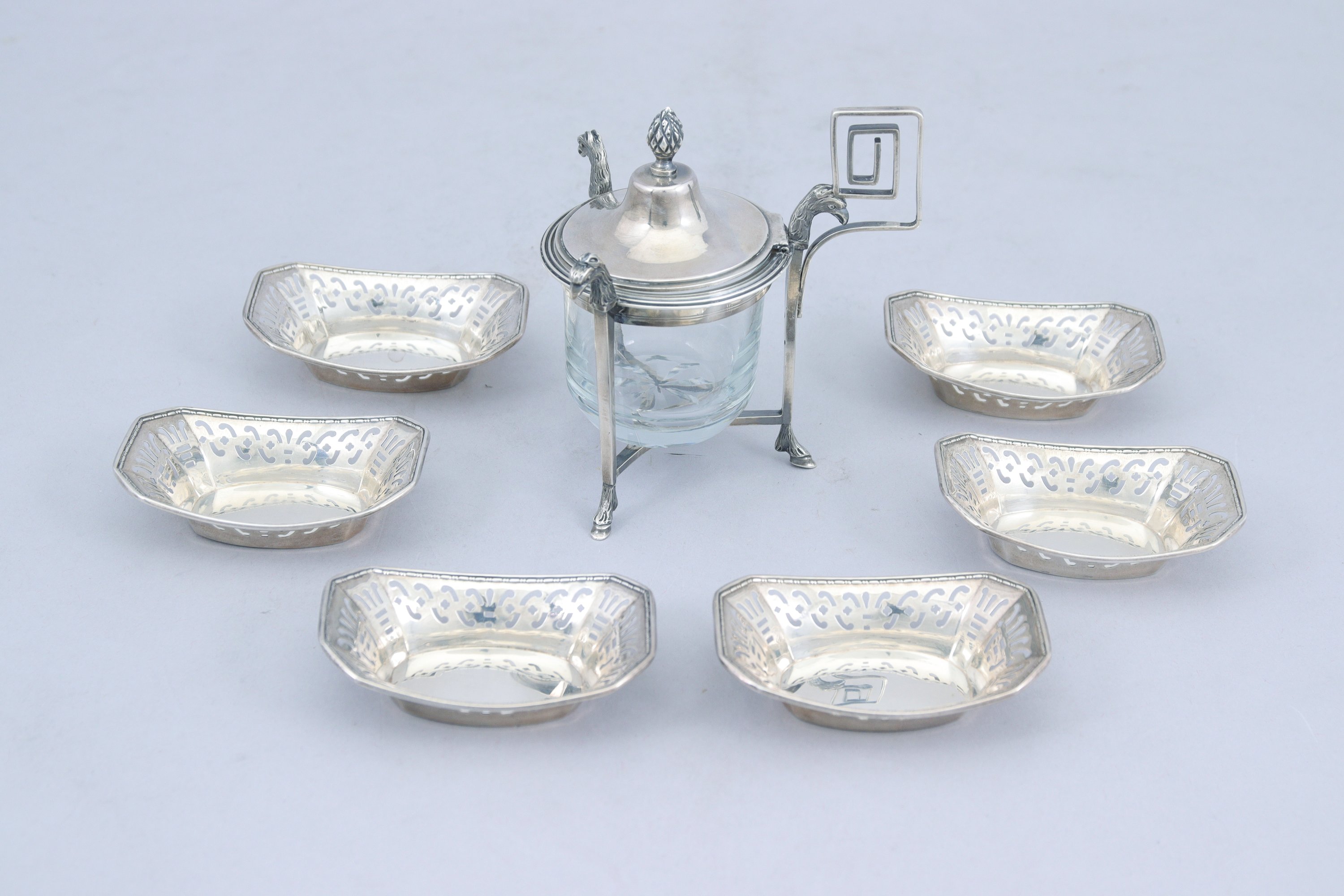 - MOUTARDIER en argent, les montants à têtes de volatiles. Avec un verre en cristal gravé d'un motif étoile. Poids net 130 g. Haut. 10,7 cm.