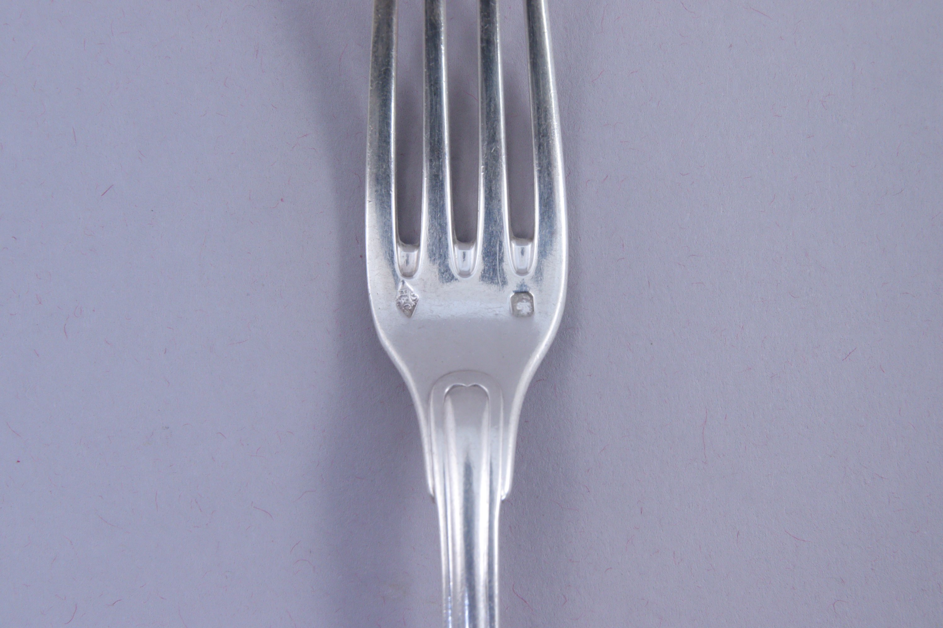 - Deux FOURCHETTES, en argent, l'une modèle filet, l'autre modèle uniplat. L'une poinçon Vieillard l'autre poinçon Minerve. Poids 100 g.
