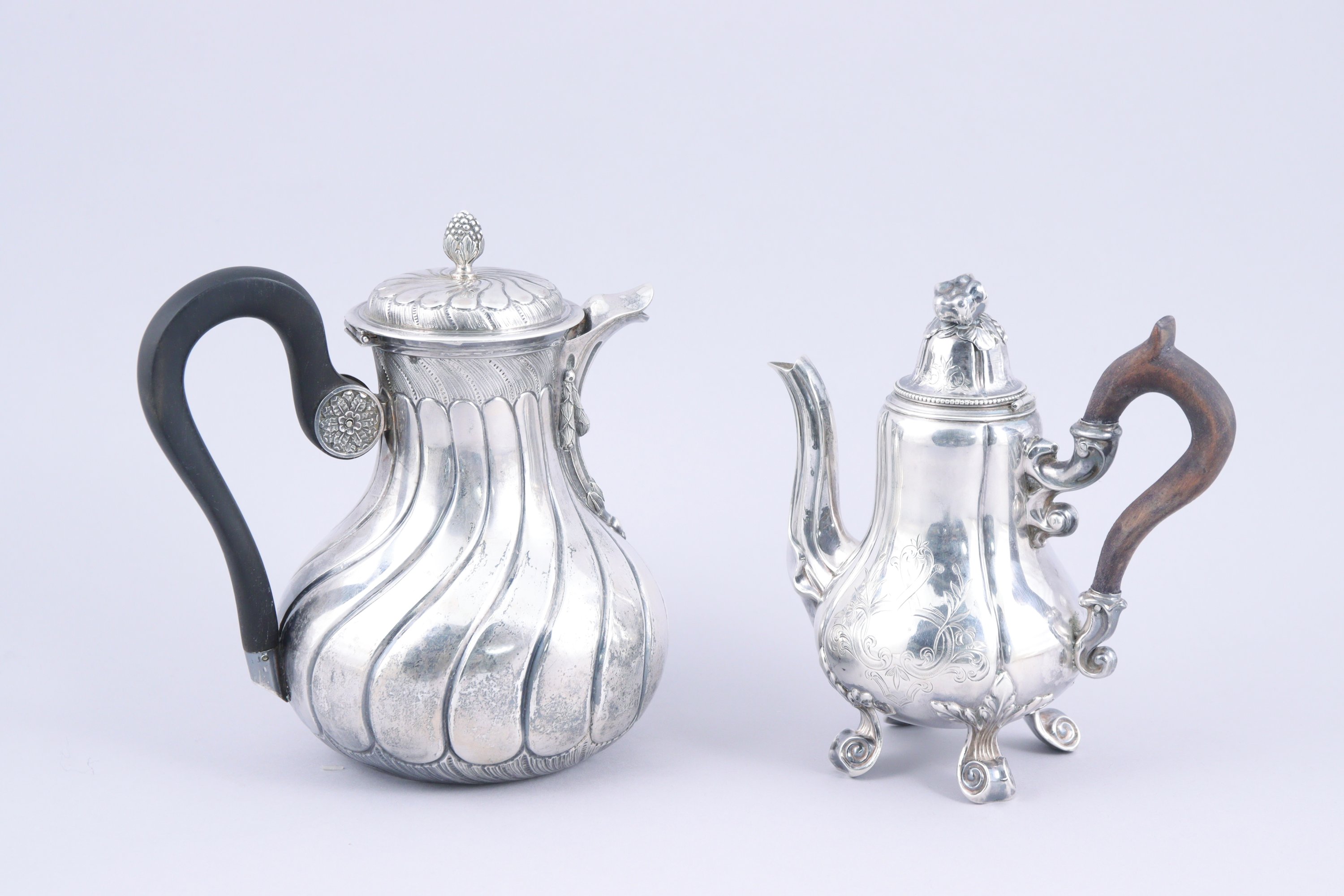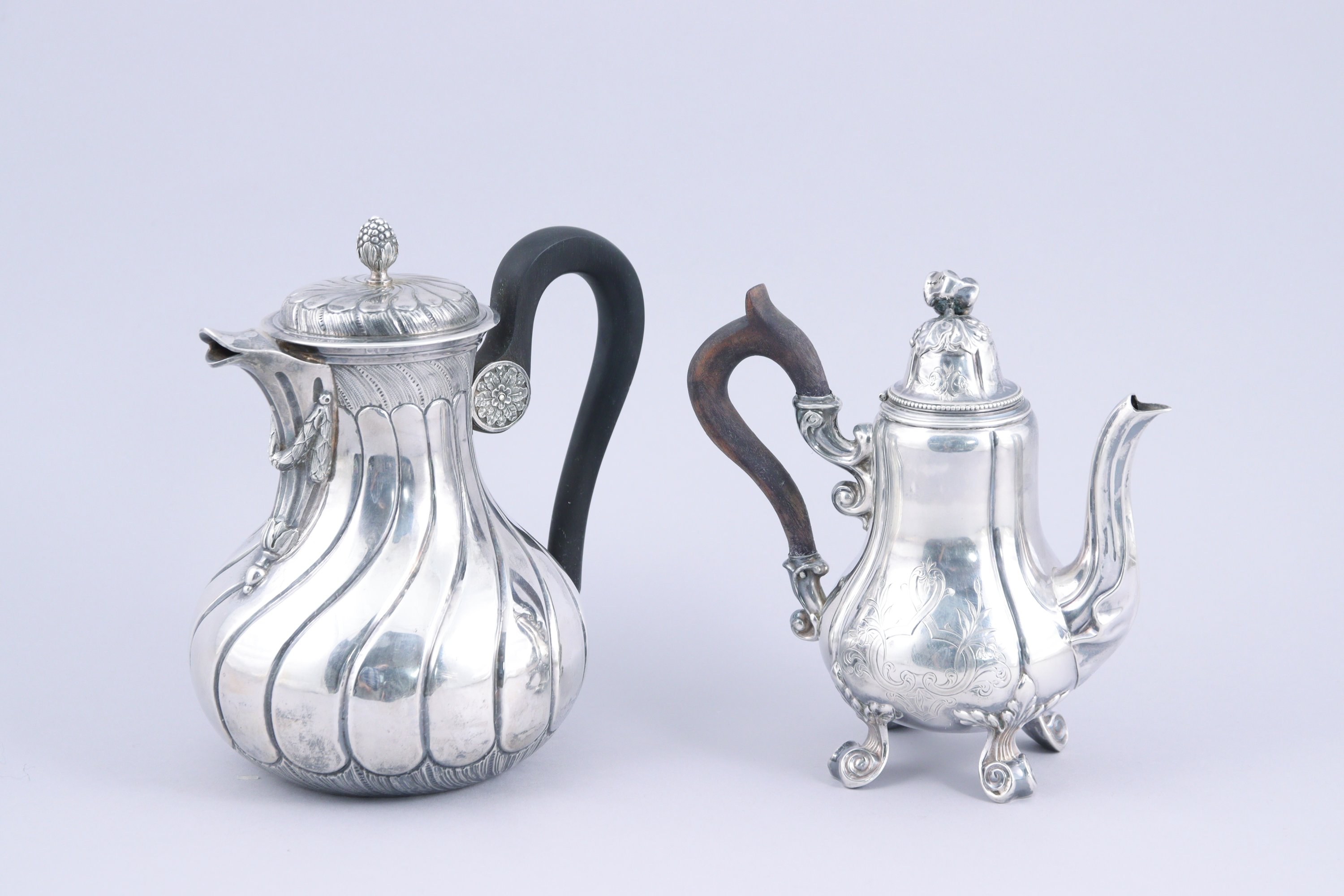 - Une théière égoïste, reposant sur quatre pieds à enroulements, fretel en forme de fleur épanouie. Manche en bois.