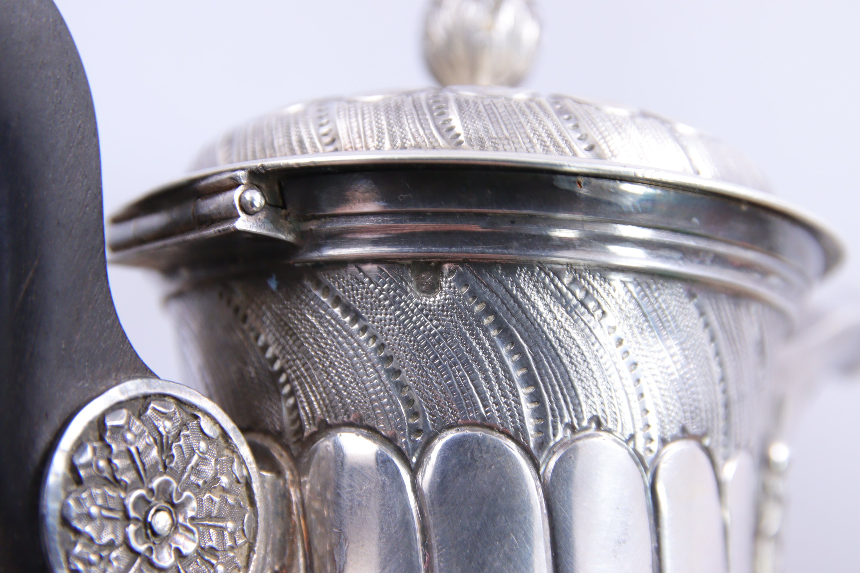 - Une cafetière à fond plat aux motifs torsadés et guirlandes en chute. La poignée en bois noirci.