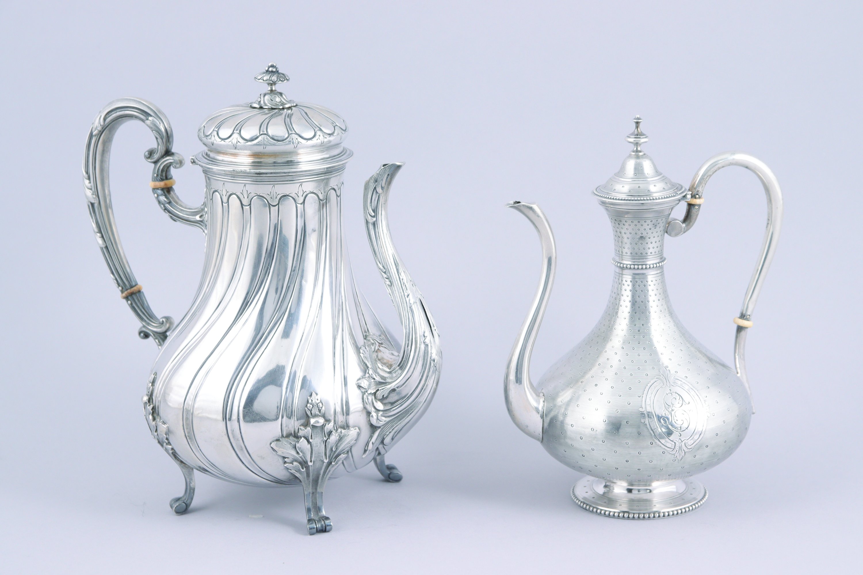 - la première de forme balustre ornée de godrons torsadés, le fretel en fleur épanouie. Elle repose sur quatre pieds à enroulements.