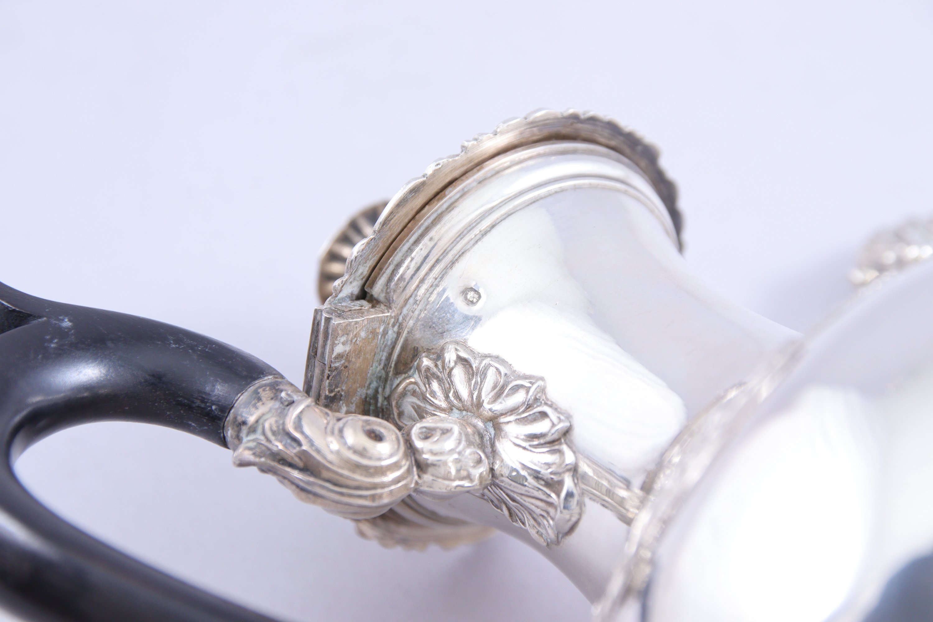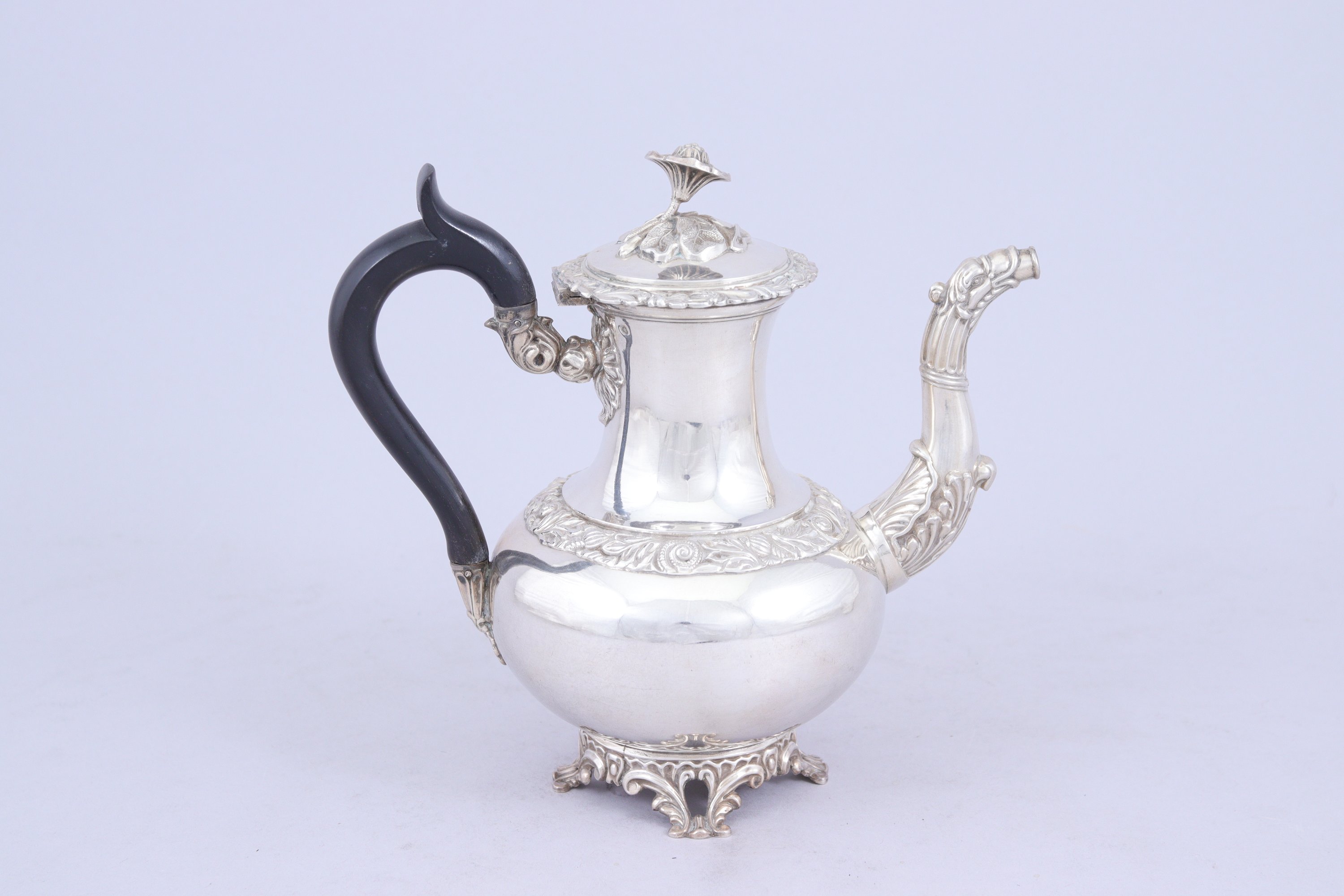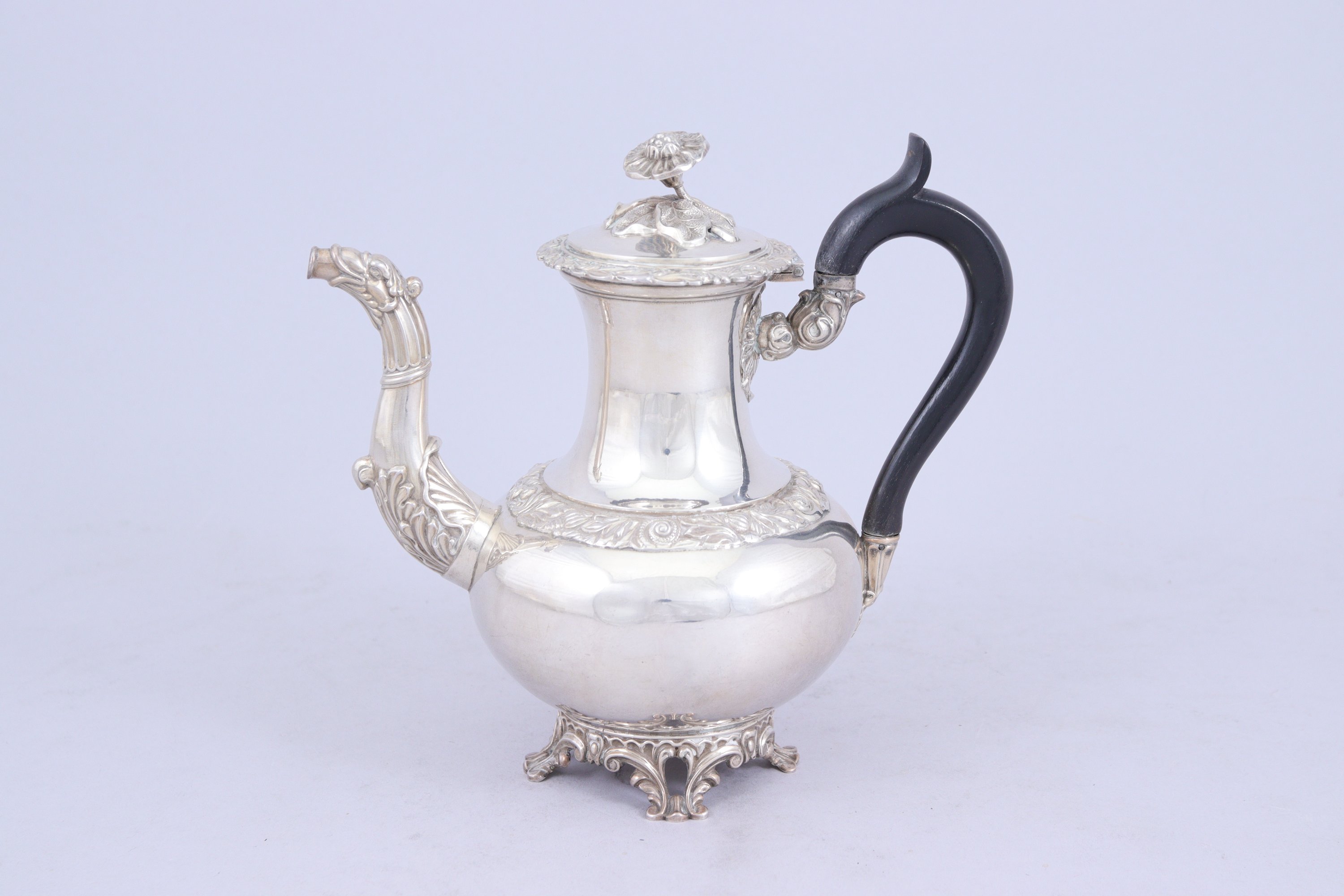 THÉIÈRE en argent, au décor feuillagé en registre. Fretel en forme de fleur épanouie. Bec verseur prenant la forme d'un bec de volatile. Anse en bois noirci.