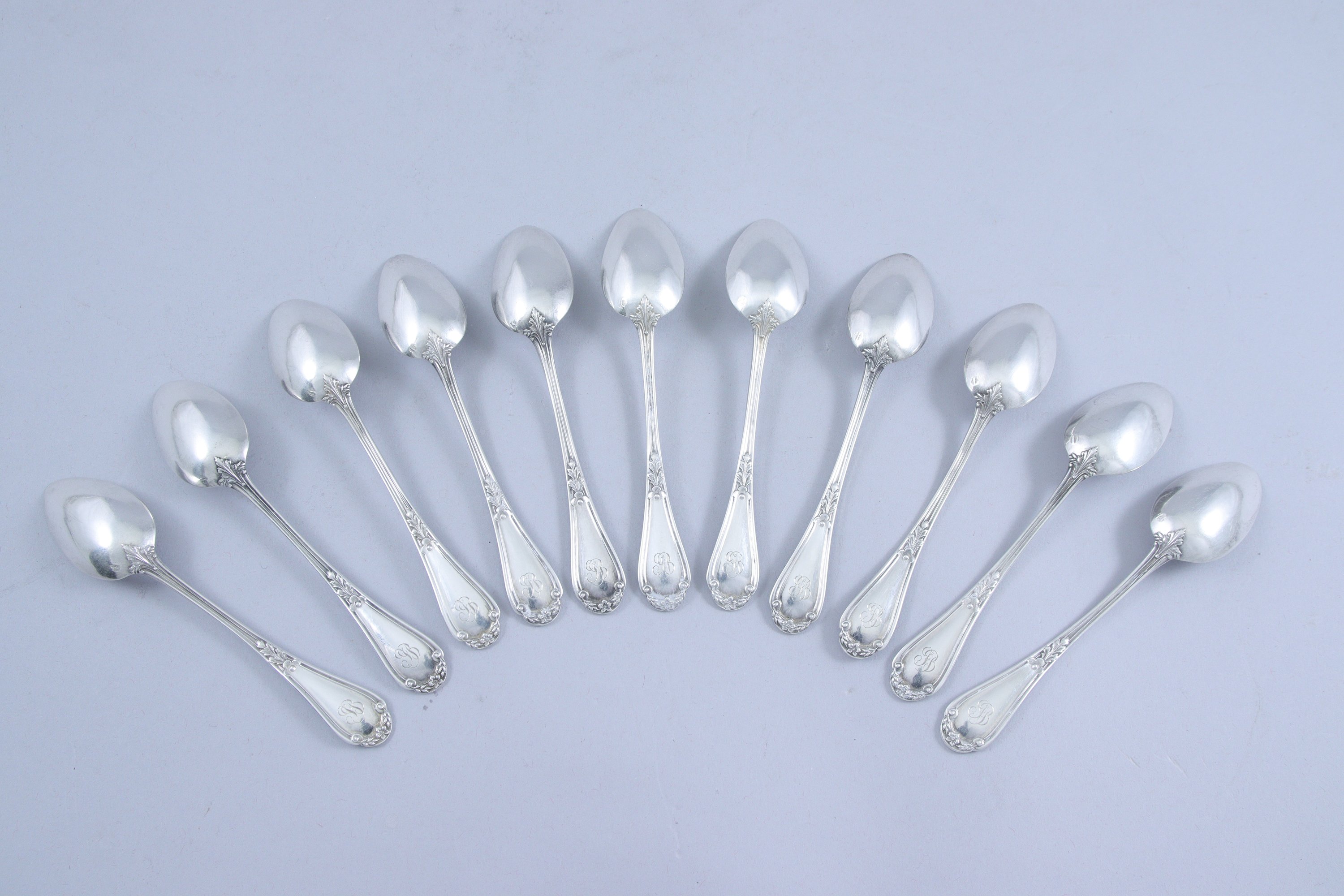 ONZE CUILLERS à CAFÉ en argent modèle feuillagé.Poinçon Minerve. Maître...