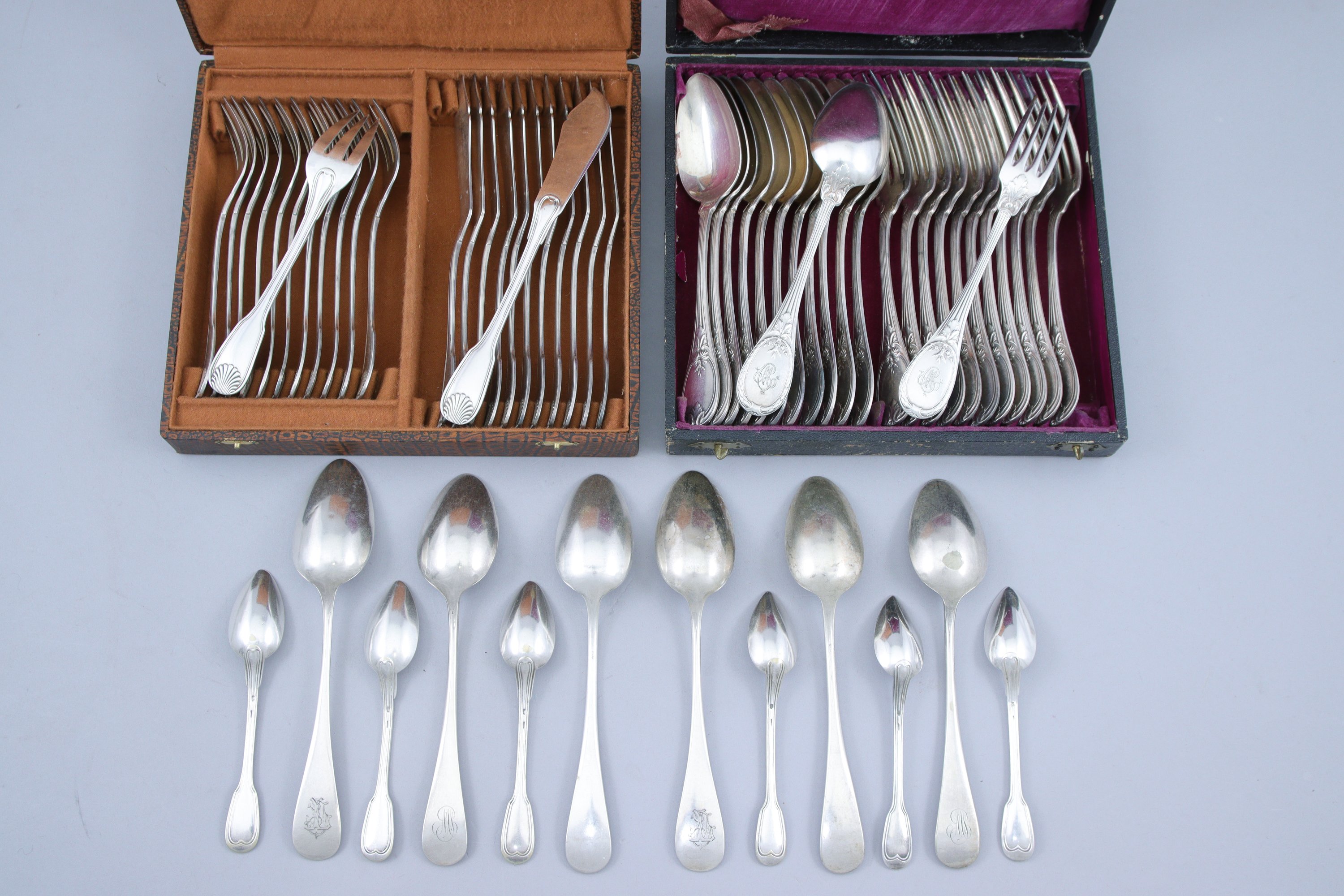 - CHRISTOFLE, DOUZE COUVERTS de TABLE modèle à filet et feuilles monogrammés "MC" (écrin)