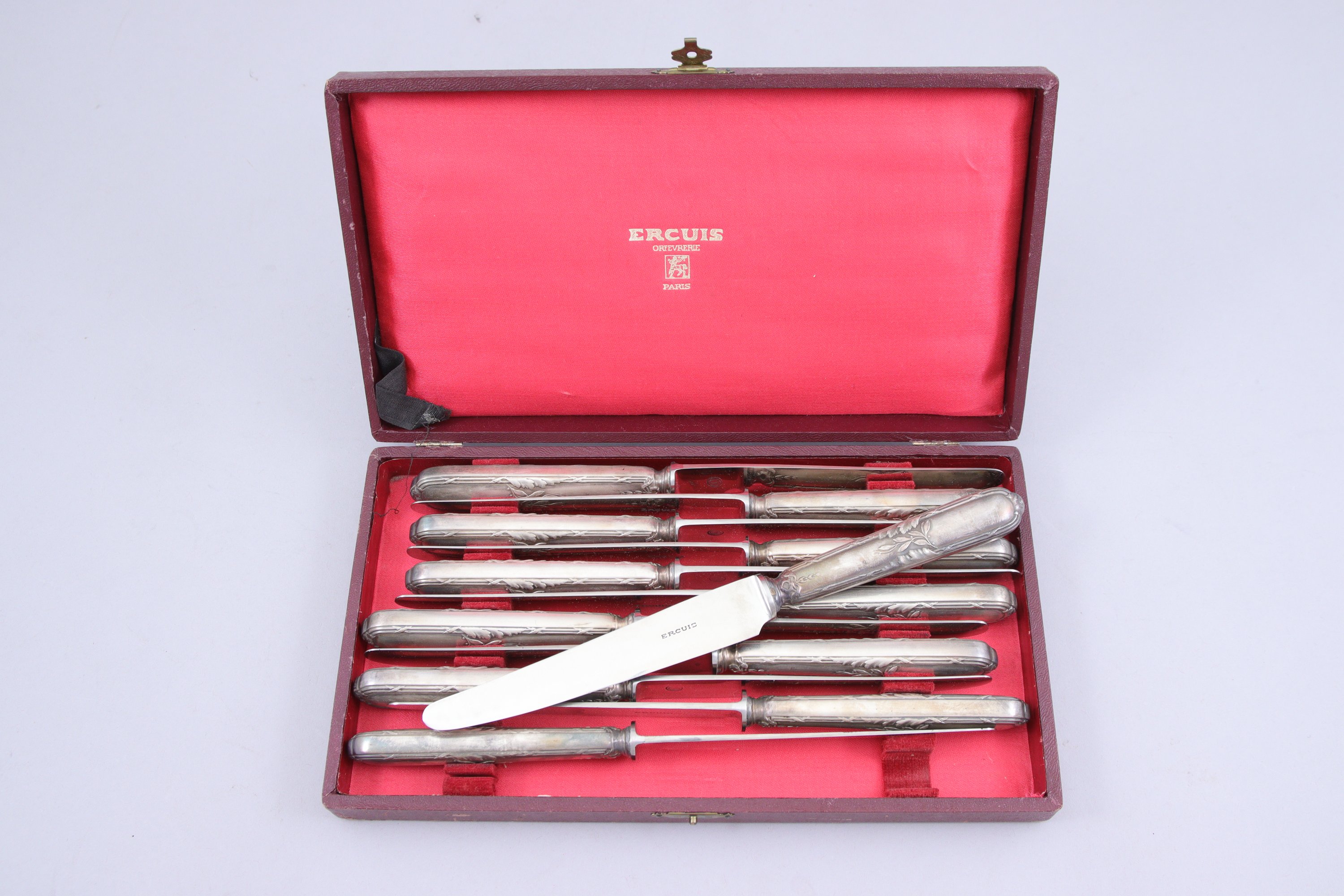 ERCUIS. Partie de ménagère comprenant DOUZE COUTEAUX à lame en acier inoxydable et manche en métal argenté.