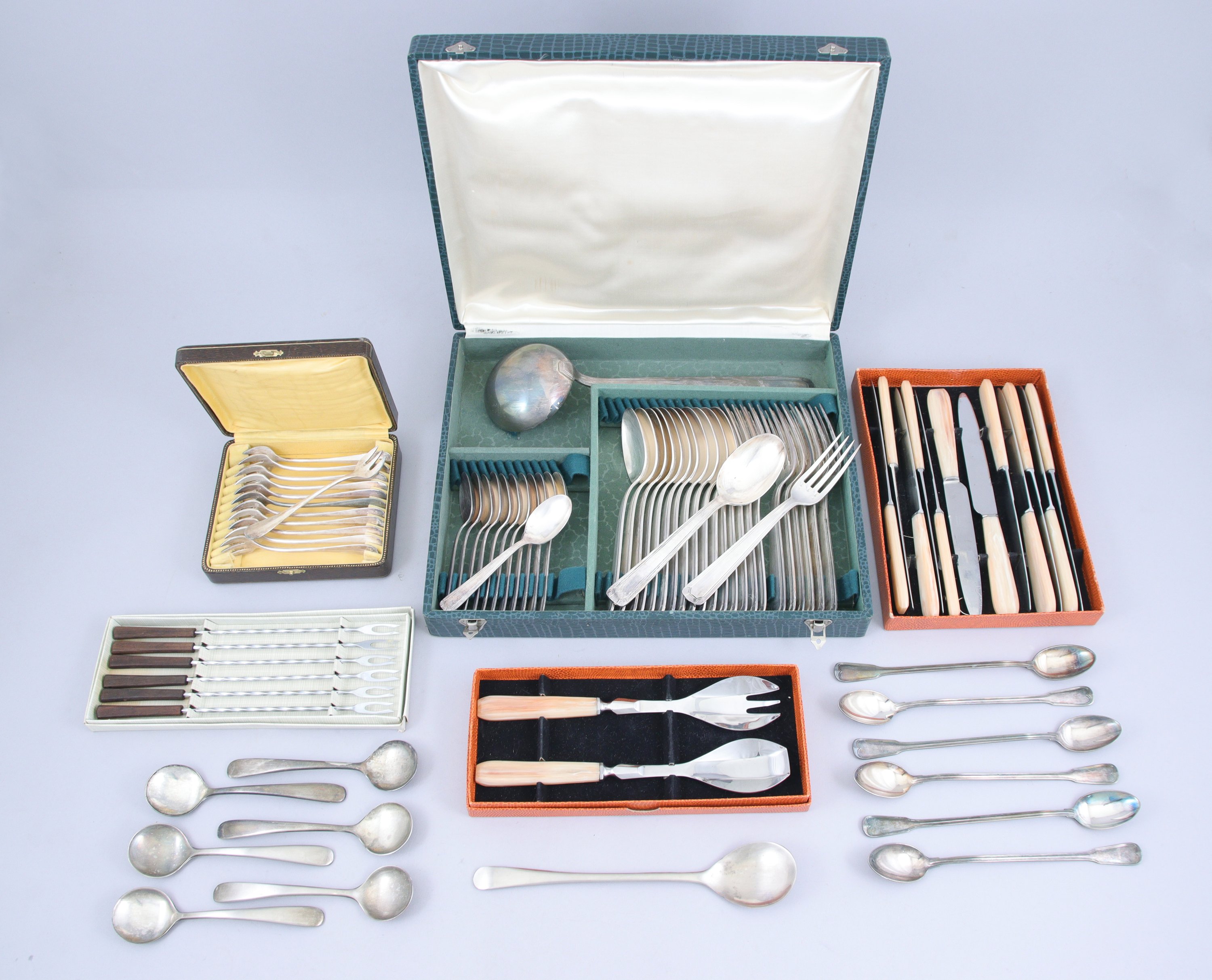 JOINT : Ménagère en métal argenté comprenant DOUZE CUILLERS à CAFÉ, DOUZE CUILLERS à SOUPE, DOUZE FOURCHETTES et UNE LOUCHE. Partie de ménagère en métal argenté comprenant DOUZE FOURCHETTES à HUÎTRES, 6 CUILLERS à GLACE et UNE CUILLER de service, 6 CUILLERS à THÉ GLACÉ, DOUZE COUTEAUX et UNE PAIRE de COUVERTS DE SERVICE avec manche en corne résine marqués "BARCOIN, L'Enclume inox", 6 PIQUES à FONDUE en inox et manche en bois.