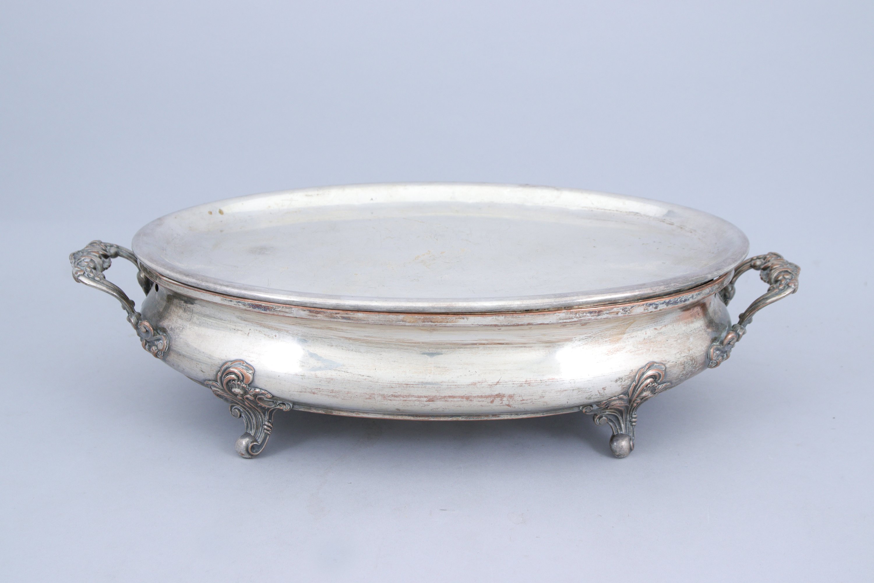 CHAUFFE-PLAT ovale en métal argenté, les anses feuillagées et le piètement à volutes et feuilles d'acanthe.