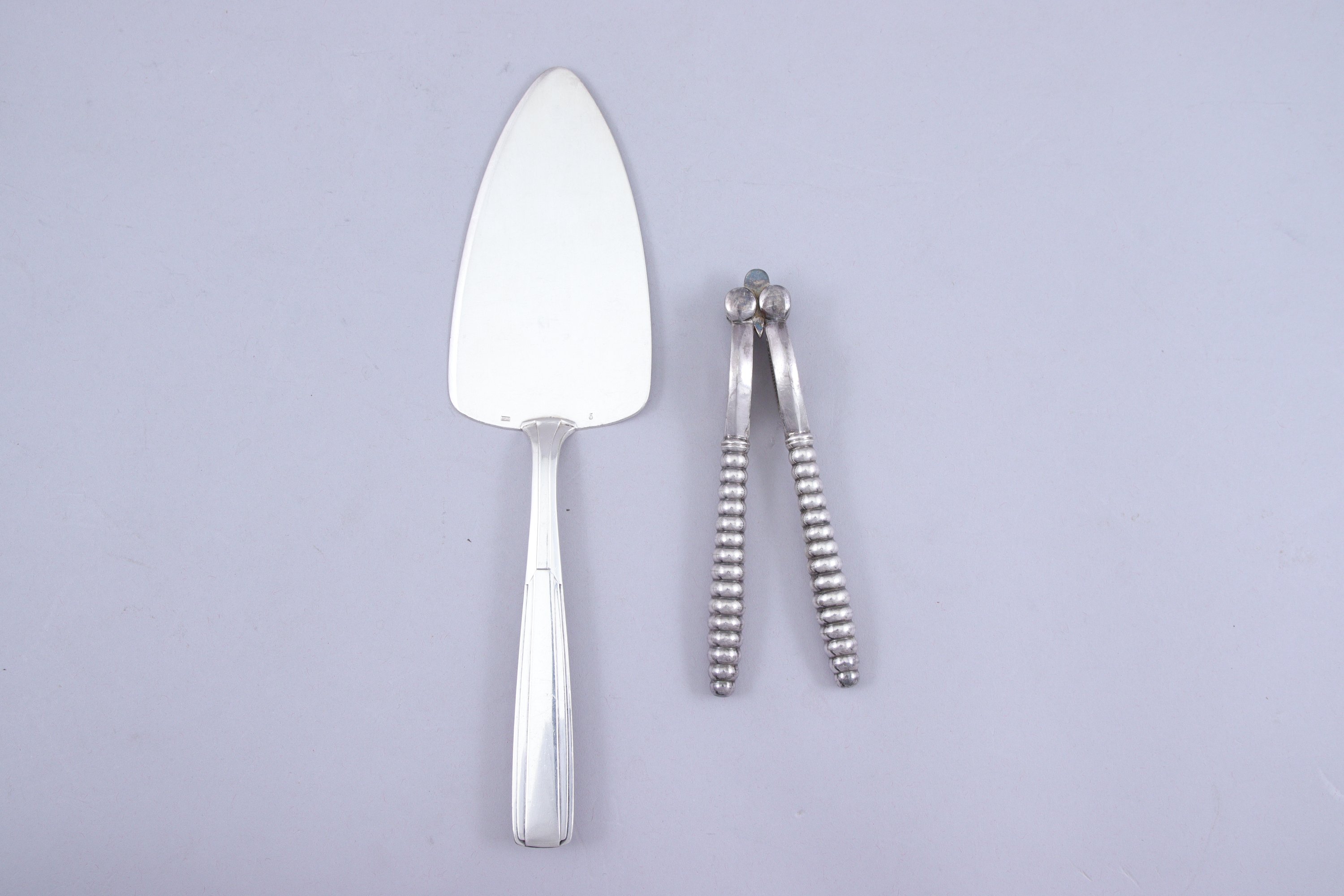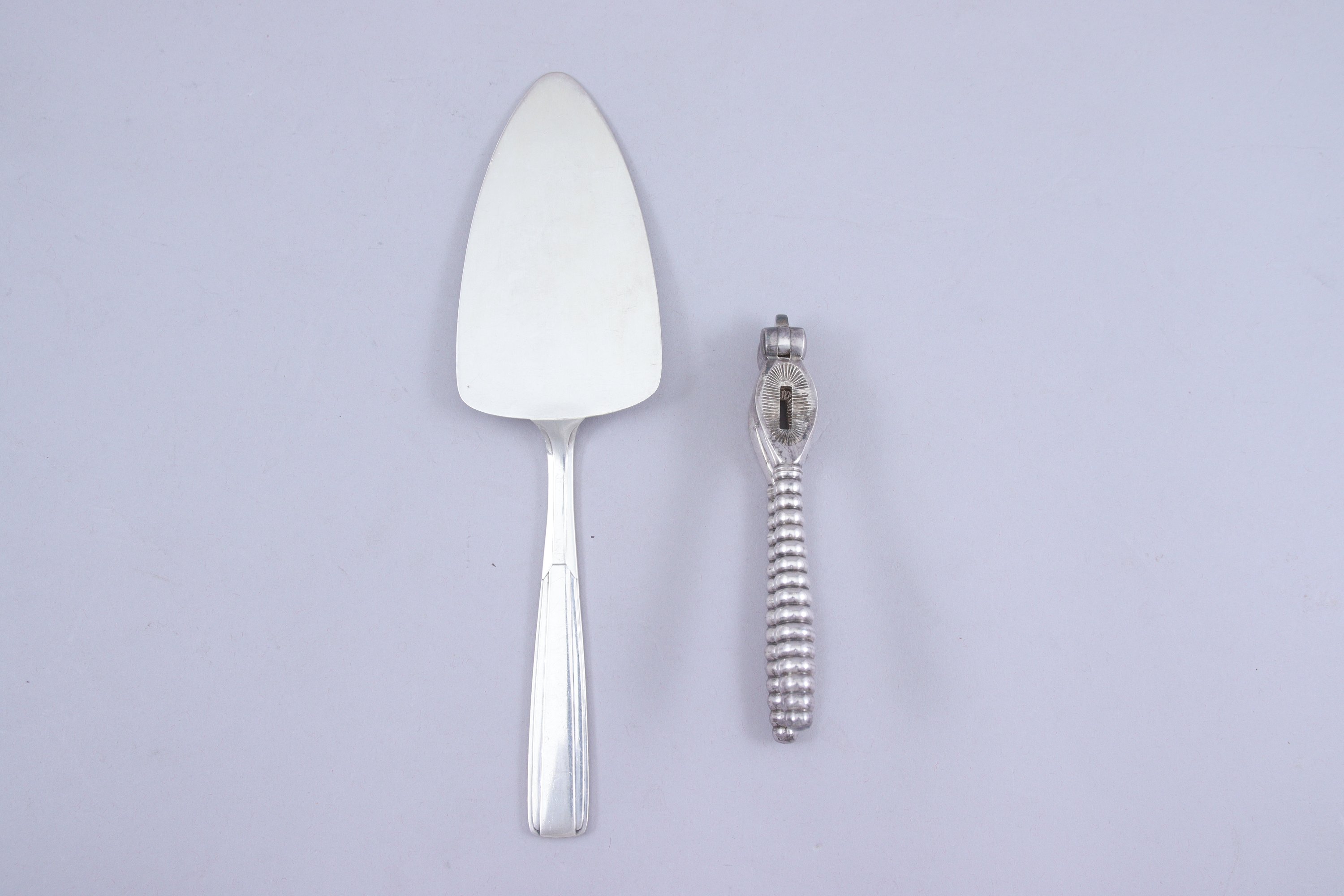 JOINT: une PELLE à TARTE de style art déco, un CASSE-NOIX et une SAUCIÈRE en métal argenté.