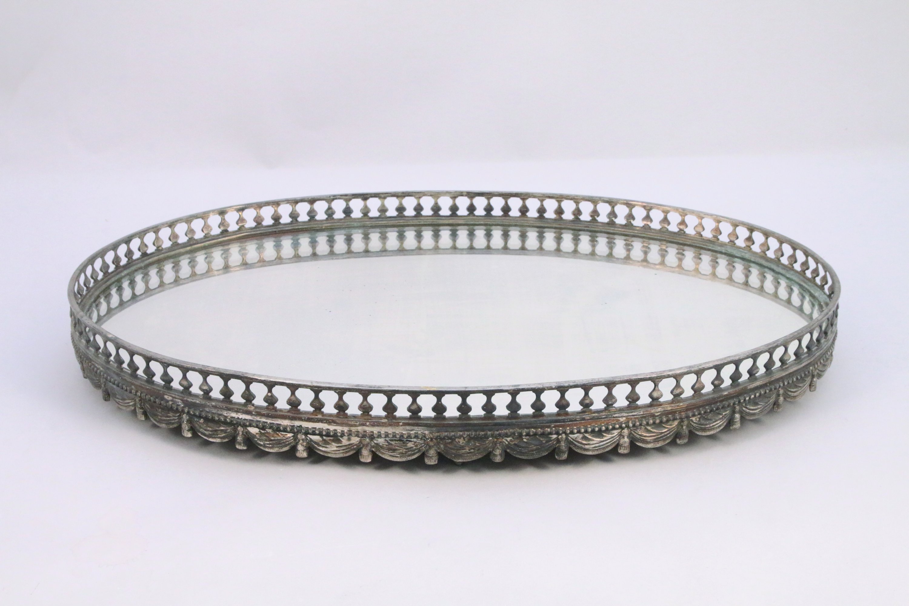 SURTOUT de TABLE de forme ovale, en métal argenté, ceint d'une galerie aux colonnes balustres surplombant une frise de perles et de chutes. Fond miroir. Repose sur quatre pieds toupies.
