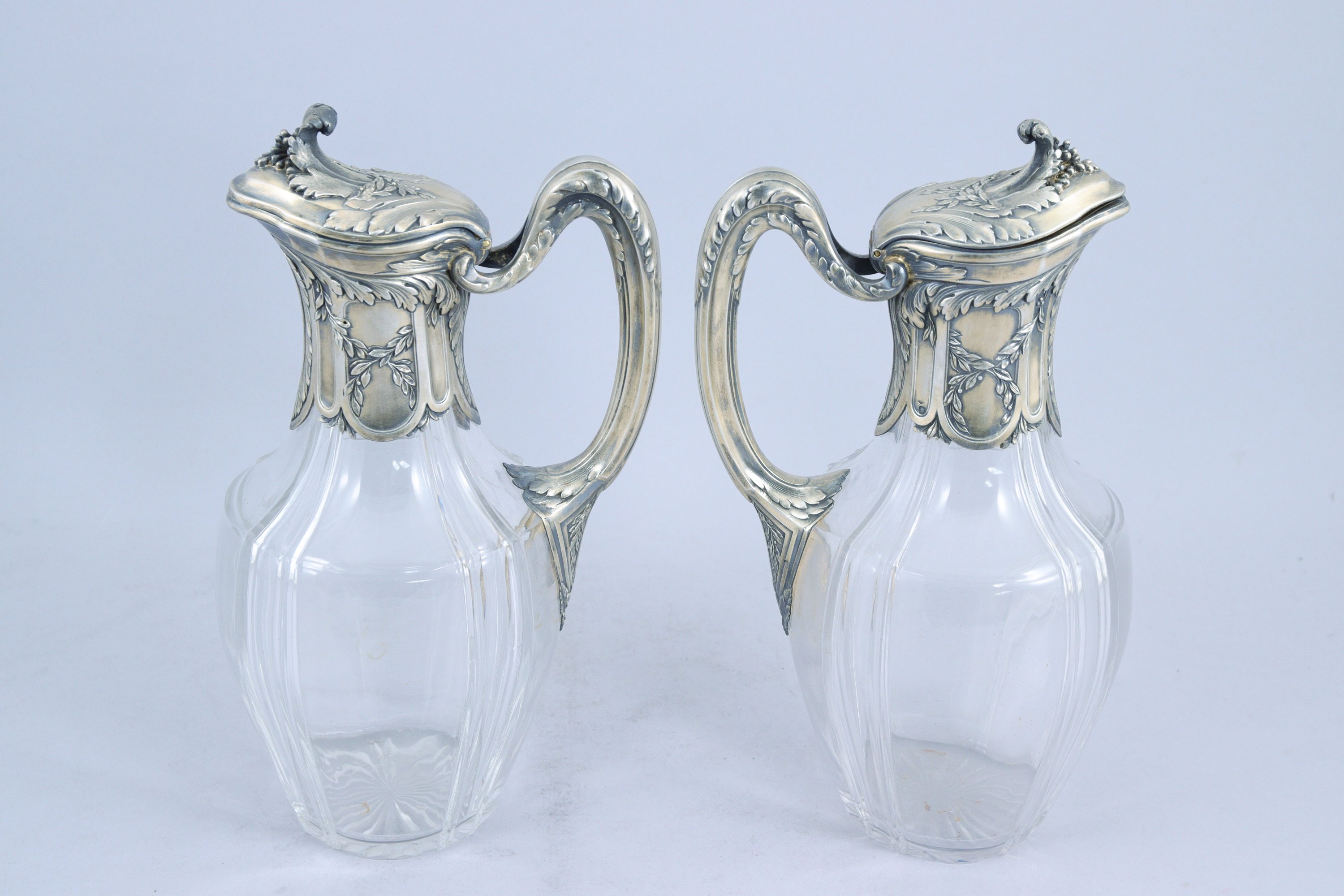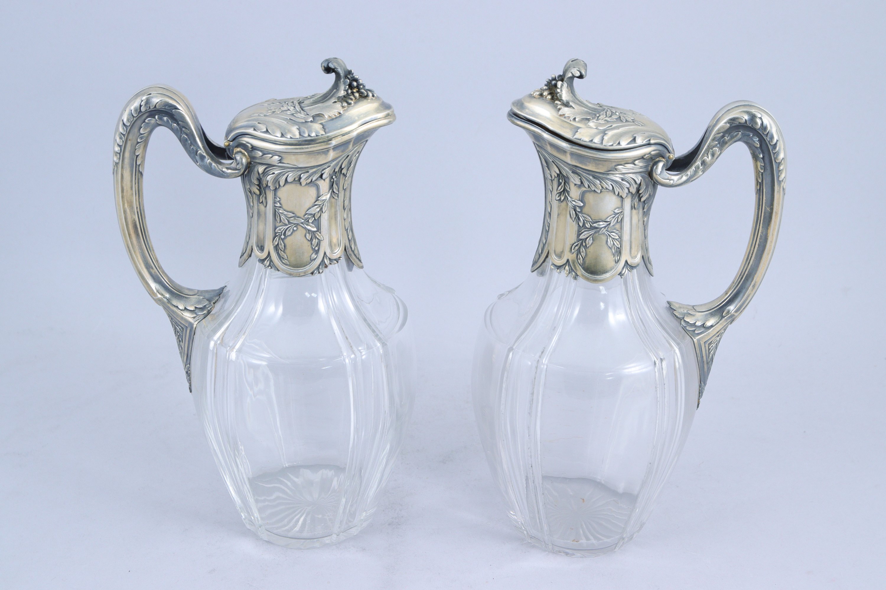 PAIRE D'AIGUIÈRES AUX PAMPRES DE VIGNES en argent anciennement vermeillé et cristal taillé.
