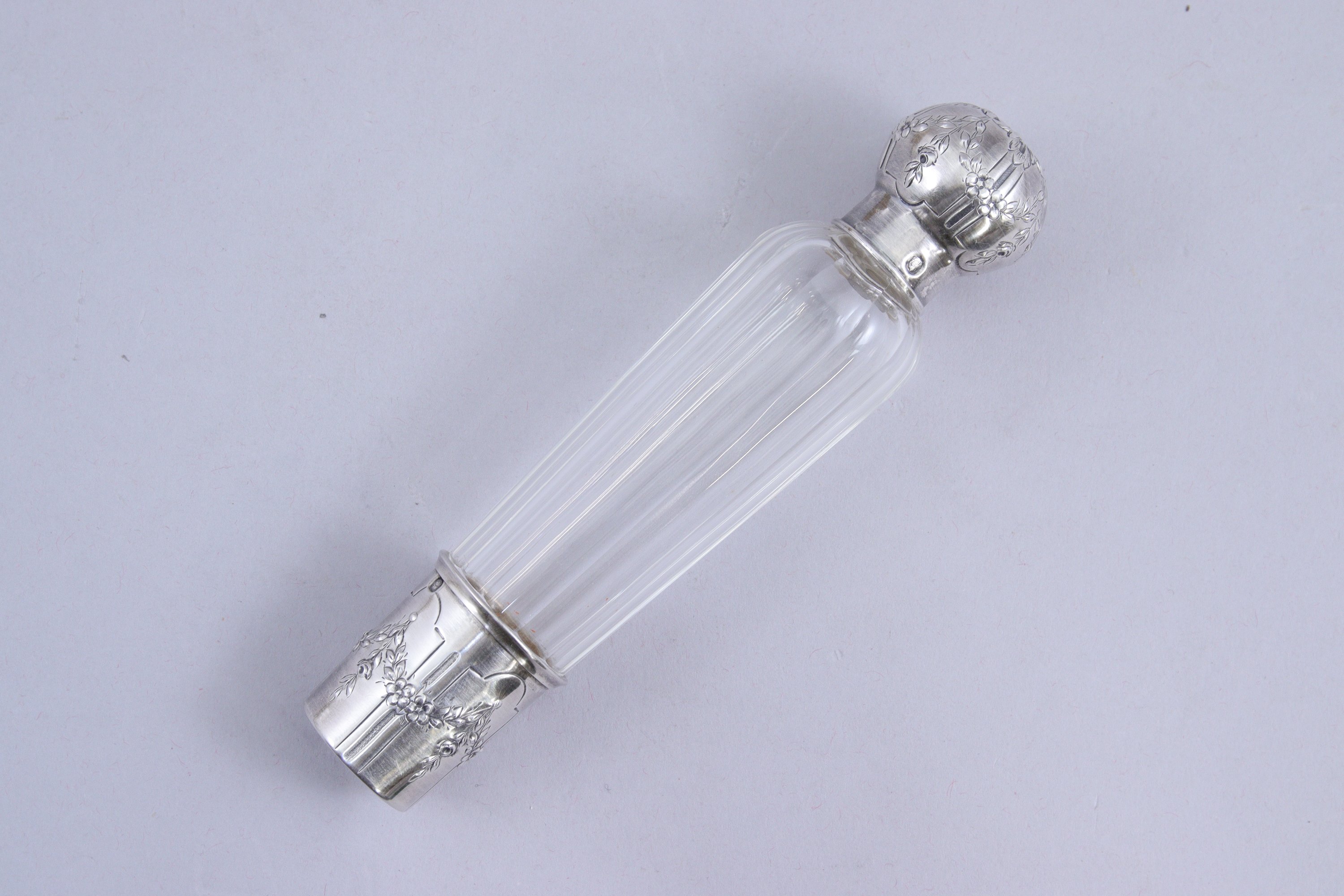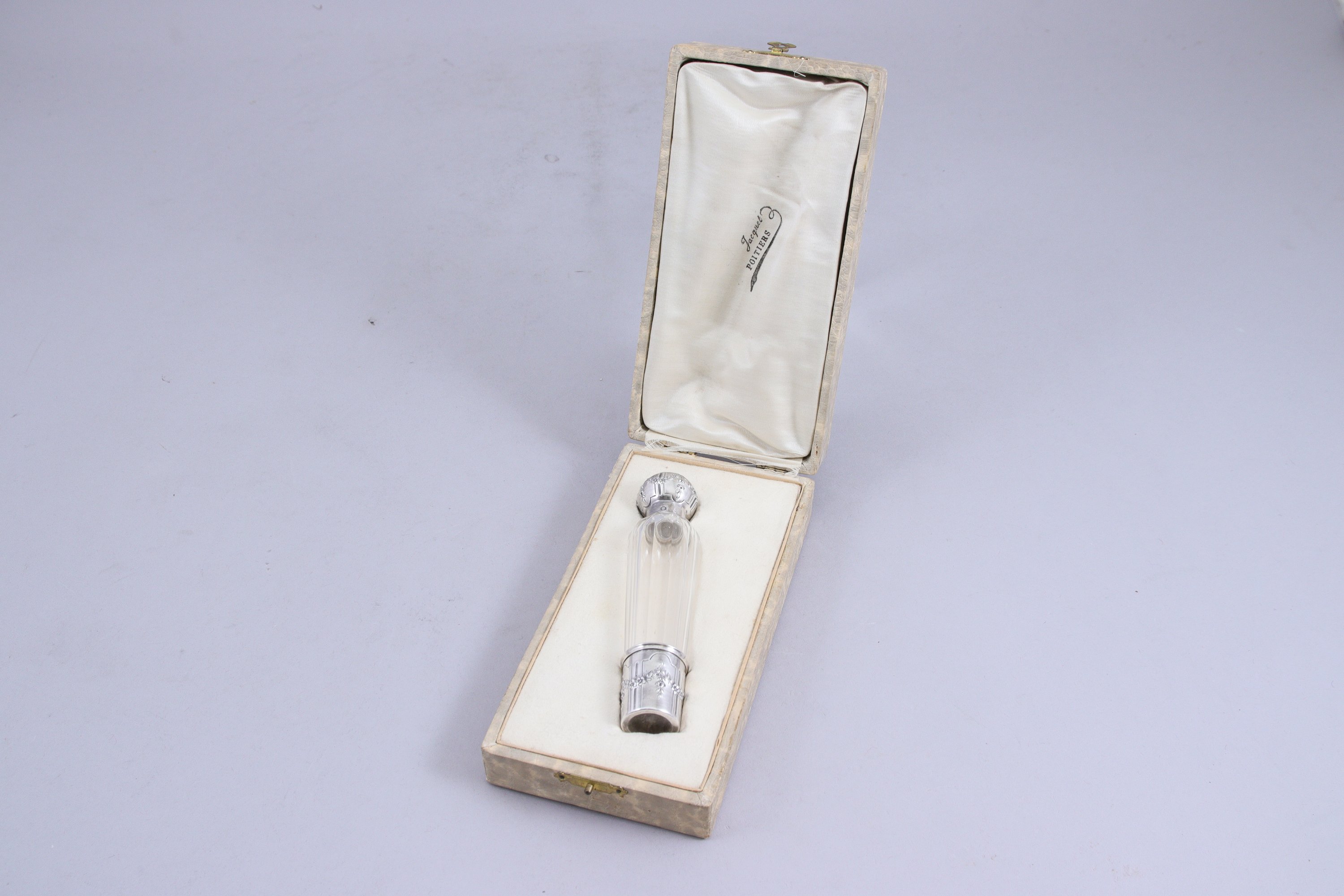 FLACON de TOILETTE en cristal taillé. Le bouchon et la base sont en argent. La base se détache pour former une petite timbale à intérieur vermeil. Le bouchon en argent laisse découvrir un bouchon en cristal délicatement ciselé (écrin de forme en peau et soie crème).