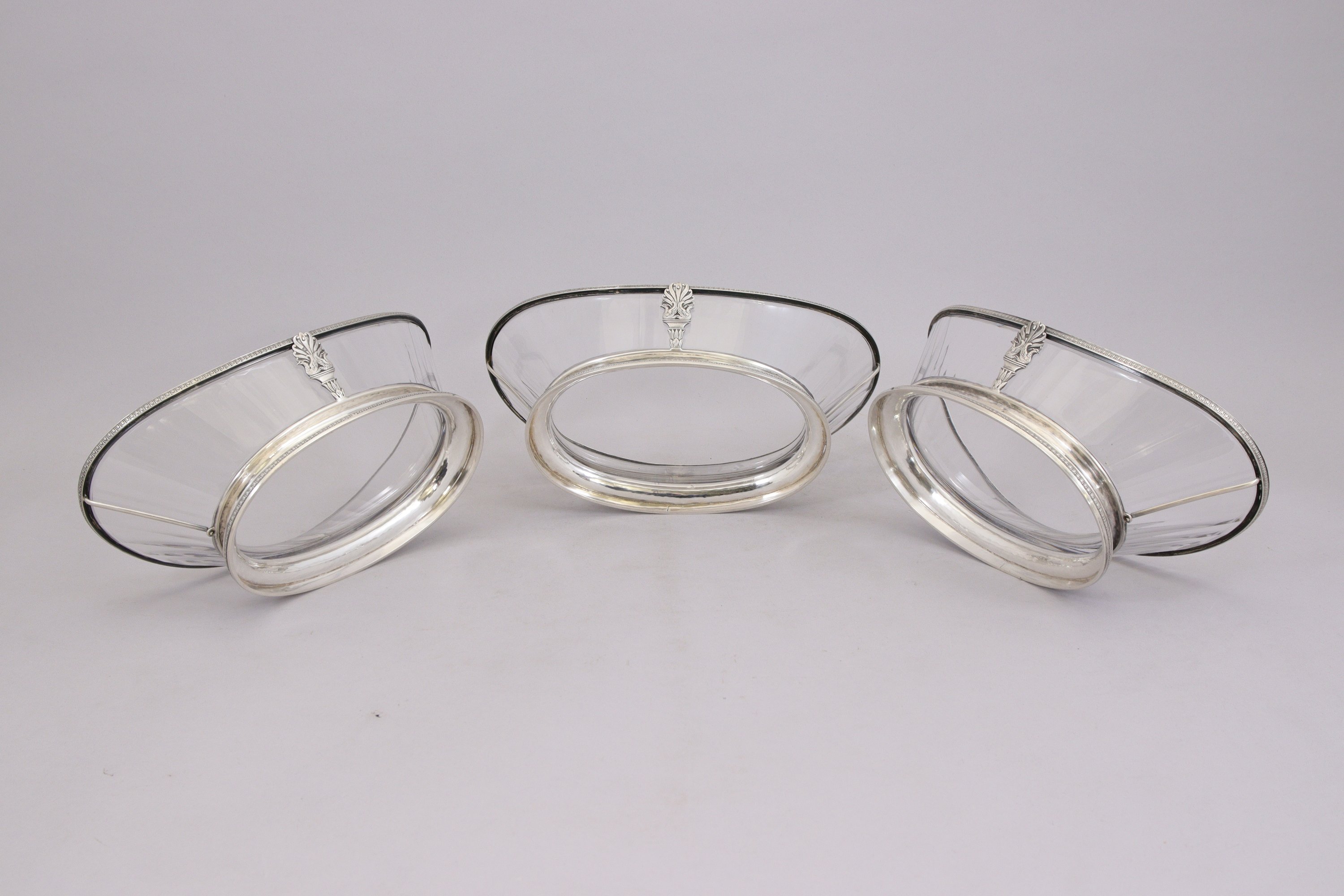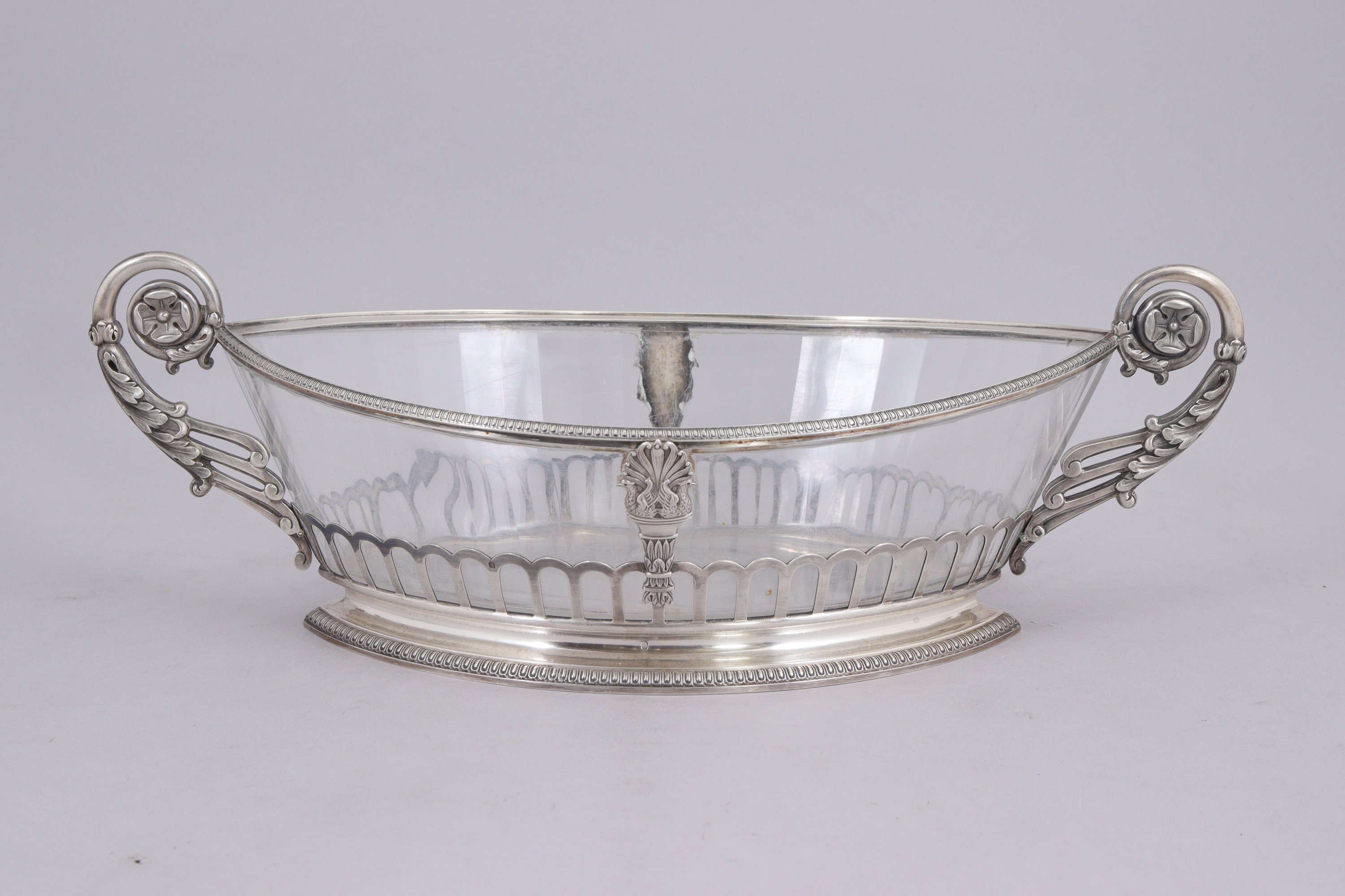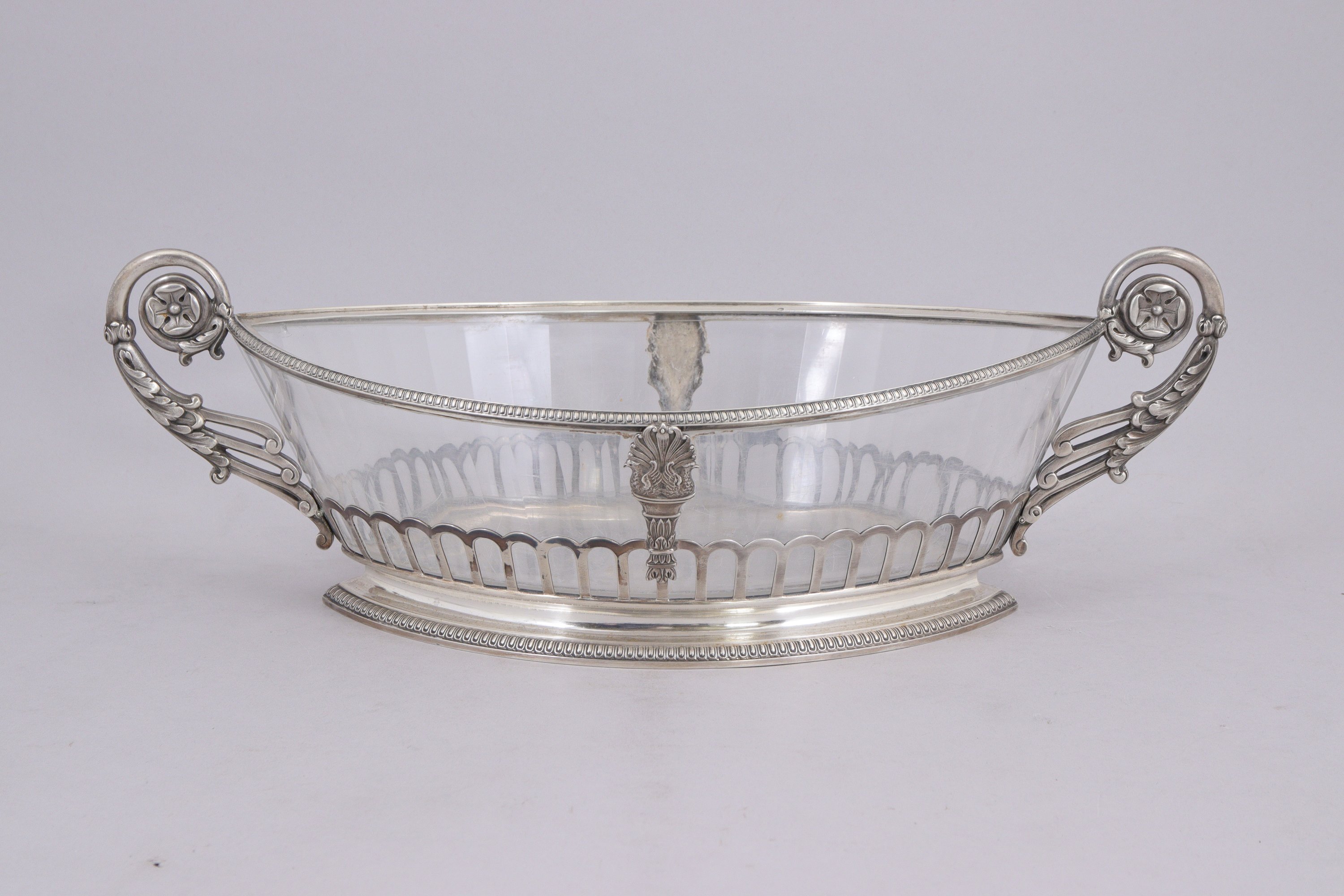 JARDINIÈRE ET TROIS LÉGUMIERS AUX CYGNES de forme navette en cristal taillé et argent. Prises à enroulements feuillagés.