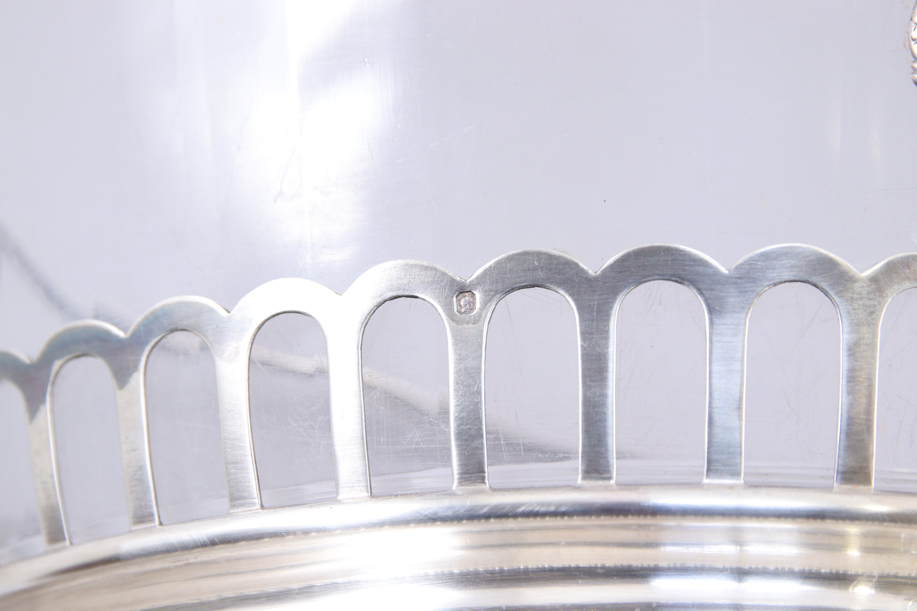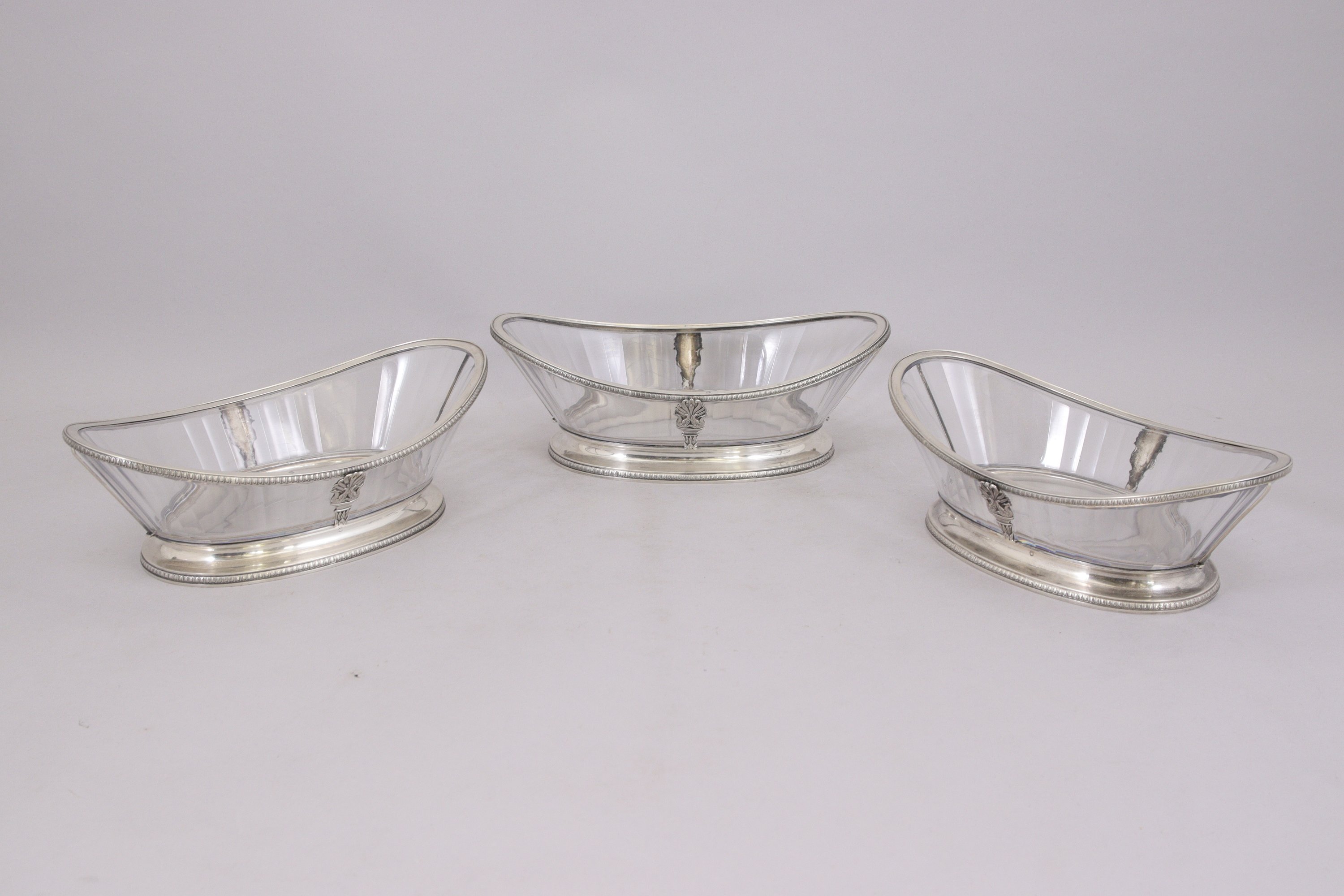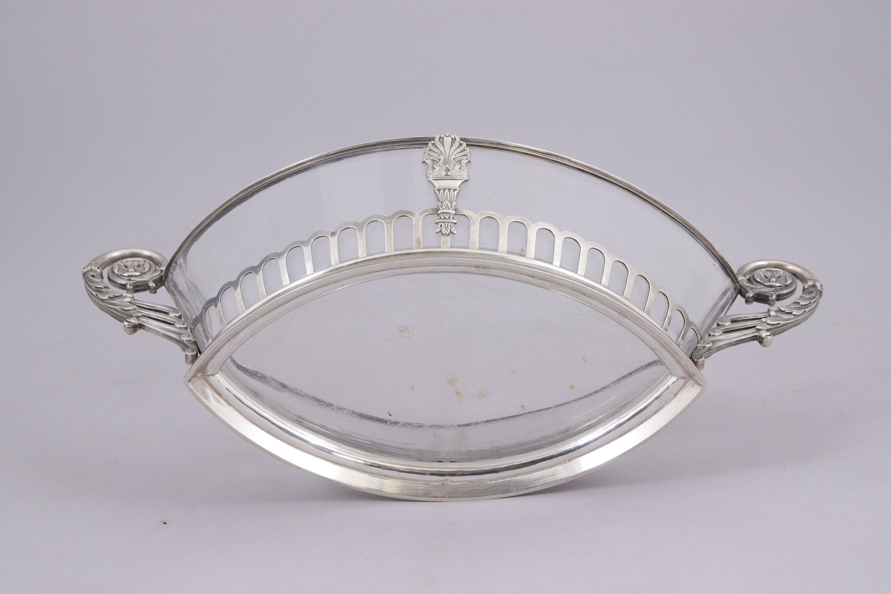 JARDINIÈRE ET TROIS LÉGUMIERS AUX CYGNES de forme navette en cristal taillé et argent. Prises à enroulements feuillagés.