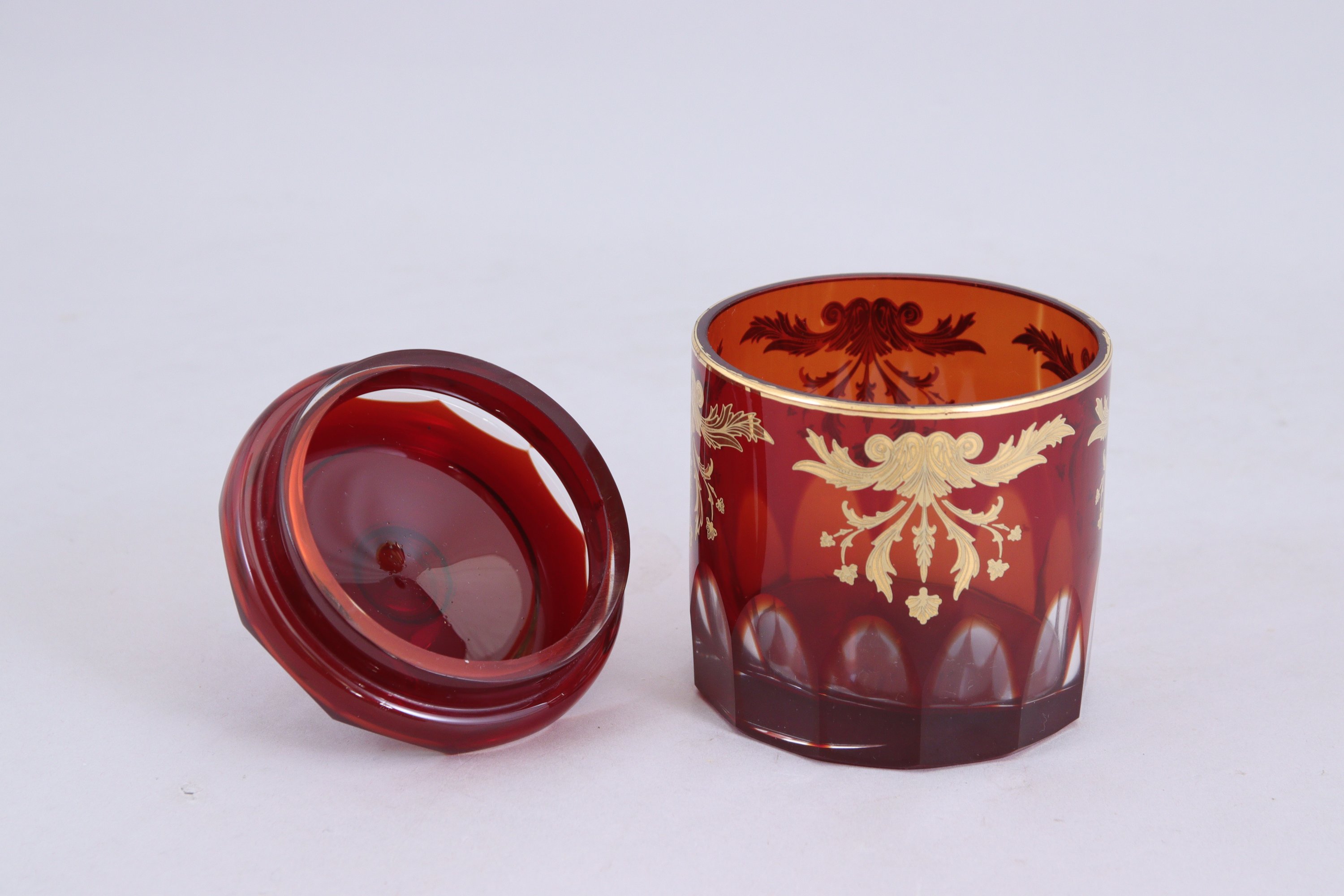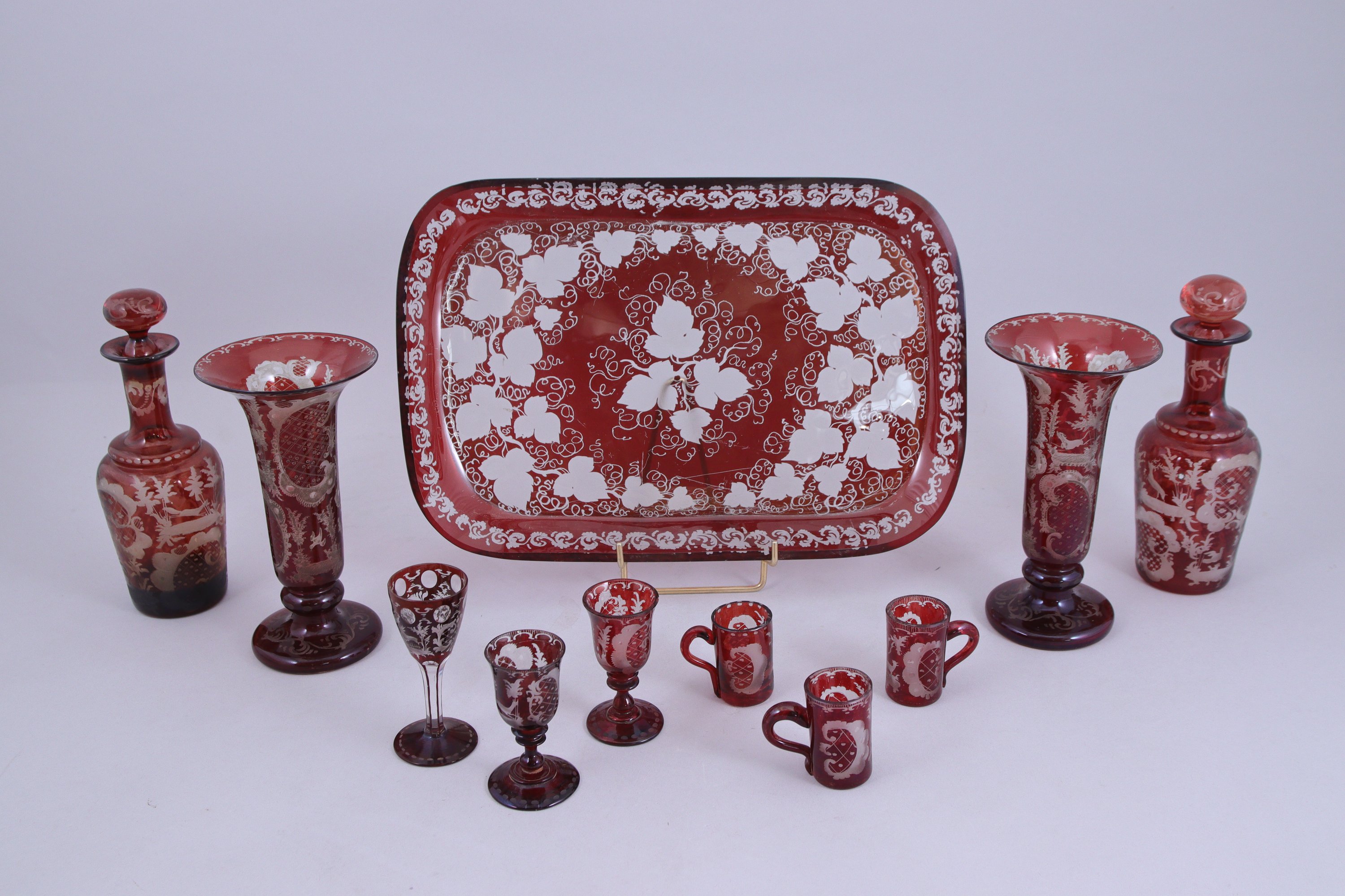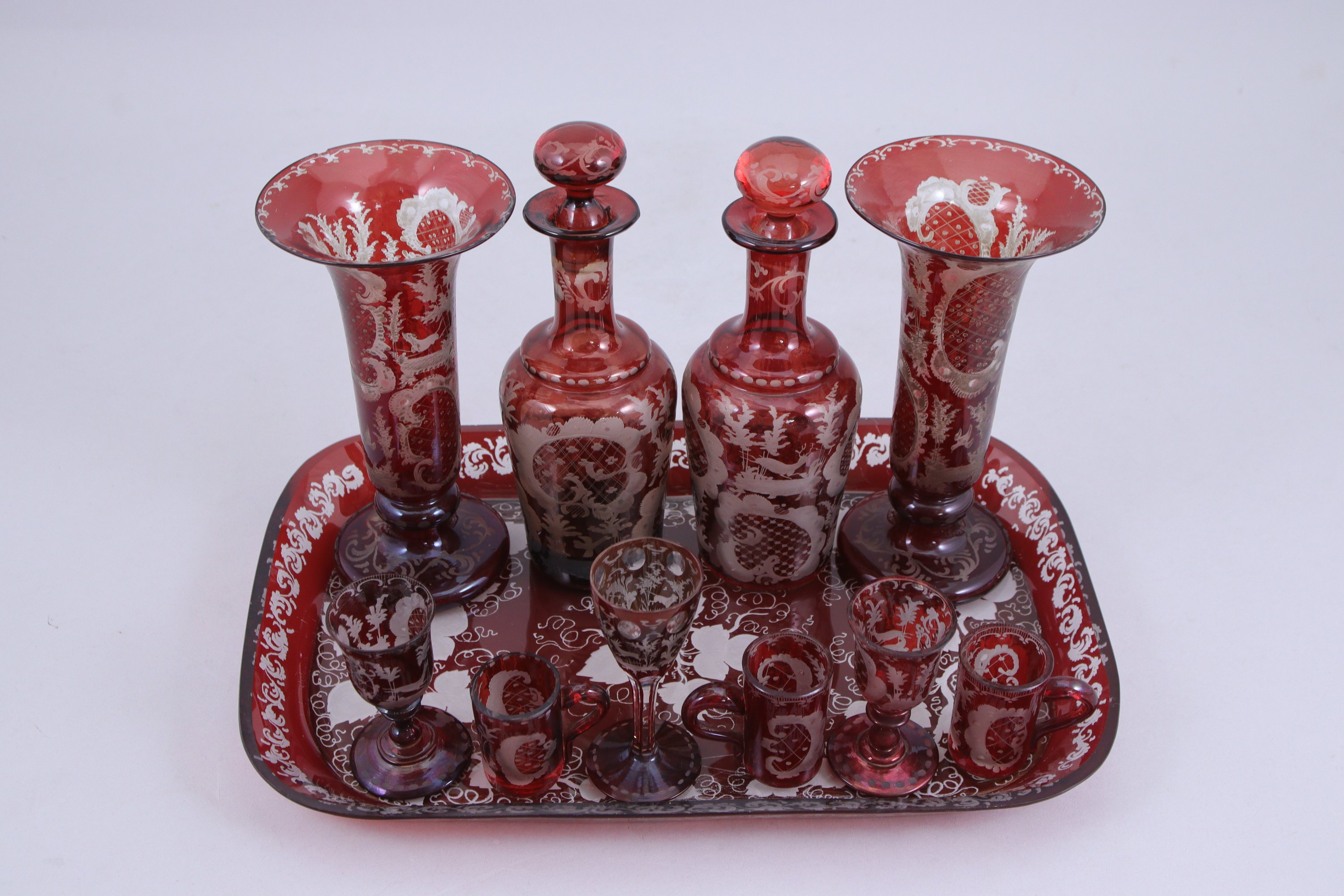 PLATEAU, PAIRE de FLACONS, PAIRE de VASES CORNET, TROIS VERRES SUR PIED, TROIS VERRES GOBELET en CRISTAL dit "de Bohême". Verre rouge travaillé en blanc à décor cinégétique et de treille.