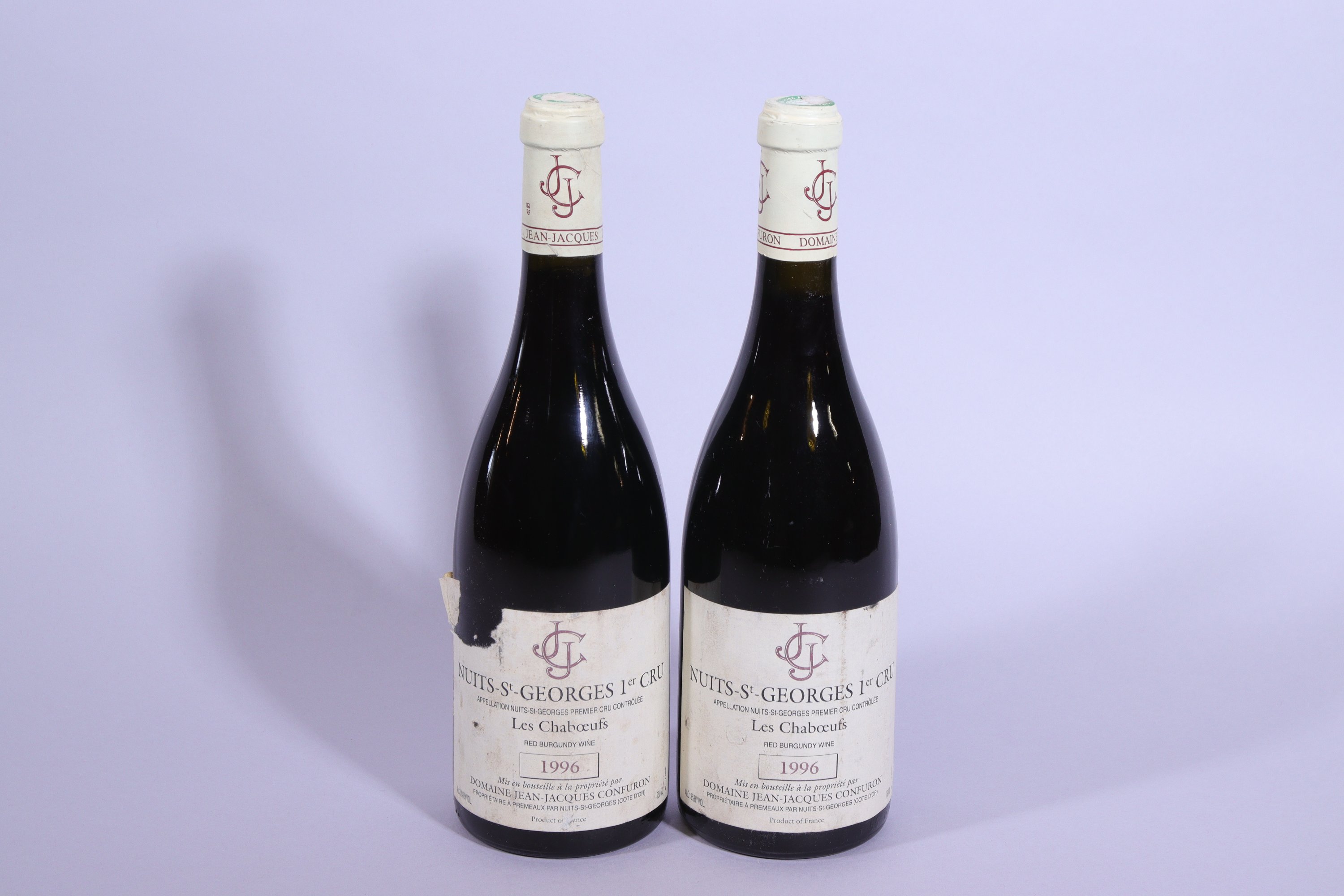 NUITS-SAINT-GEORGES, 1er Cru, Les Chabufs, Jean-Jacques Confuron, 1996, deux bouteilles à 1 et 2 cm, une étiquette déchirée, taches.