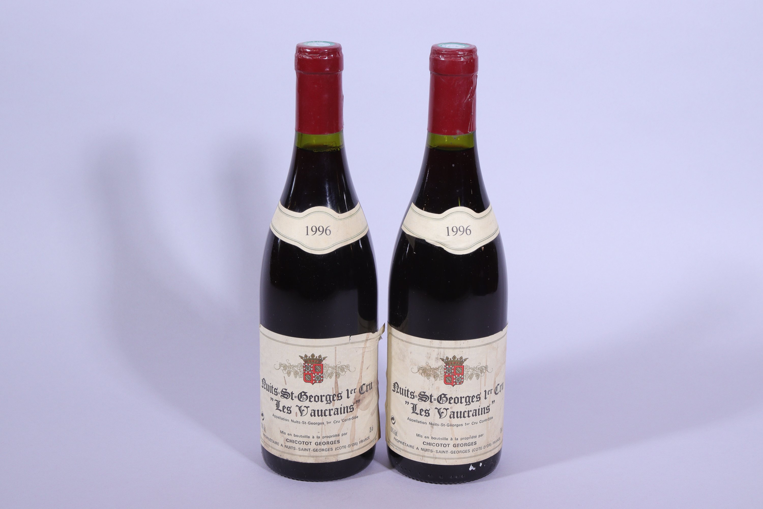 NUITS-SAINT-GEORGES, 1er Cru, Les Vaucrains, Chicotot Georges, 1996, deux bouteilles à 1,5 cm, étiquettes déchirées et tachées.