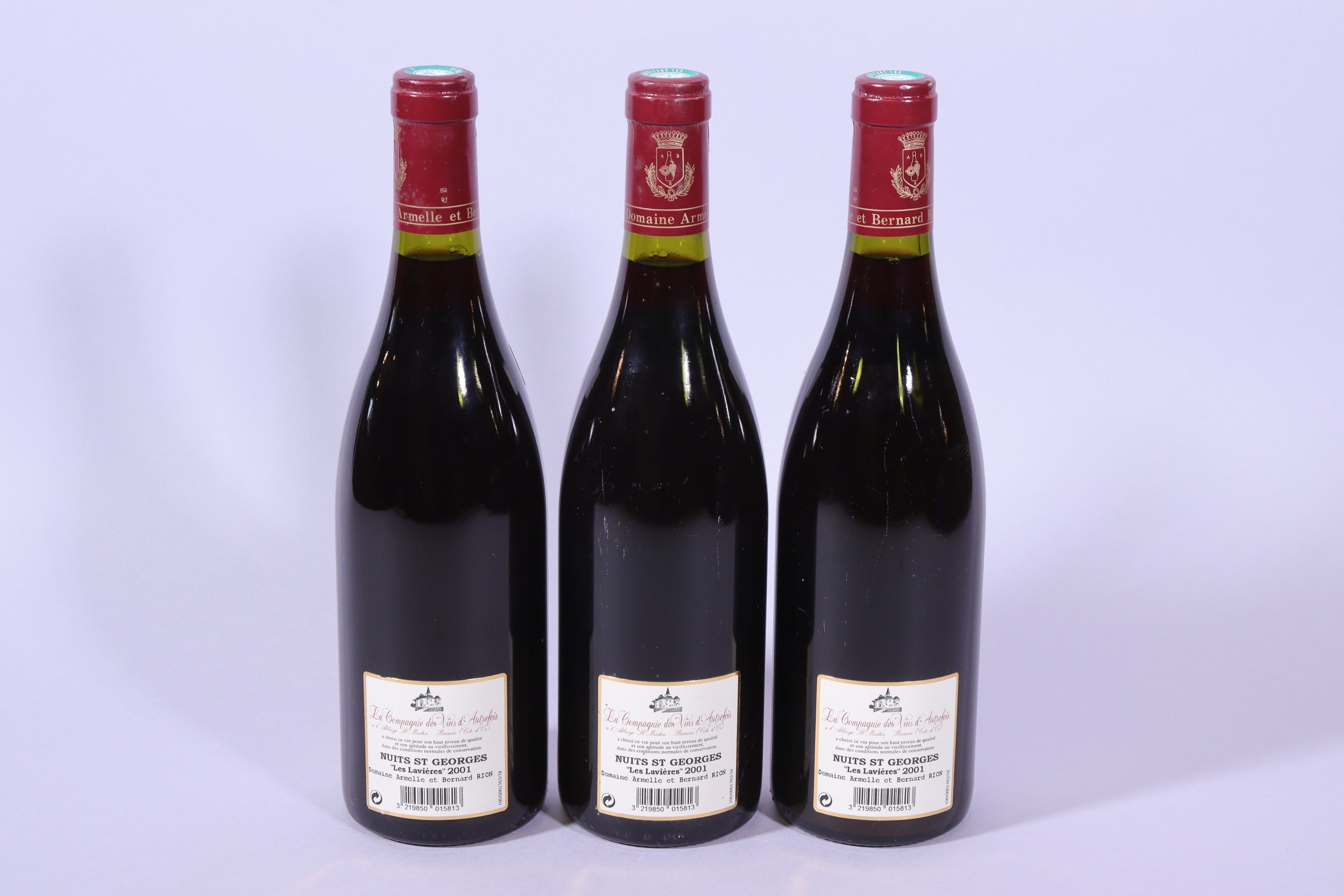 NUITS-SAINT-GEORGES, Vieilles vignes, Les Lavières, Armelle et Bernard Rion, 2001, trois bouteilles dont deux à 1,5 cm et une à 2 cm.