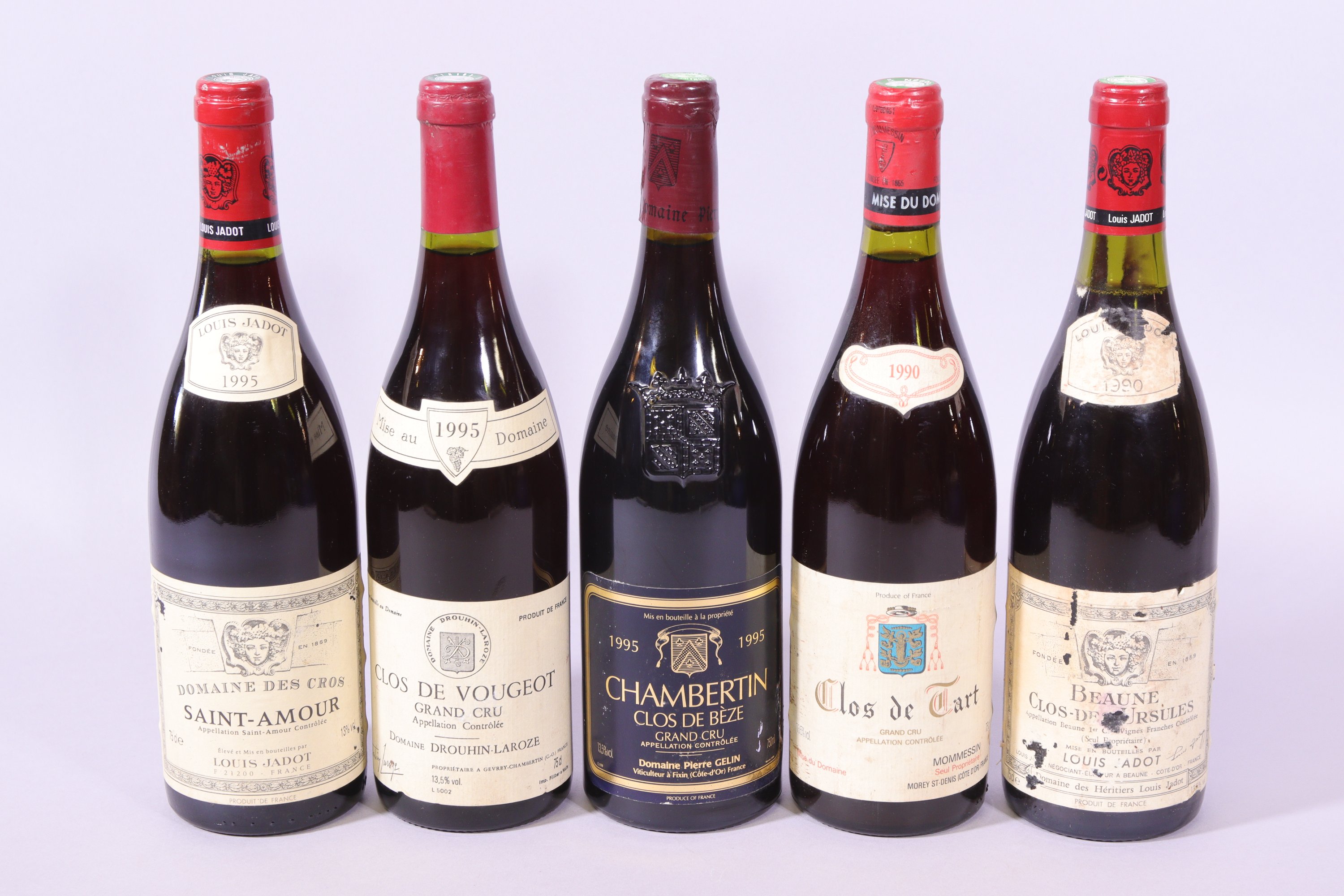 CINQ BOUTEILLES : CLOS de TARTE, Grand Cru, Mommessin, 1990, 1,5 cm ; BEAUNE, CLOS des URSULES, 1er Cru, Louis Jadot, 1990, 3 cm, déchirée ; SAINT-AMOUR, Domaine des Cros, Louis Jadot, 1995, 0,5 cm, déchirée ; CHAMBERTIN, Grand Cru, Clos de Bèze, Pierre Gelin, 1995 ; CLOS de VOUGEOT, Grand Cru, Drouhin-Laroze, 1995, 1 cm.