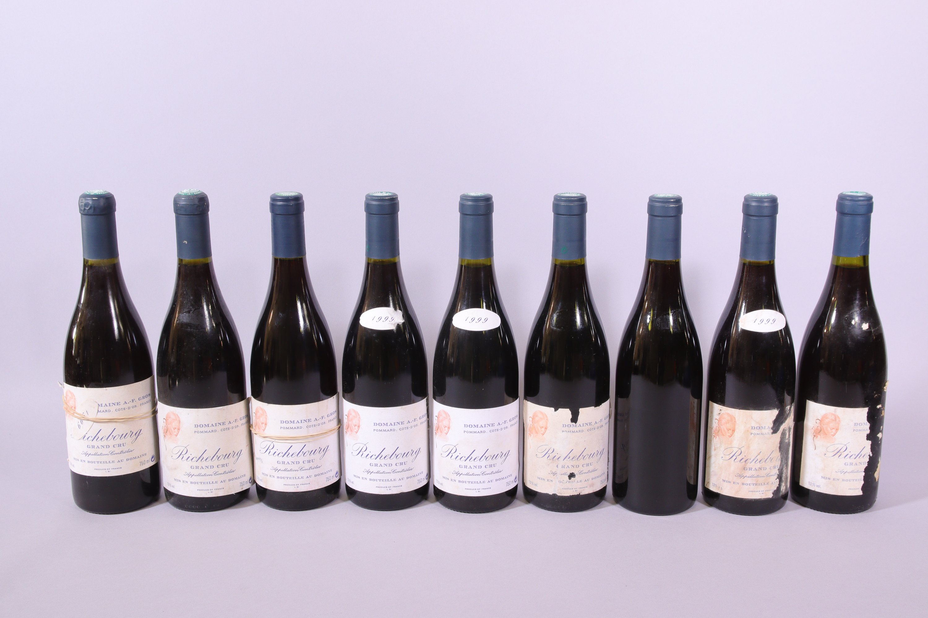 POMMARD, Grand Cru, Richebourg, A.-F. Gros, 1999, neuf bouteilles dont quatre à 0,5 cm, une à 1 cm et une à 2 cm, étiquettes abîmées et partiellement décollées.