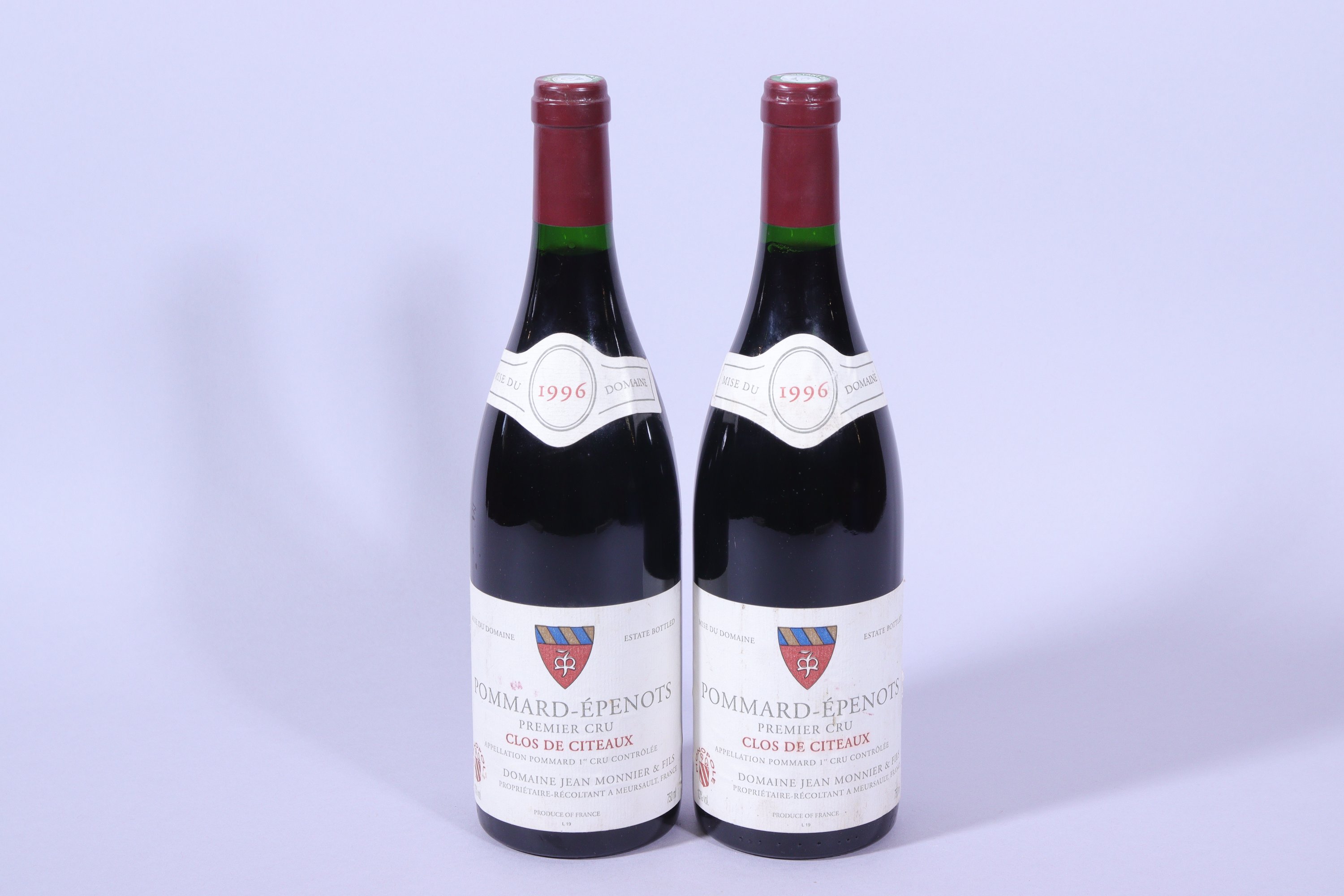 POMMARD, Pommard-Épenots, 1er Cru, Clos des Citeaux, Jean Monnier & Fils, 1996, deux bouteilles à 1 et 1,5 cm, étiquettes déchirées et tachées.