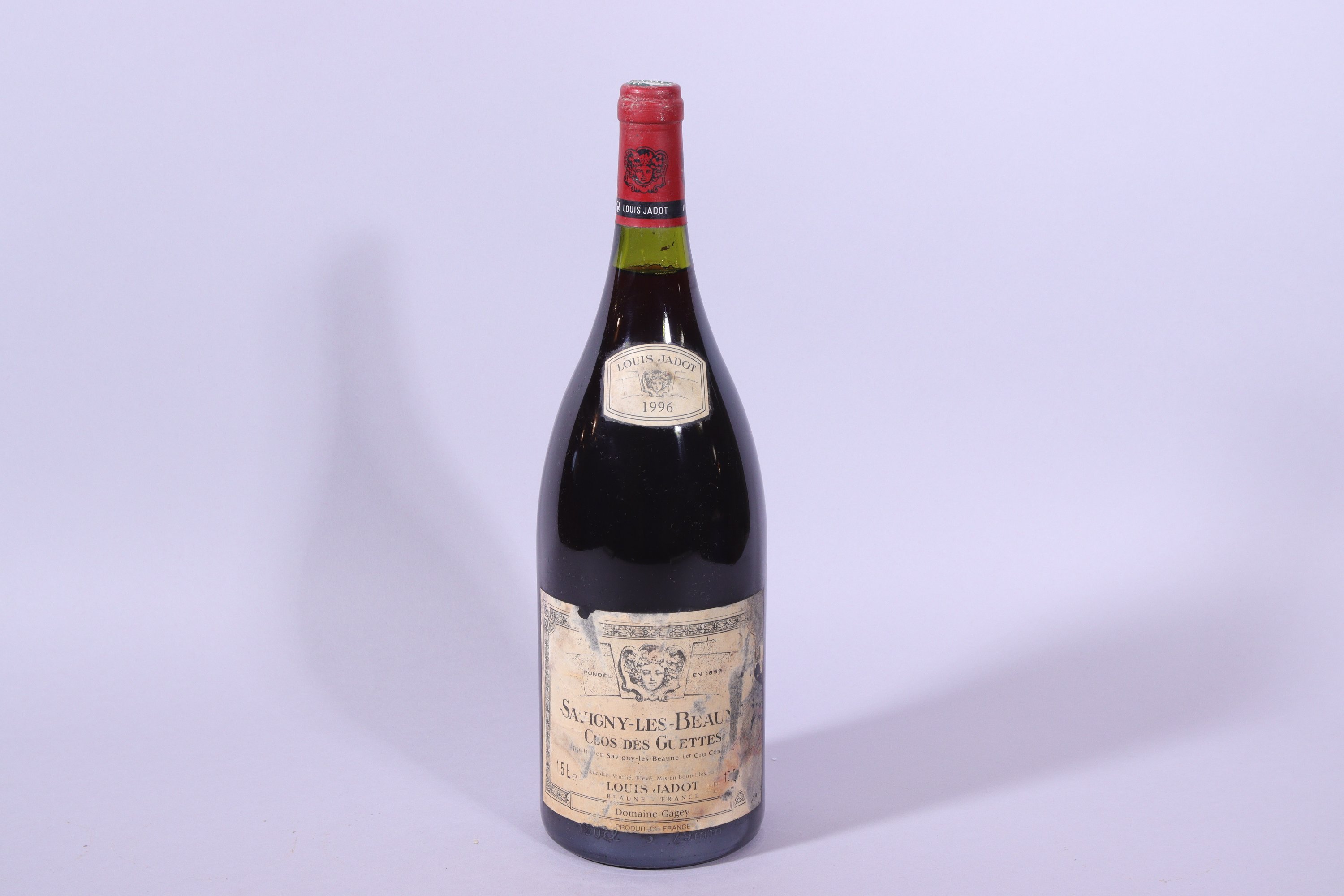 BEAUNE, Savigny lès Beaunes, 1er Cru, Doudet, « Les Guettes », 1996, 1,5 L, 3 cm, étiquette déchirée et tachée.
