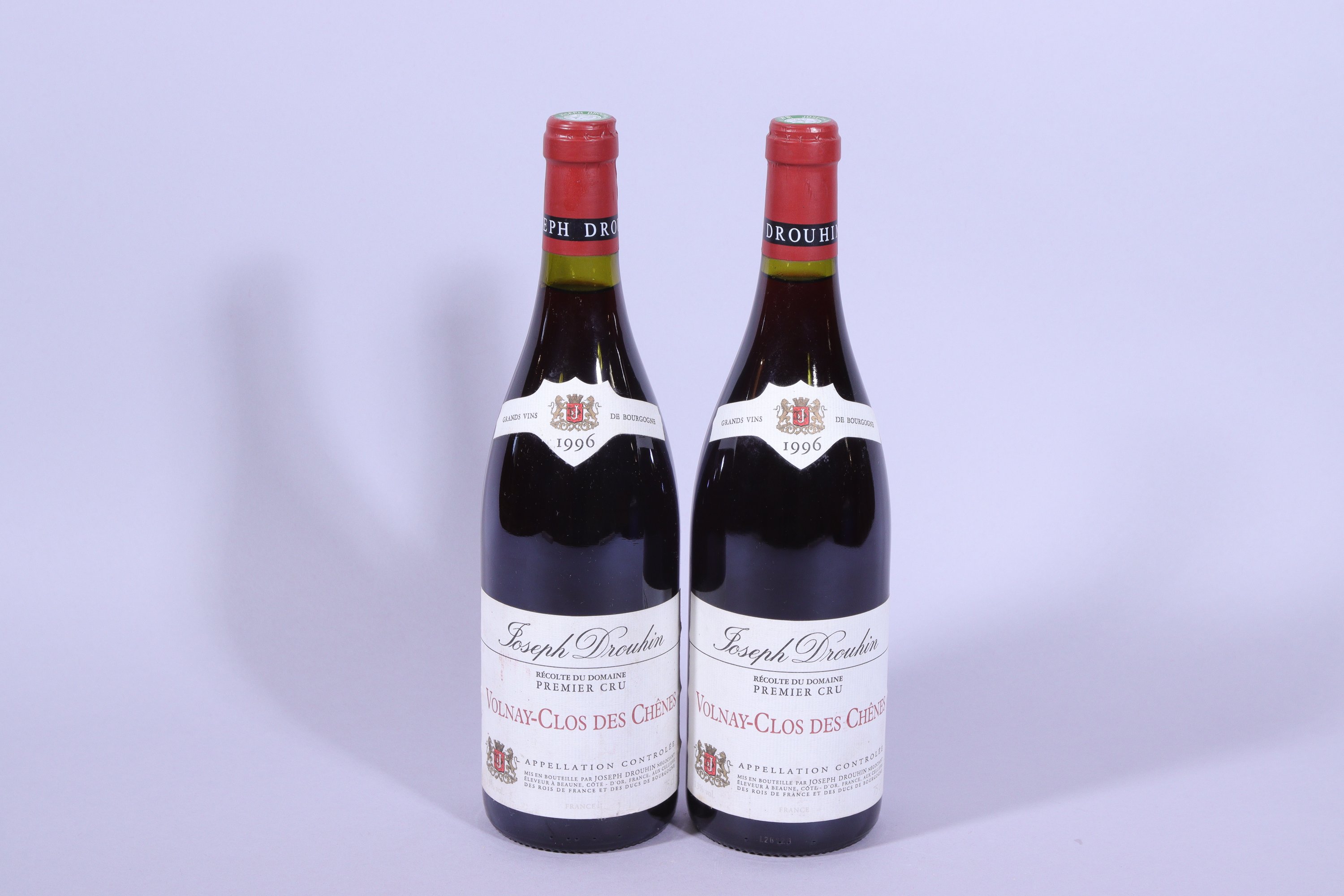 VOLNAY, 1er Cru, Clos des Chênes, Joseph Drouhin, 1996, deux bouteilles, 1 et 2 cm.