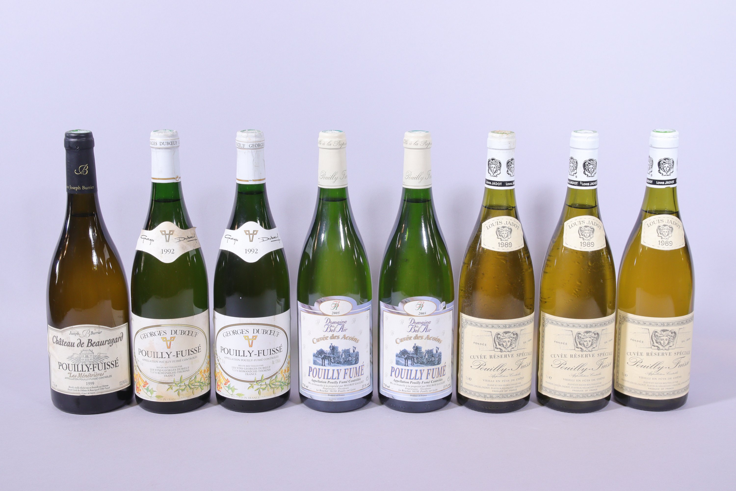 HUIT BOUTEILLES : POUILLY-FUISSÉ, Cuvée Réserve Spéciale, Louis Jadot, 1989, trois bouteilles, 2,5 à 3 cm ; POUILLY-FUISSÉ, Georges Dubuf, 1992, deux bouteilles, 1,5 à 3 cm, étiquettes abimées ; POUILLY-FUISSÉ, Château de Beauregard, « Les Ménétrières », Joseph Burrier, 1999, une bouteille, 3 cm, étiquette abimée ; POUILLY FUMÉ, Domaine de Bel Air, Cuvée des Acoins, 2005, deux bouteilles, 2 cm.