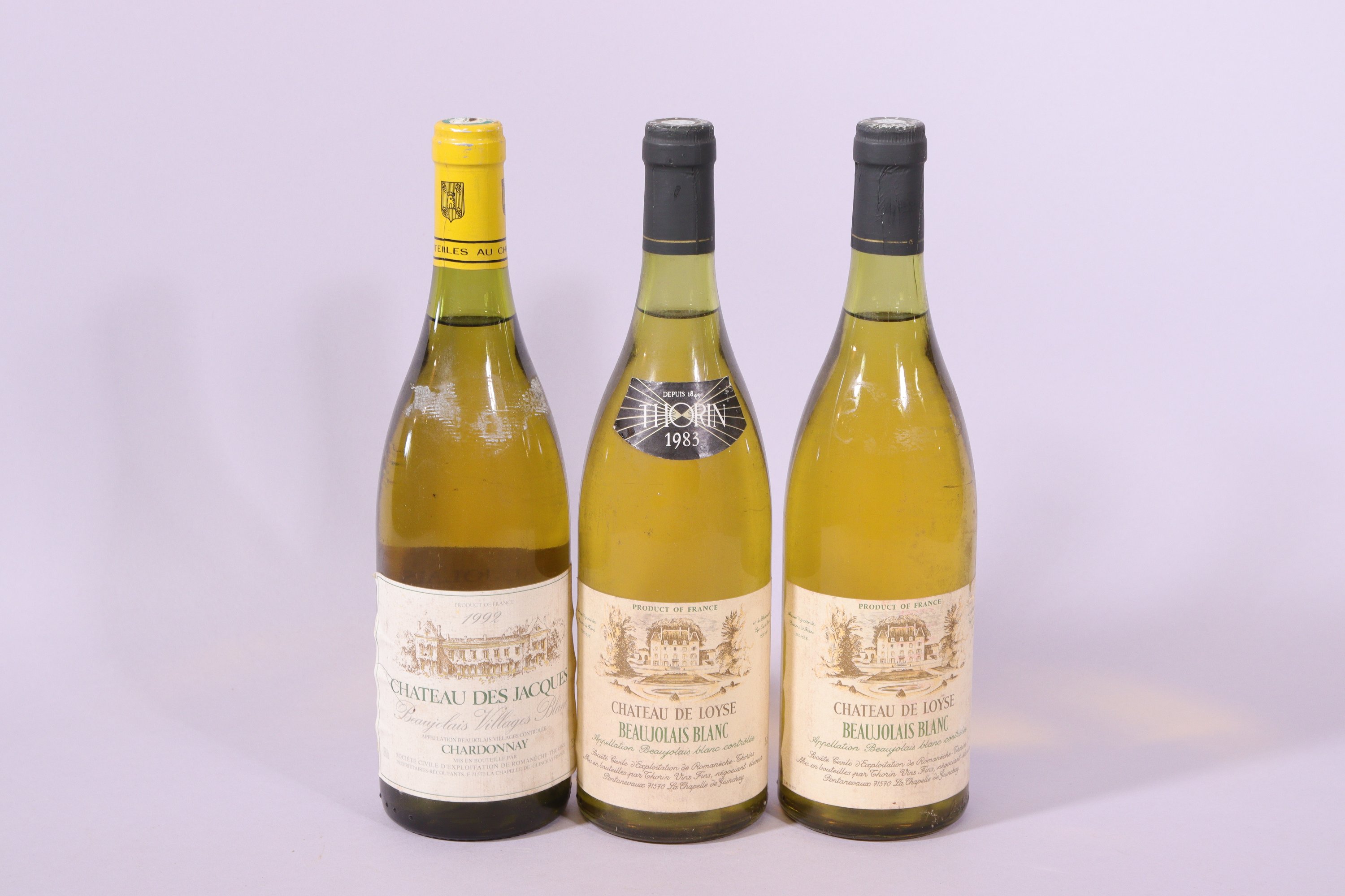 JOINTS : TROIS BOUTEILLES, BEAUJOLAIS BLANC, Château de Loyse et Château des Jacques, de 1983 à 1992, 3 à 3,5 cm, étiquettes abîmées.