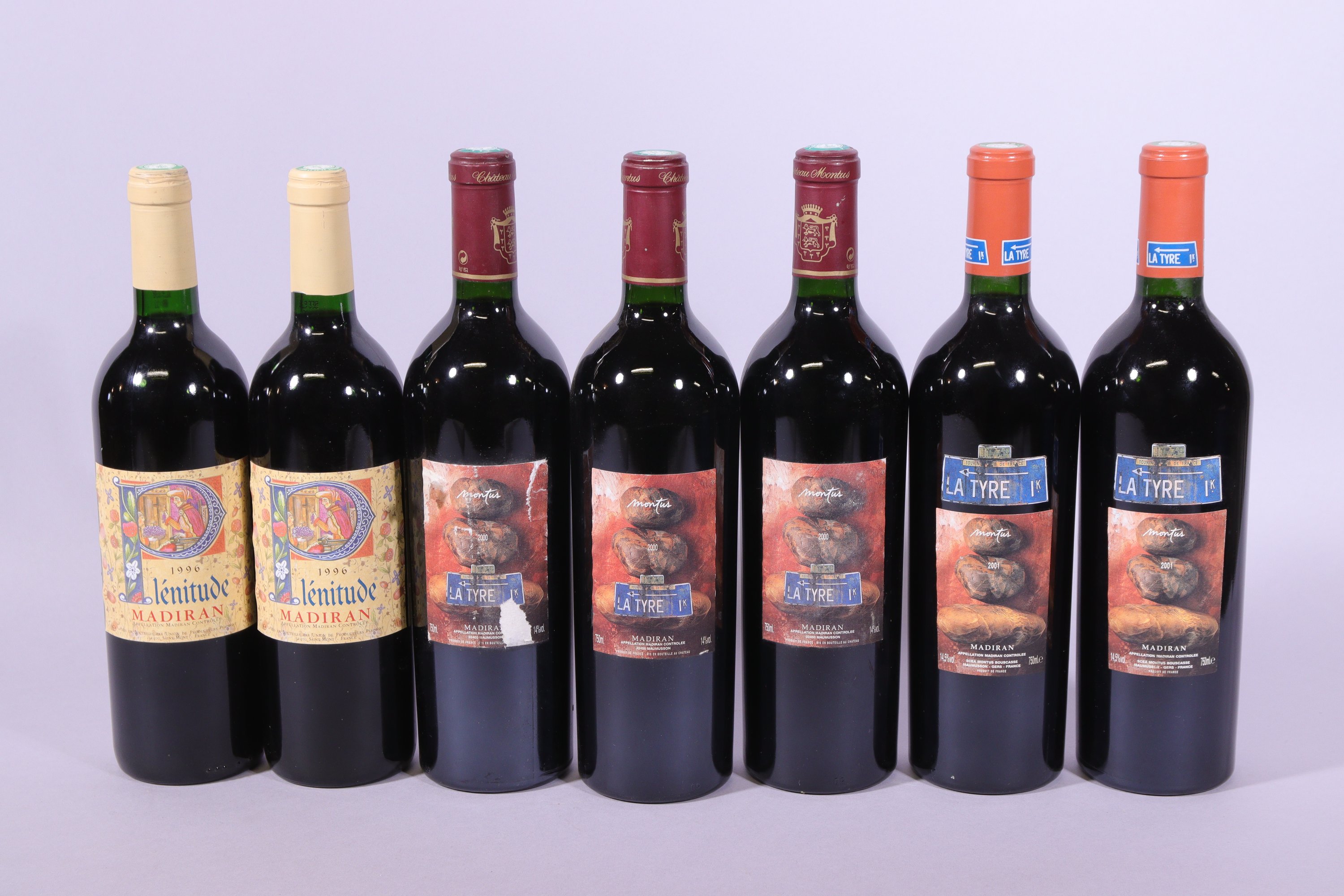 SEPT BOUTEILLES : MADIRAN, Plénitude, deux bouteilles de 1996 ; MADIRAN, Château Montus, La Tyre Ik, trois bouteilles de 2000 (une étiquette déchirée) et deux bouteilles de 2001.