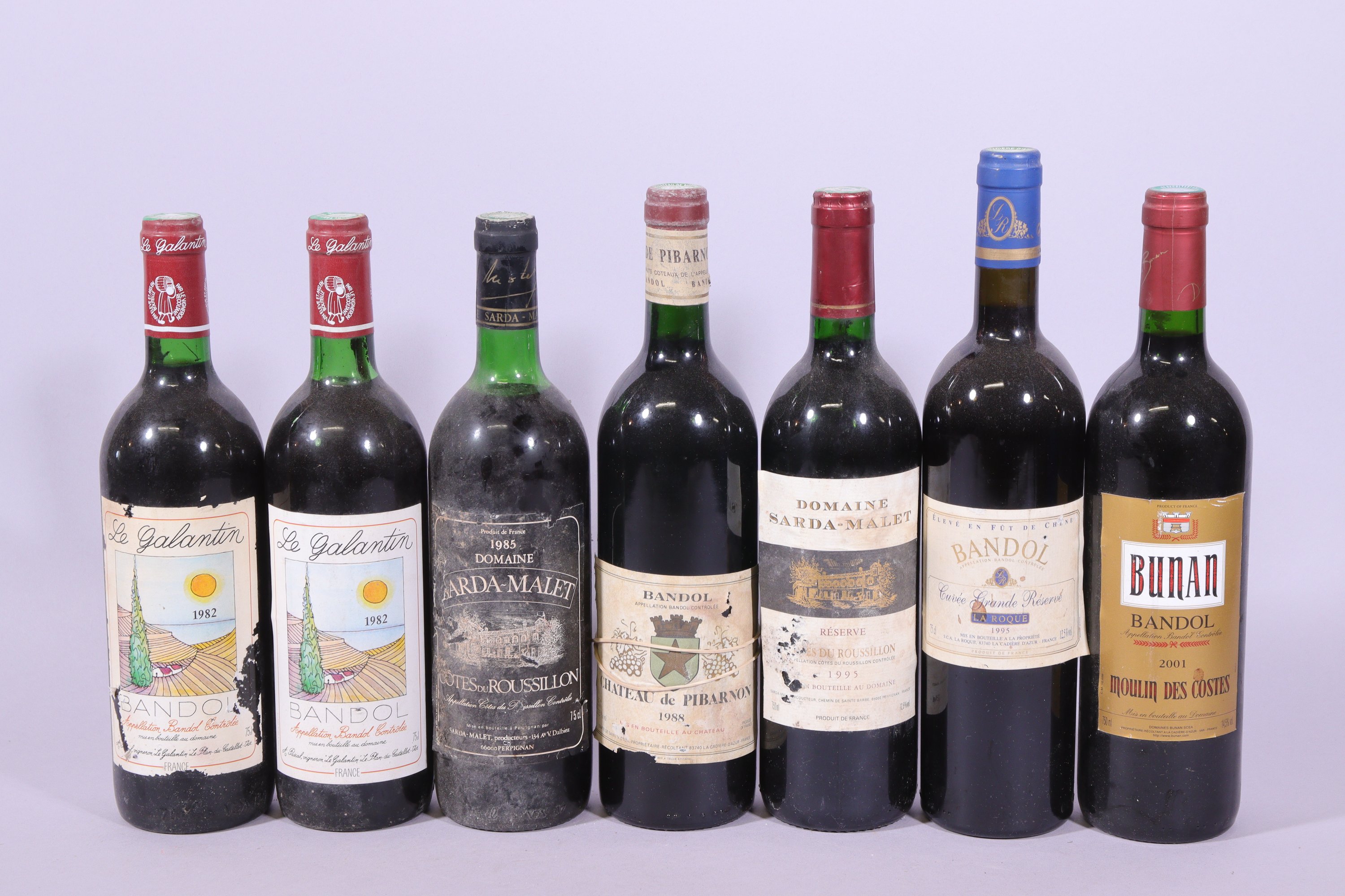 VINGT BOUTEILLES : BANDOL, Château Pradeaux, Les héritiers du Comte Portalis, trois bouteilles de 1998 étiquettes endommagées ; BANDOL, Domaine Ott, Château Romassan, trois bouteilles de 1990, étiquettes endommagées ; BANDOL, Le Galantin, A. Pascal, deux bouteilles de 1982, lune TLB, étiquettes endommagées ; BANDOL, Moulin des Costes, Bunan, une bouteille de 2001 ; BANDOL, Château de Pibarnon, Comte de Saint-Victor, 1988, étiquette endommagée et décollée ; BANDOL, La Roque, Cuvée Grande Réserve, 1995 ; RANCIO SEC, Cap de Creus, La Tour Vielle, Vincent Cantié et Christine Campadieu, sept bouteilles, étiquettes endommagées ; CÔTES du ROUSSILLON, Réserve, Domaine Sarda-Mallet, 1995, étiquette endommagée ; CÔTES du ROUSSILLON, Domaine Sarda-Mallet, 1985, étiquette endommagée.