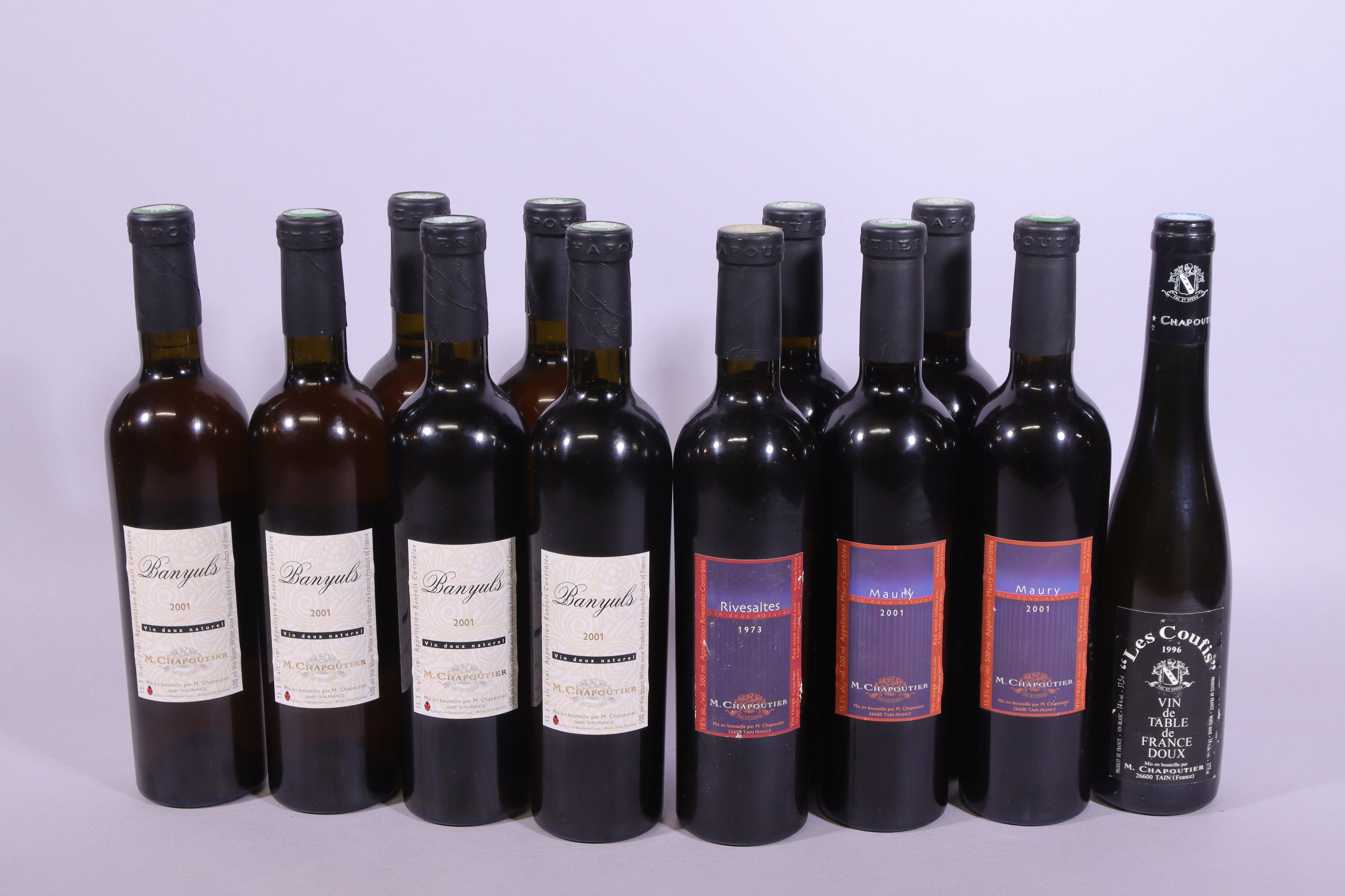 JOINTS : BANYULS, Domaine de La Rectorie, Cuvée Elisabeth, 50 cl, BANYULS, Terra Vinya, M. Chapoutier, 1998, étiquette endommagée ; BANYULS, M. Chapoutier, 2001, 50 cl, six bouteilles, étiquettes endommagées ; MAURY, M.Chapoutier, 2001, 50 cl, six bouteilles, étiquettes endommagées ; Les Coufis, Vin de Table de France Doux, 1996, 50 cl, étiquettes endommagées.