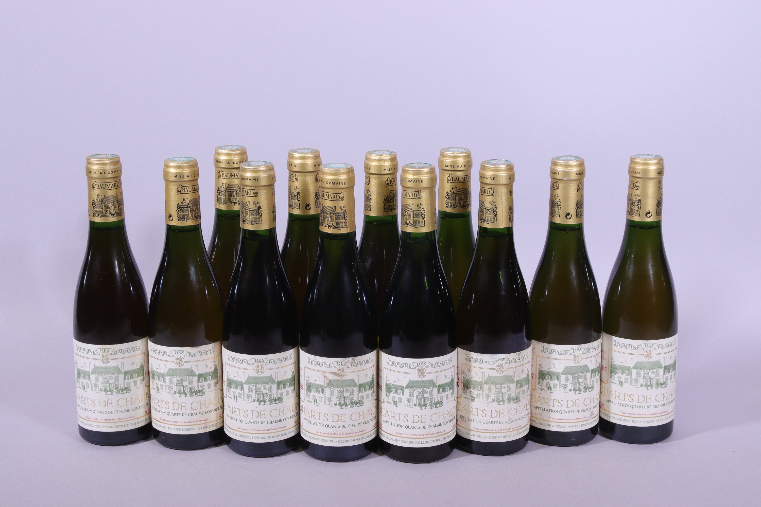 JOINTS : SAVENNIÈRES, Domaine des Baumard, Clos du Papillon, sept bouteilles de 1997 à 1,5 à 2,5 cm, quatre bouteilles de 2003 et quatre de 2005 ; QUARTS de CHAUME, Domaine des Baumard, 1997, douze fillettes, env. 1 cm, étiquettes abimées.