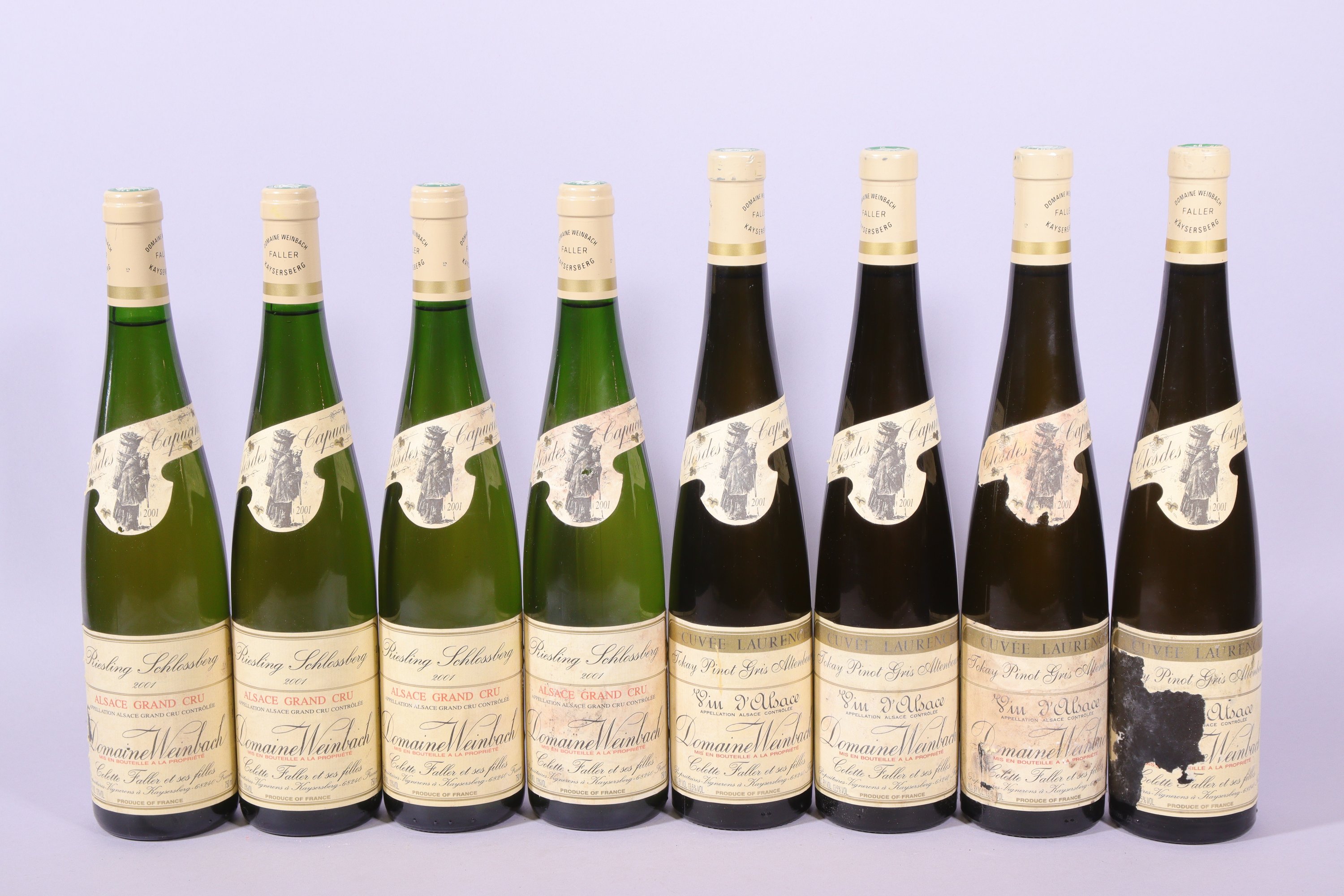 ALSACE, Grand Cru, Riesling Schlossberg, Domaine Weinbach, Clos des Capucins, Collette Faller et ses fils, 2001, huit bouteilles, 0,5 à 2 cm, étiquettes abimées.