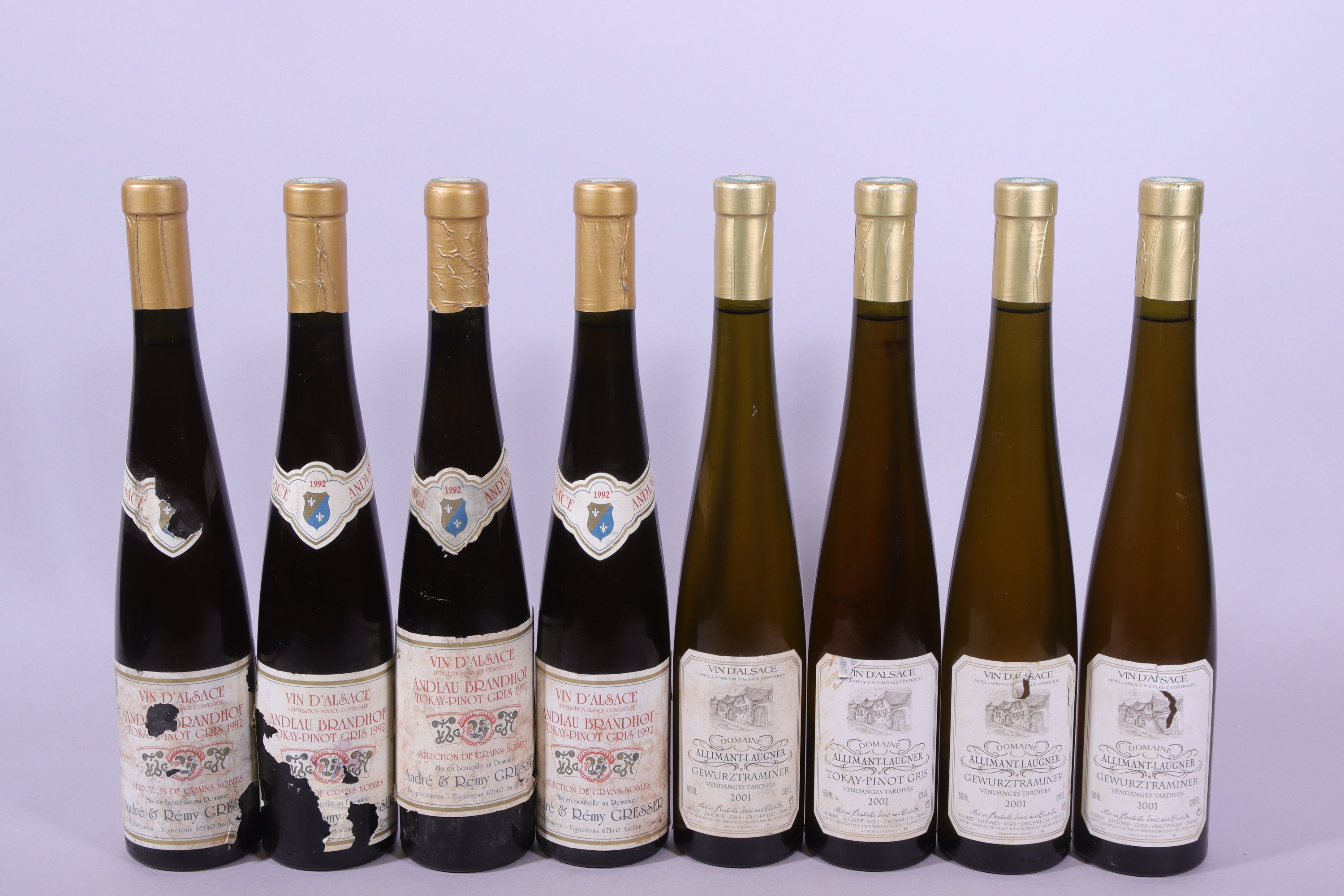 HUIT BOUTEILLES : ALSACE, Tokay-Pinot Gris, Andlau Brandhof, André & Rémy, 1992, quatre bouteilles, 50 CL, 2 cm, étiquettes abimées ; ALSACE, Gewurztraminer, Allimant-Laugner, 2001, quatre bouteilles, 50 CL, 1 à 2 cm.