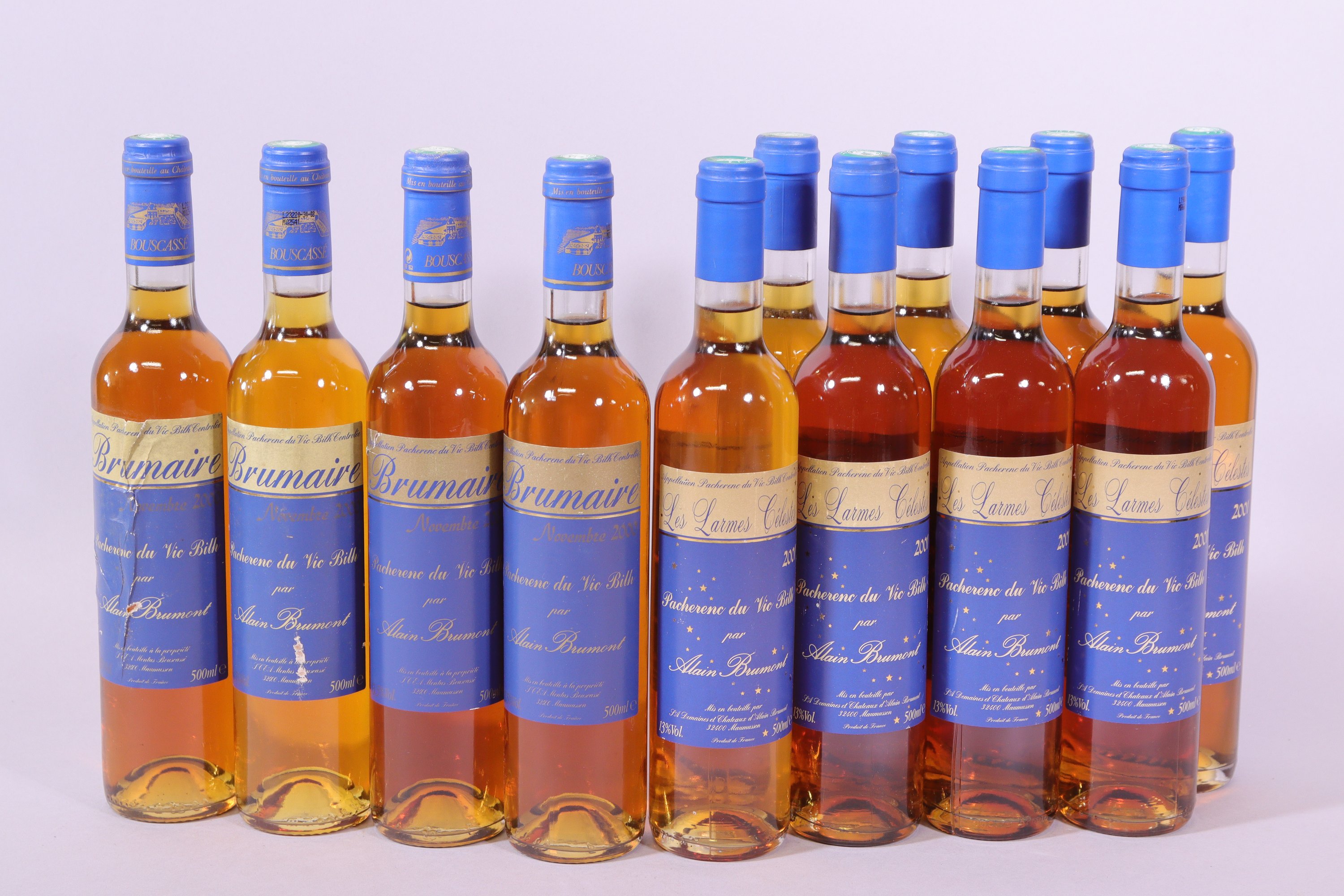 DOUZE BOUTEILLES : PACHERENC du VIC BILH, Alain Brumont, Les Larmes Célestes, 2001, huit bouteilles, étiquettes endommagées ; PANCHERENC du VIC BILH, Alain Brumont, Brumaire, 2000, quatre bouteilles, étiquettes endommagées.