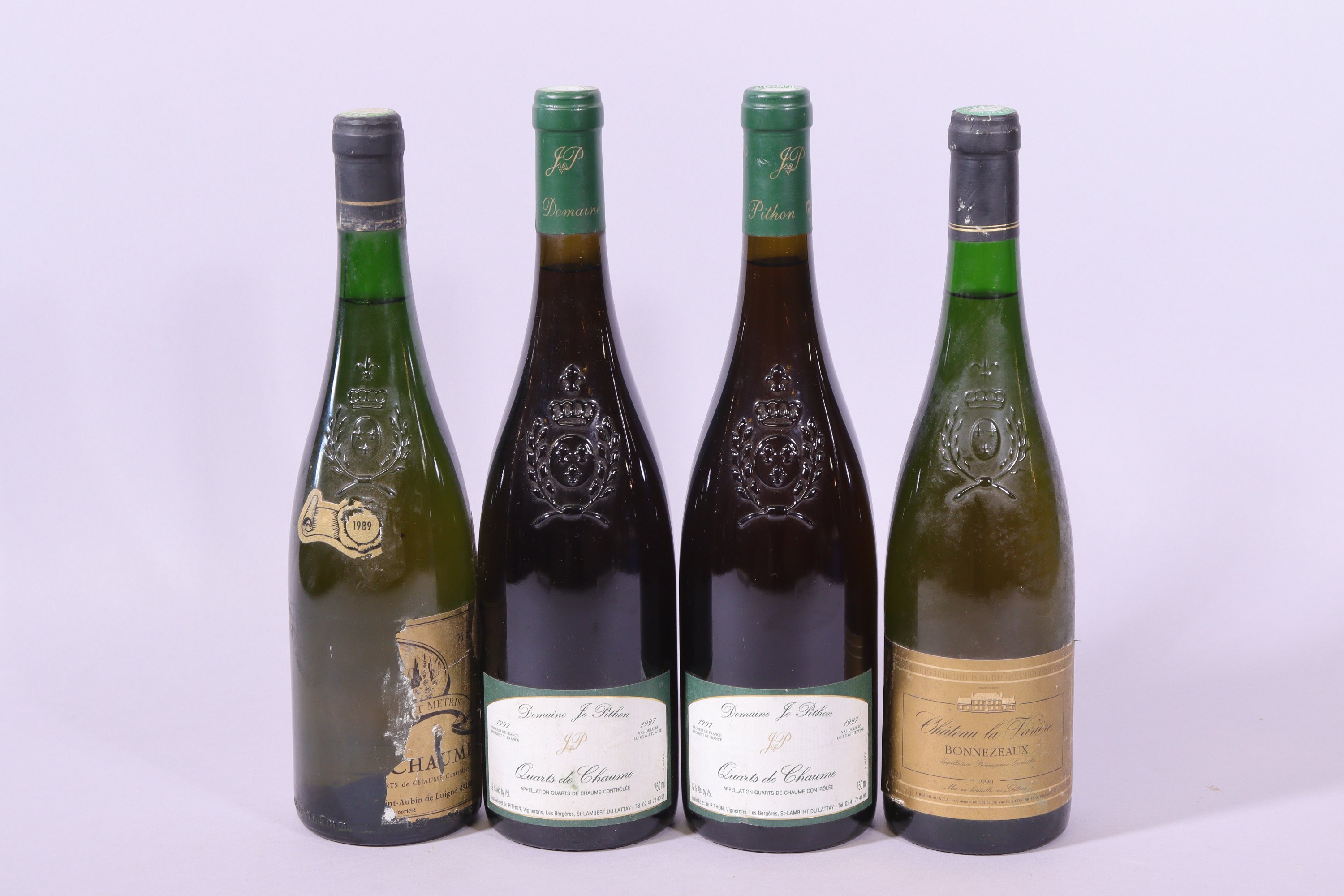 QUATRE BOUTEILLES : BONNEZEAUX, Château la Varière, 1990, deux bouteilles, 3 cm, étiquettes abimées ; QUARTS de CHAUME, Domaine Jo Pithon, deux bouteilles, 2 cm, étiquettes abimées.
