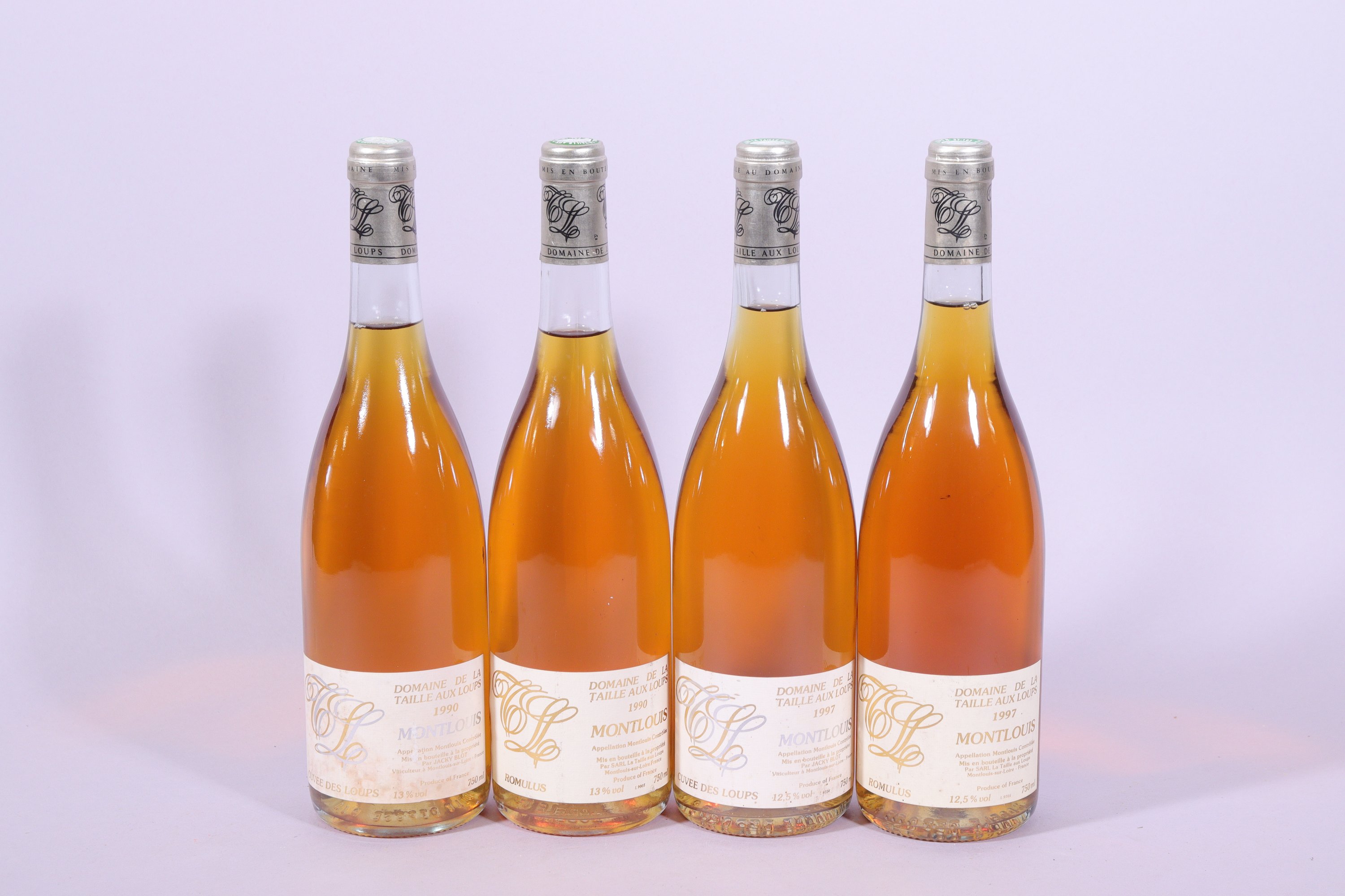 MONTLOUIS, Domaine de la Taille aux Loups, Jacky Blot, 1990, quatre bouteilles, 2 à 4 cm, étiquettes abîmées.