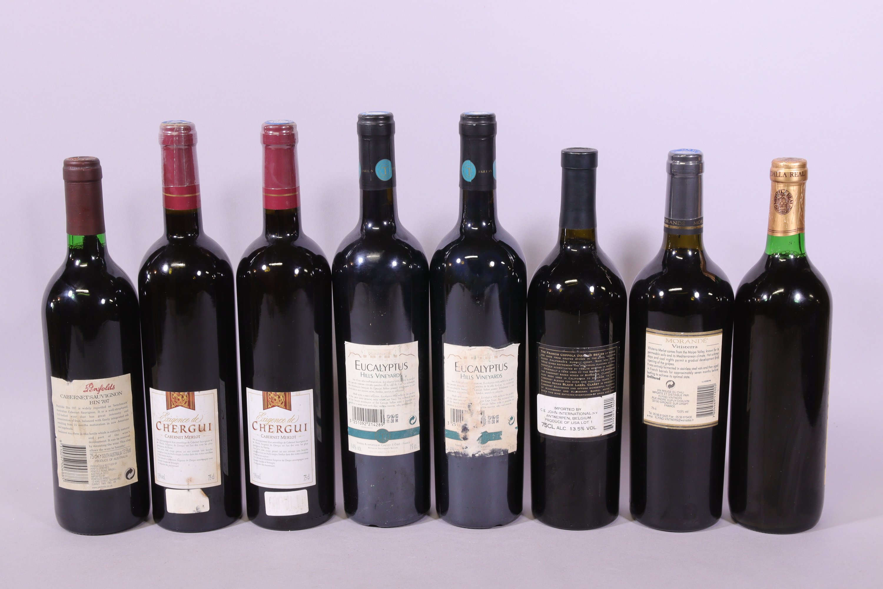 HUIT BOUTEILLES de VINS ROUGE « TOUR du MONDE », 1 à 3,5 cm, étiquettes abîmées.