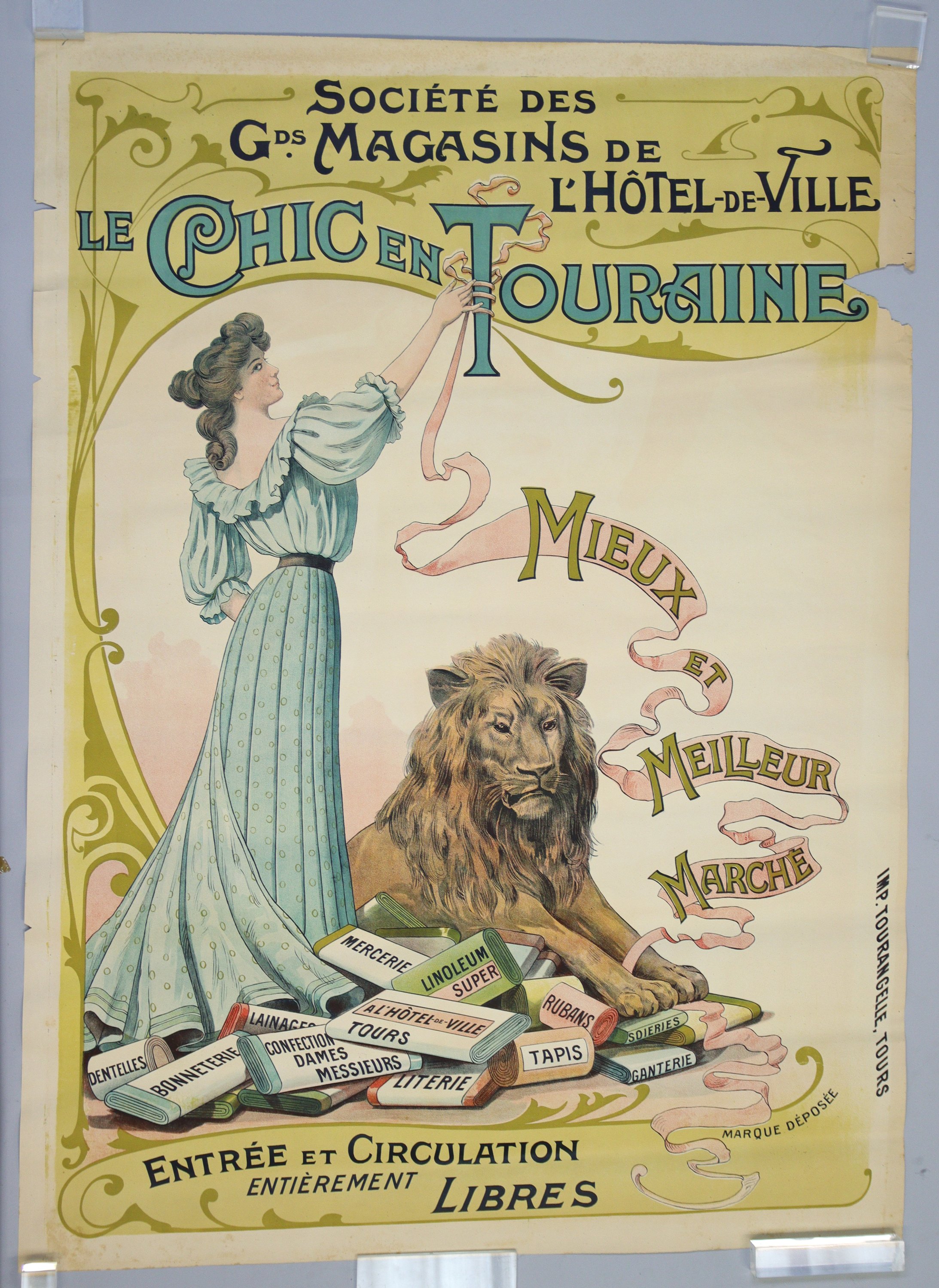 "Société des Gds Magasins de lHôtel de Ville / LE CHIC EN TOURAINE / Mieux et meilleur marché". Epreuve originale imprimée en couleurs. "Imp. Tourangelle, Tours". Rare exemplaire.