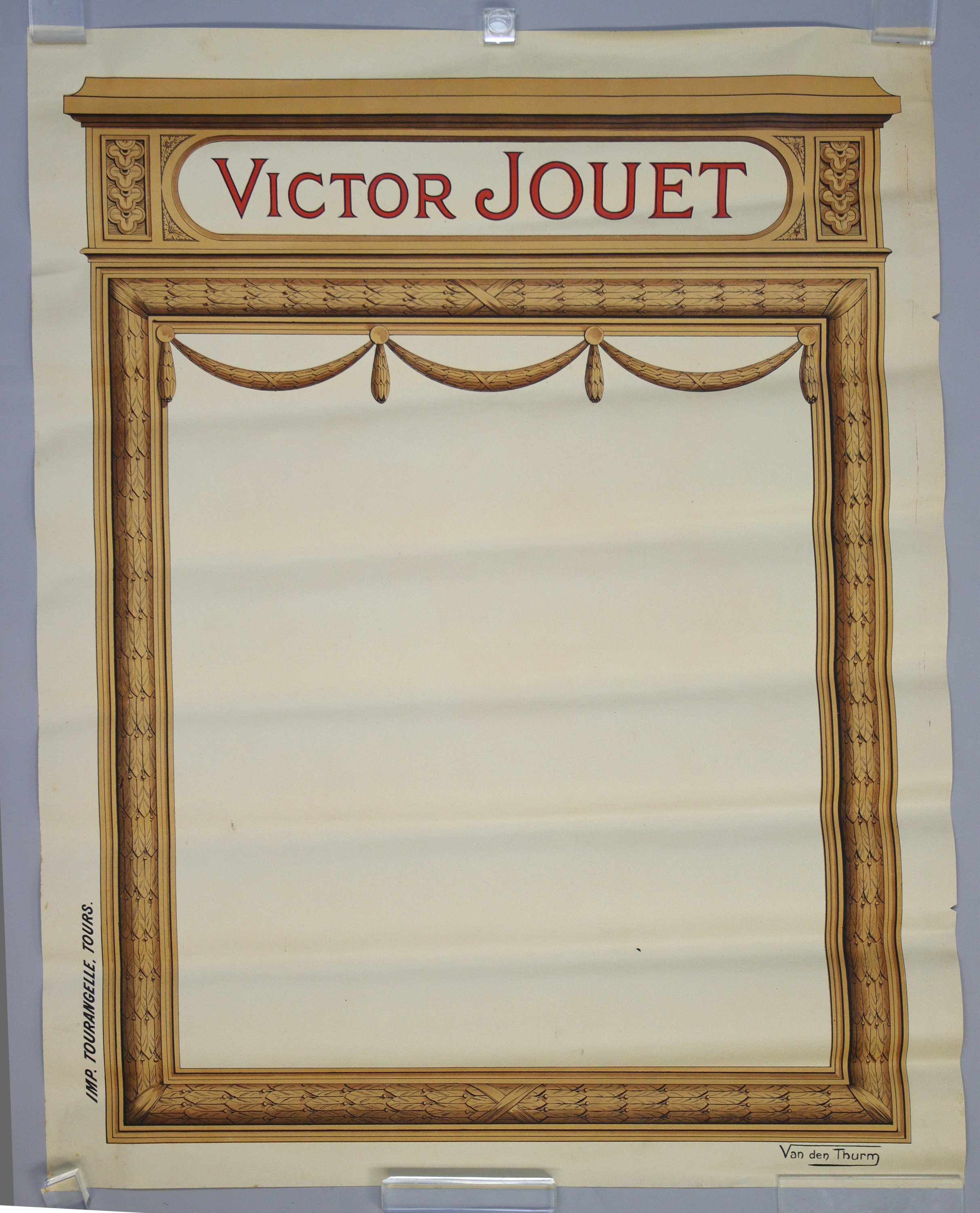 "VICTOR JOUET". Vers 1900. Epreuve originale avant la lettre (sur laffiche finalisée, on peut y lire en plus : Fabriques de meubles / Décoration Literie Tapis / TOURS Boulevard Heurteloup 13-15-17) imprimée en couleurs. "Imp. Tourangelle, Tours". Bel exemplaire.