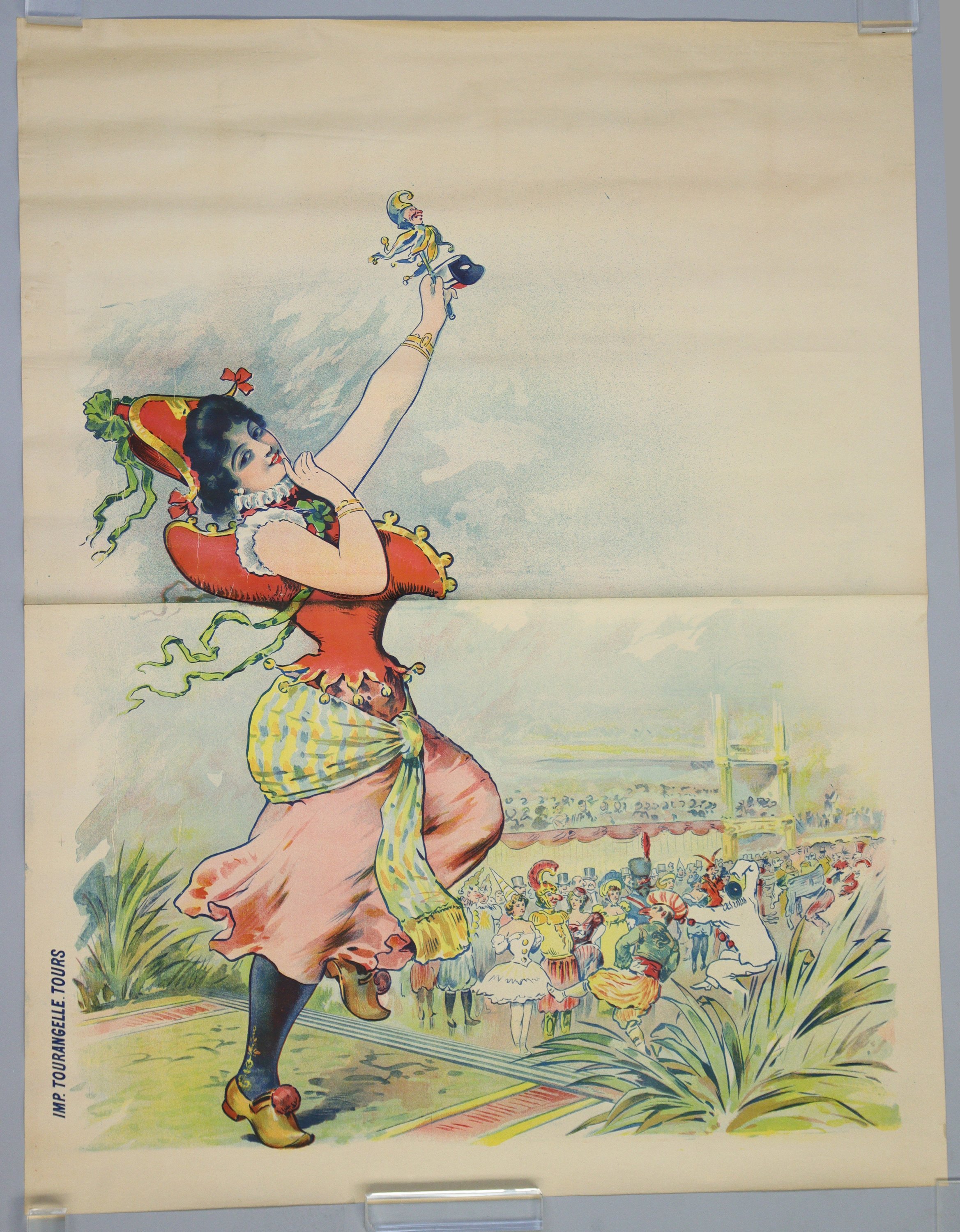 Joint : 2 affiches : Louis Adolphe dAuvergne (1850- ?) "GRANDES FÊTES ORGANISEES PAR LA PRESSE TOURANGELLE / au profit des sinistrés de la Martinique, les 5 et 6 juillet 1902". Signée. Epreuve originale imprimée en couleurs. "Imp. Tourangelle, Tours". 102 x 124 cm. Non entoilée. En létat (Plis, déchirures et manques) Affiche avant la lettre imprimée en couleurs par limp. Tourangelle à Tours, représentant une scène de carnaval, 130 x 100 cm.
