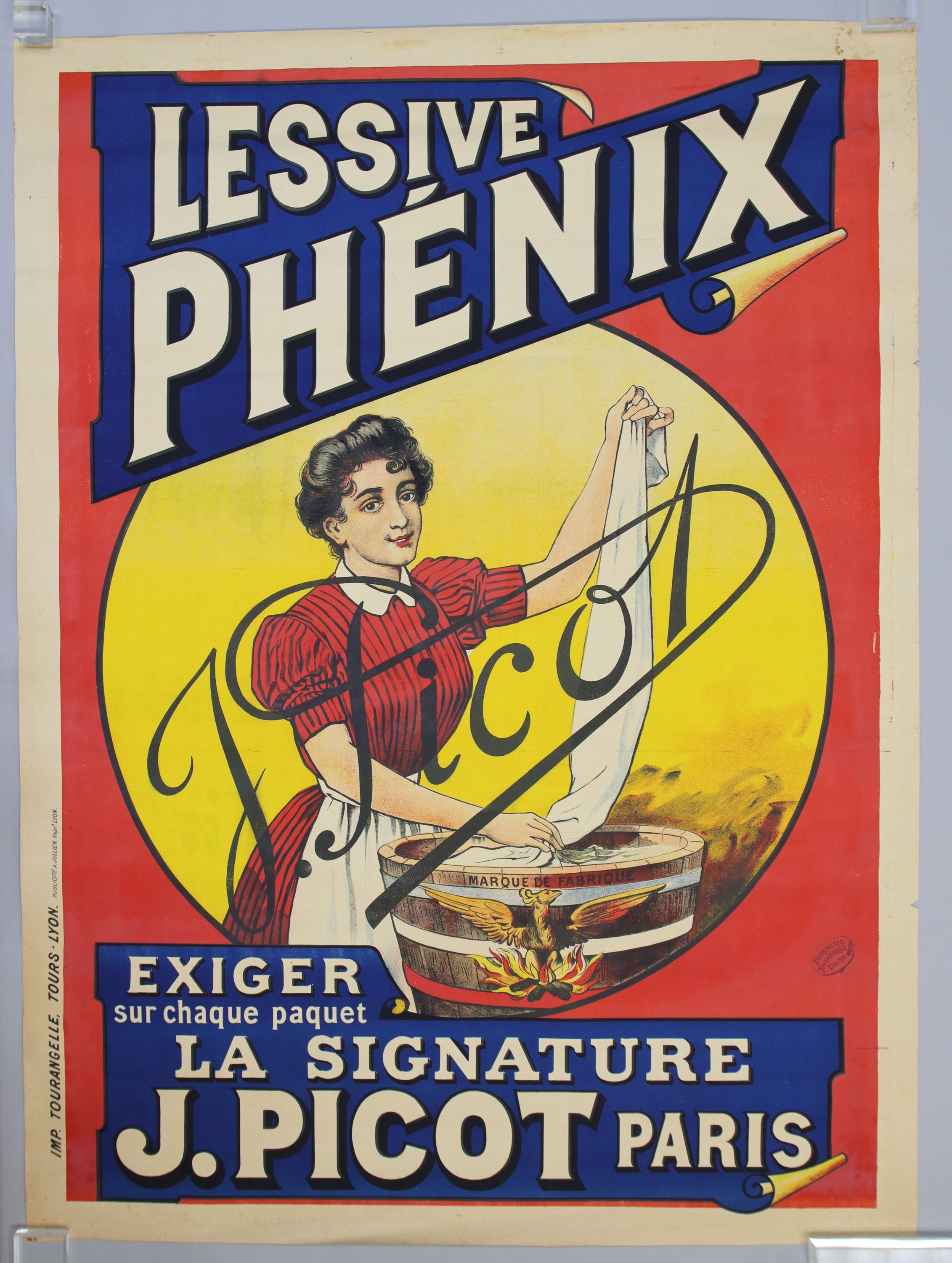 "LESSIVE PHENIX / Exiger sur chaque paquet la signature J. Picot - Paris". Vers 1920. Epreuve originale imprimée en couleurs. "Imp. Tourangelle, Tours-Lyon". Rare et bel exemplaire.
