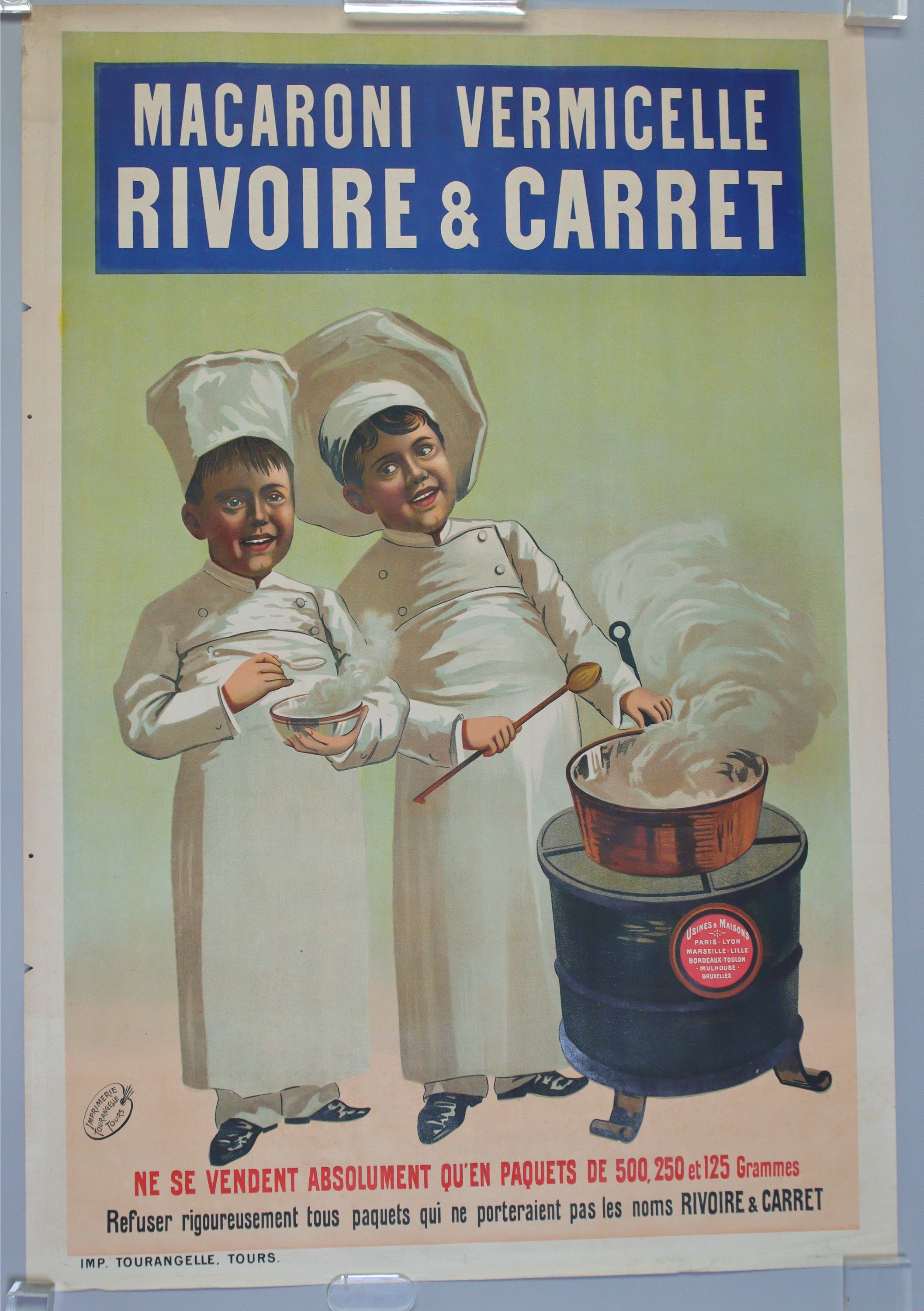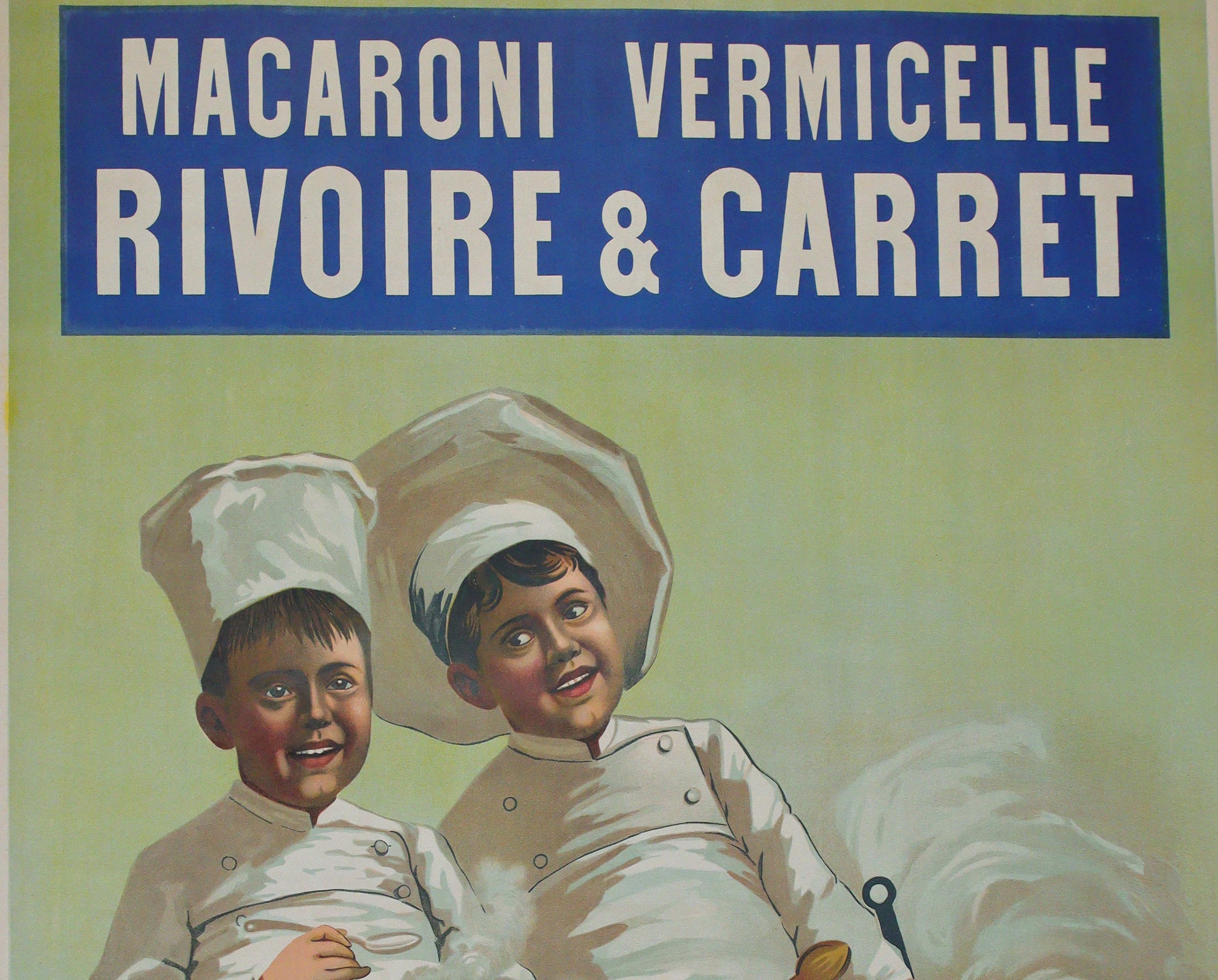 "MACARONI VERMICELLE / RIVOIRE & CARRET". Vers 1900. Epreuve originale imprimée en couleurs. "Imp. Tourangelle, Tours"