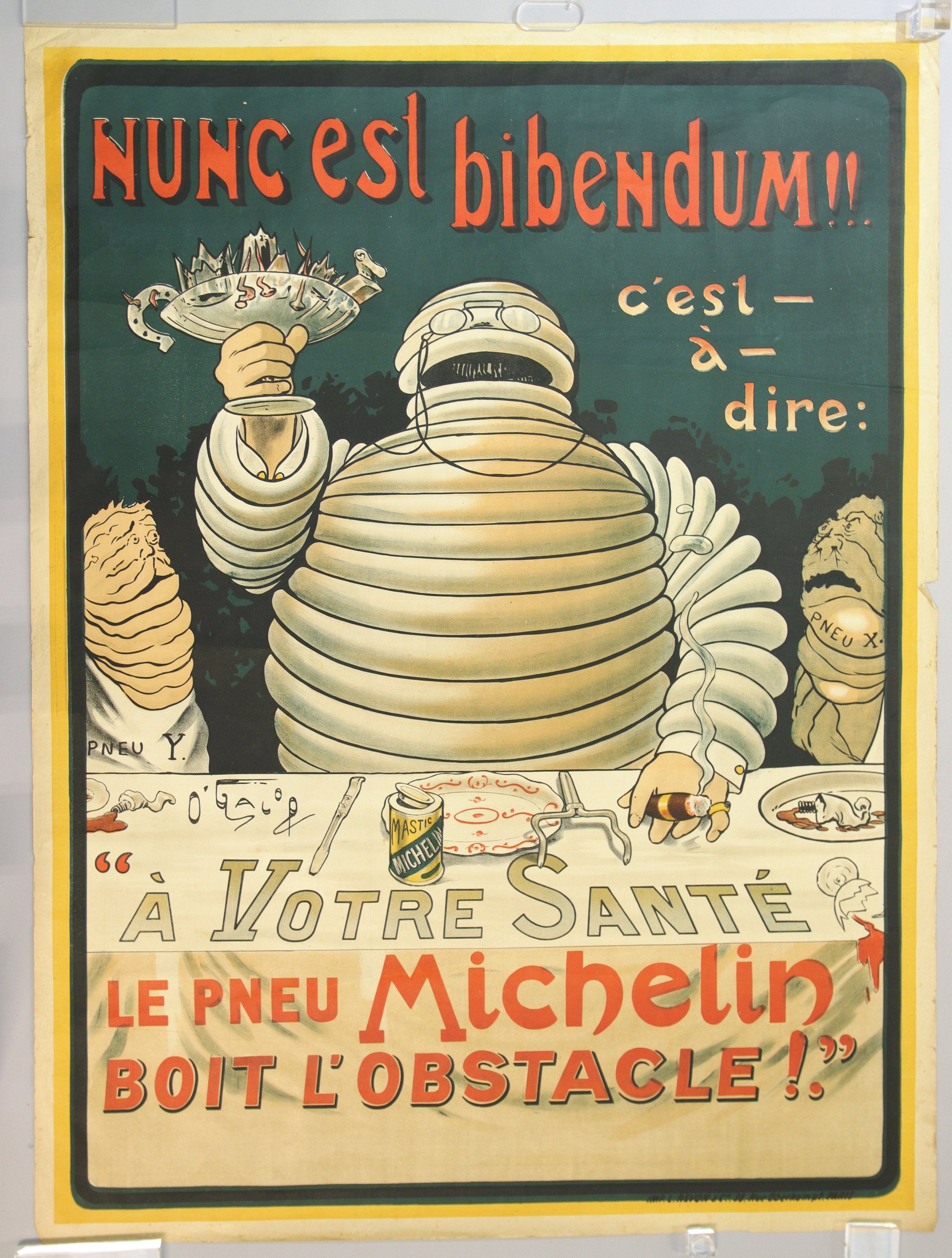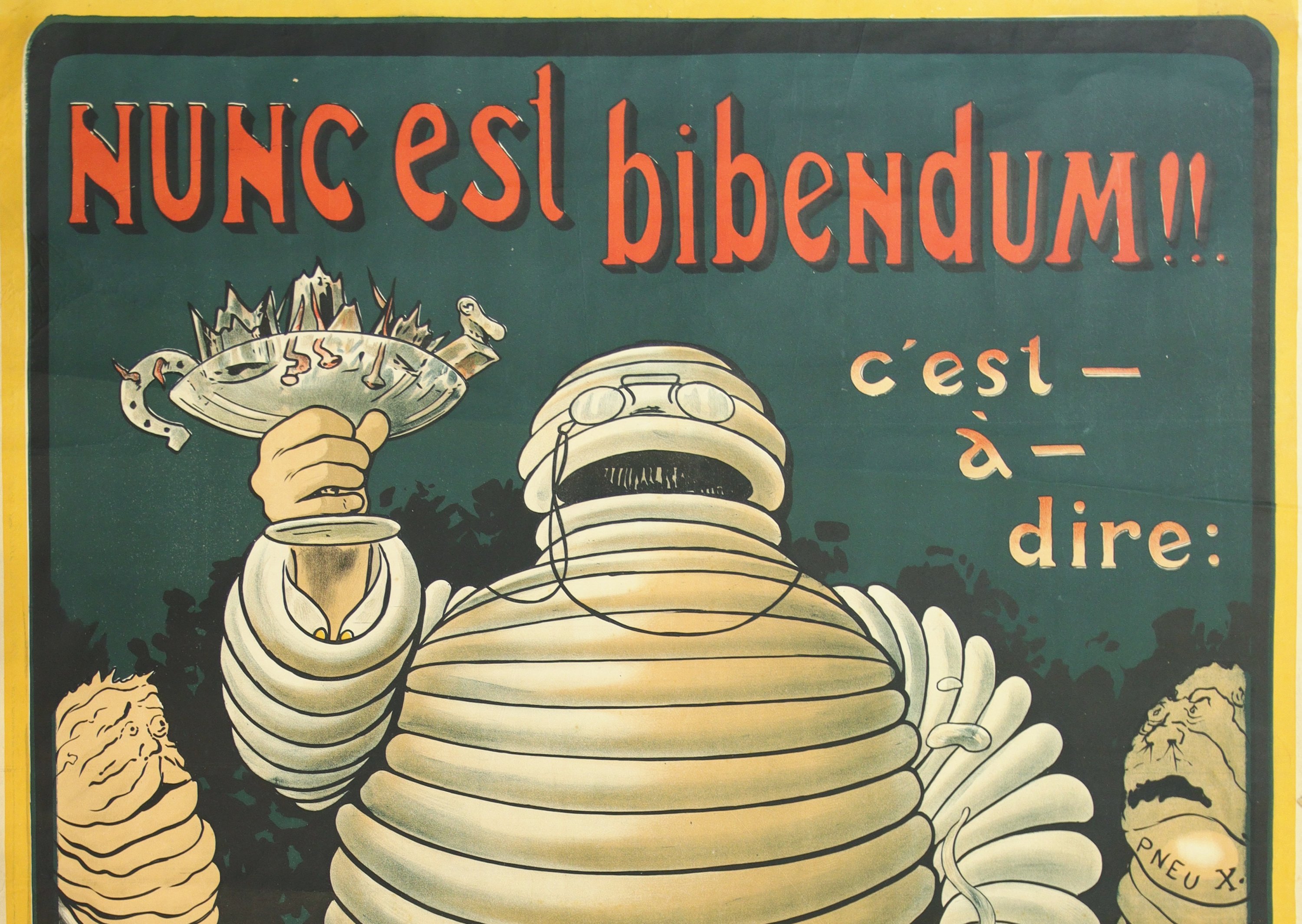 "NUNC est Bibendum !! / c'est-à-dire / "A VOTRE SANTÉ !" / LE PNEU MICHELIN "BOIT L'OBSTACLE !" Signée. c. 1898. Epreuve originale imprimée en couleurs sur fond vert "Imp. L. Revon & Cie, 93 rue Oberkampf Paris"
